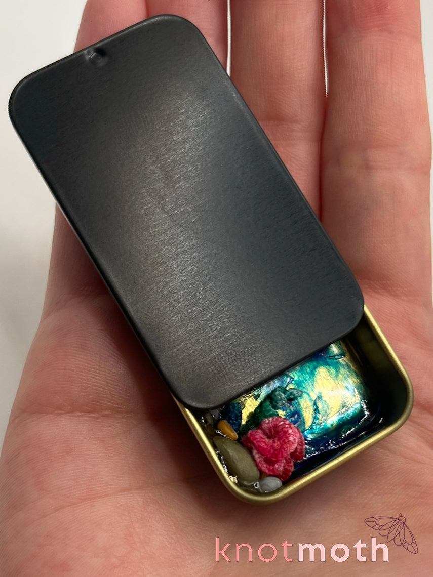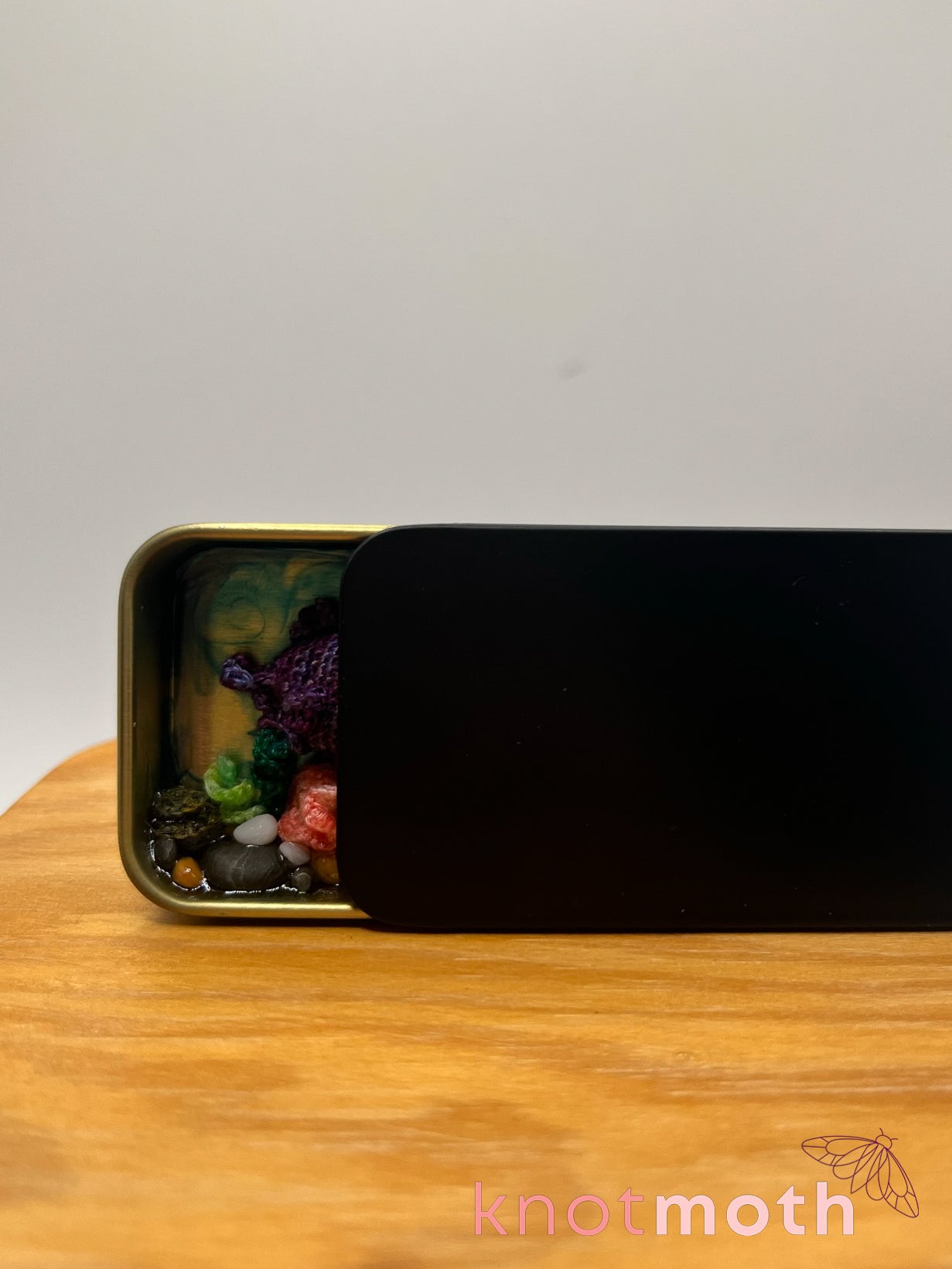 This charming micro crochet angler fish and coral trinket tin is a delightful addition to any sea lover's miniature art collection! I named the larger female anglerfish Angel and the smaller male fish Algae, but you can feel free to change the names.