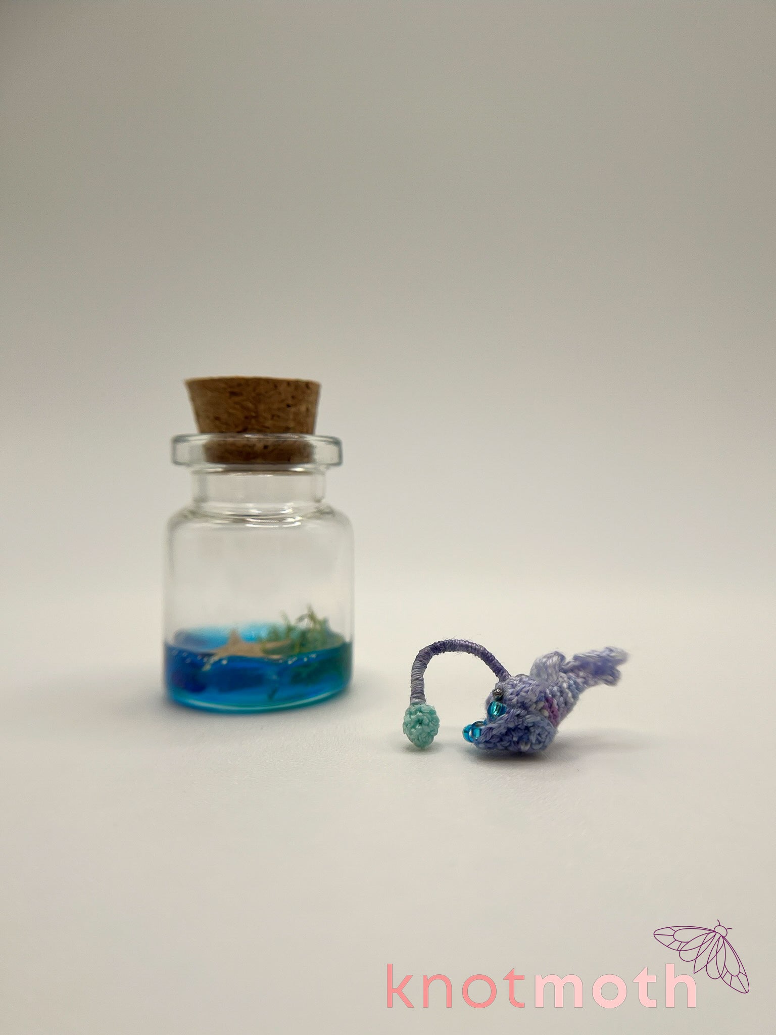 This adorable hand-stitched anglerfish was made with a 0.5 mm crochet hook and embellished with toothy bead details and a glow-in-the-dark lure. The tiny deep sea creature rests in a protective glass jar decorated with crystal chips, seashells, moss, fake grass, and dyed resin.