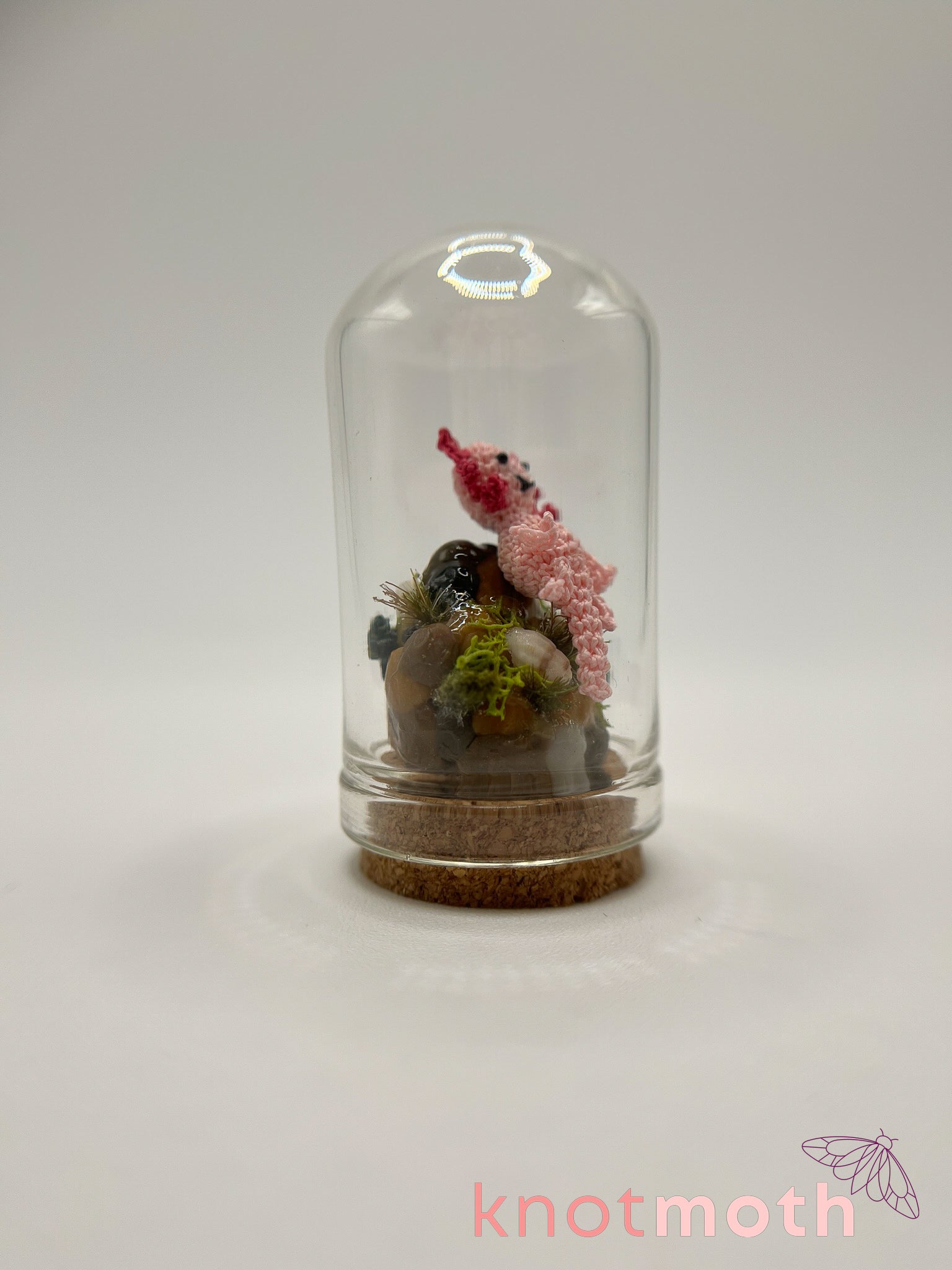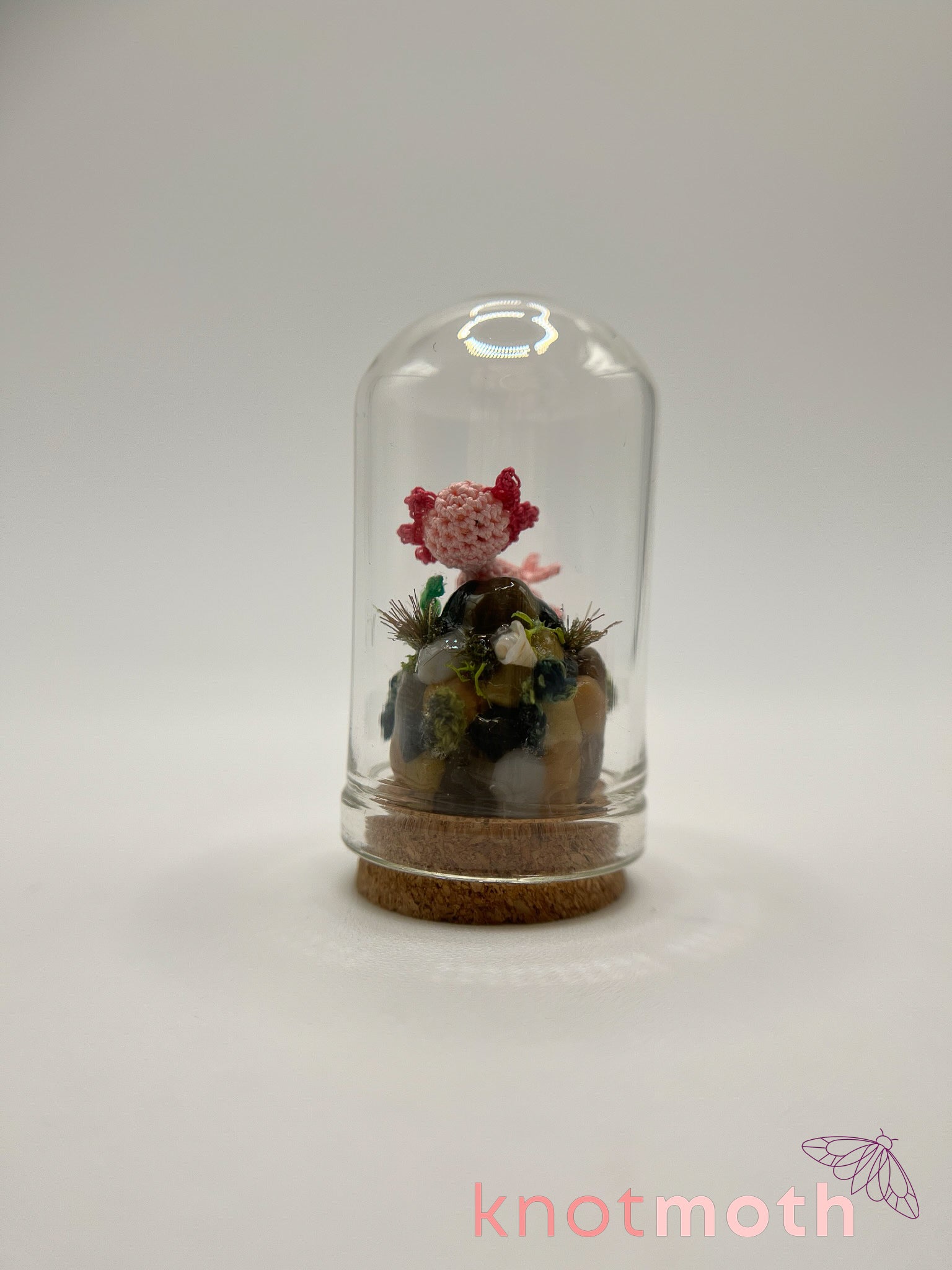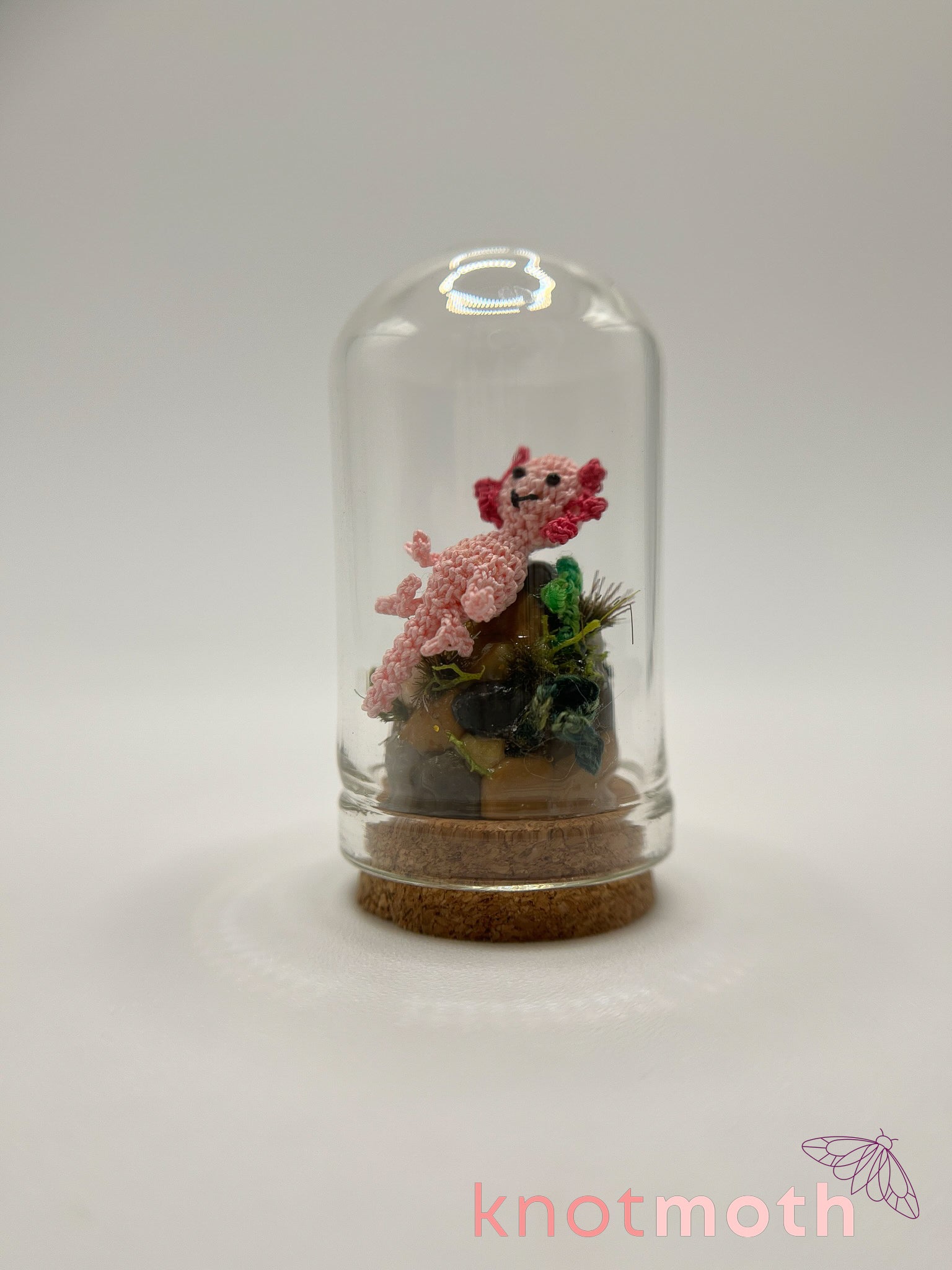 This adorable "axolittle" micro-crochet trinket was made with a 0.5 mm crochet hook and hand-dyed thread, and the tiny plush magnetically attaches to a clay base decorated with hand-stitched plants, moss, and fake grass.