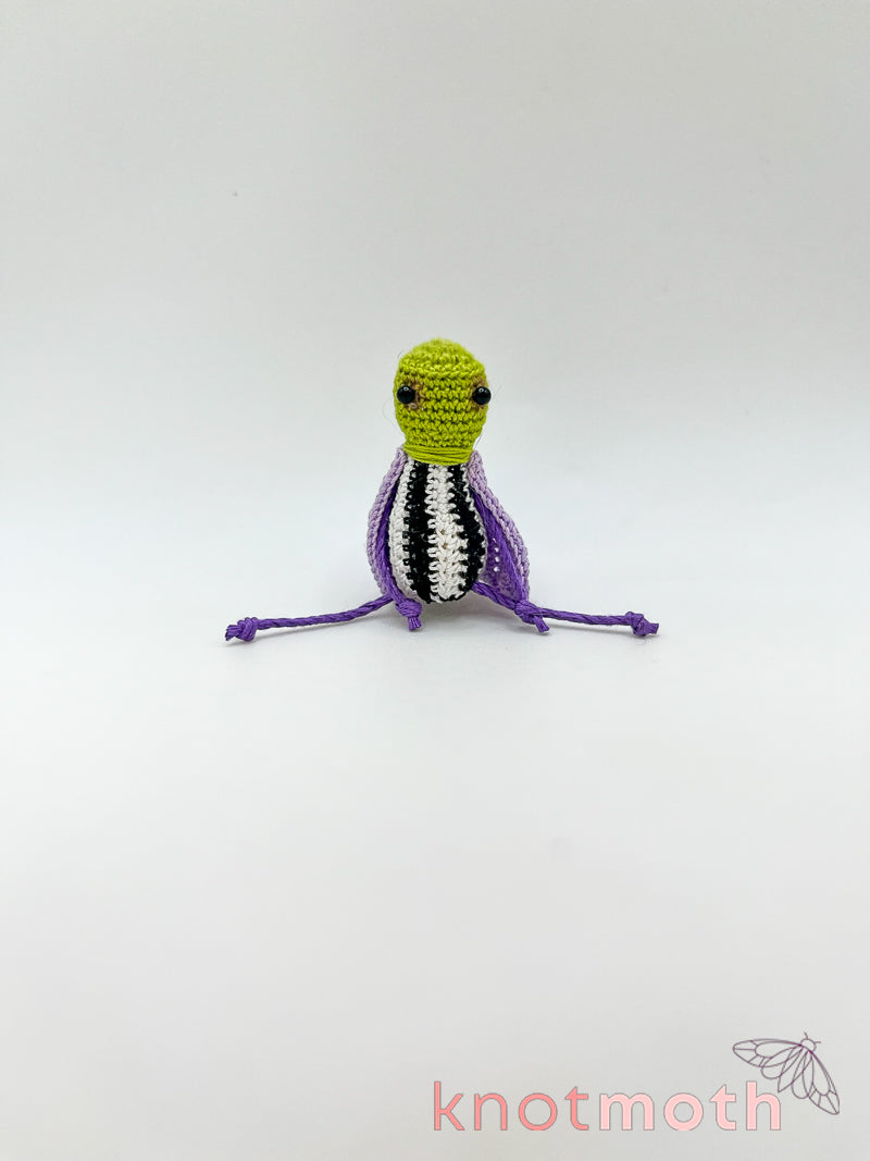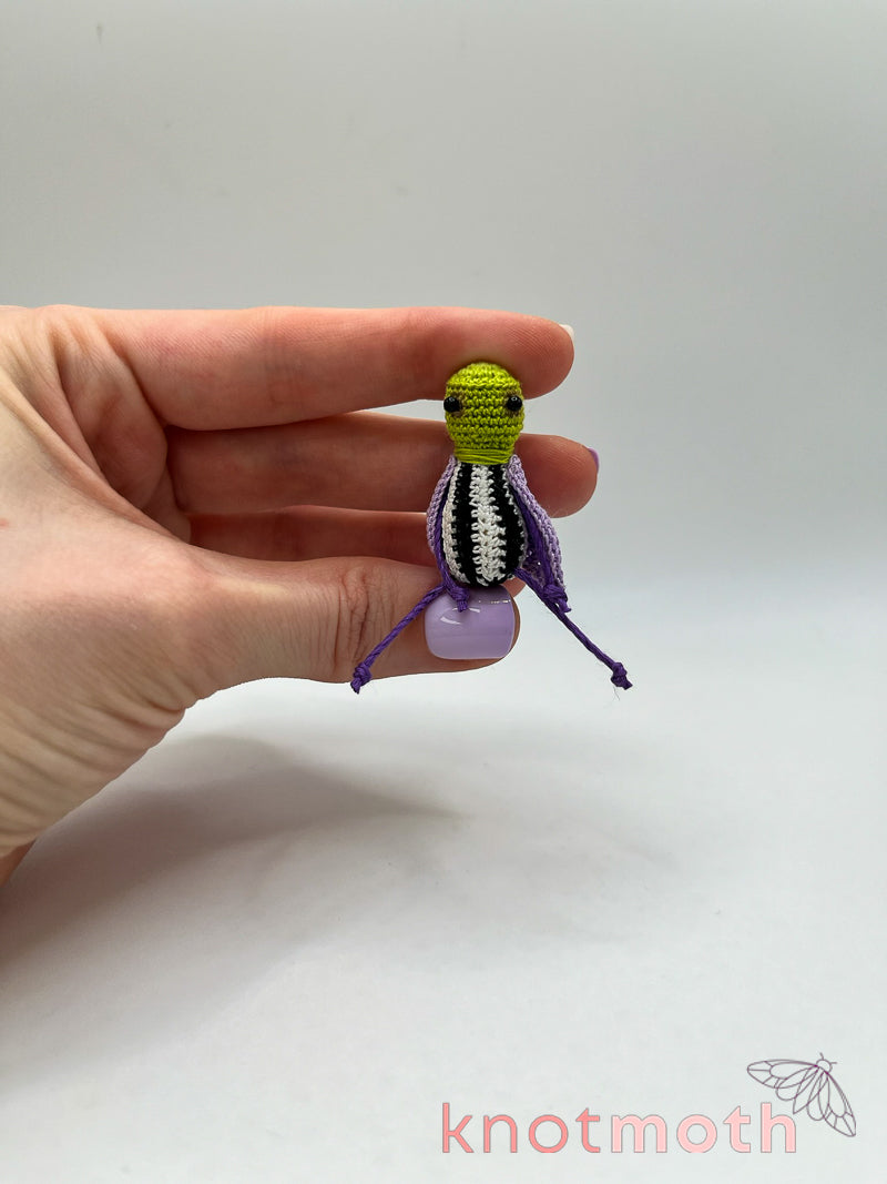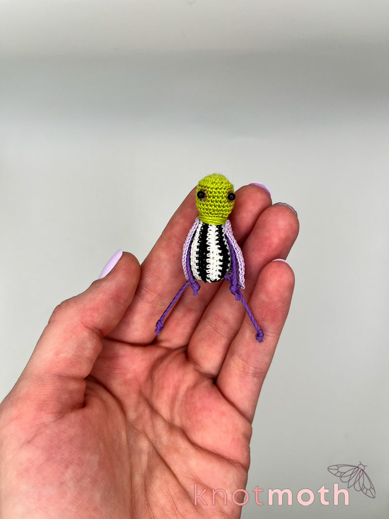 This silly micro-crochet Beetlejuice-themed beetle magnet is the perfect fun handmade gift for miniature, bug, and movie-lovers alike!