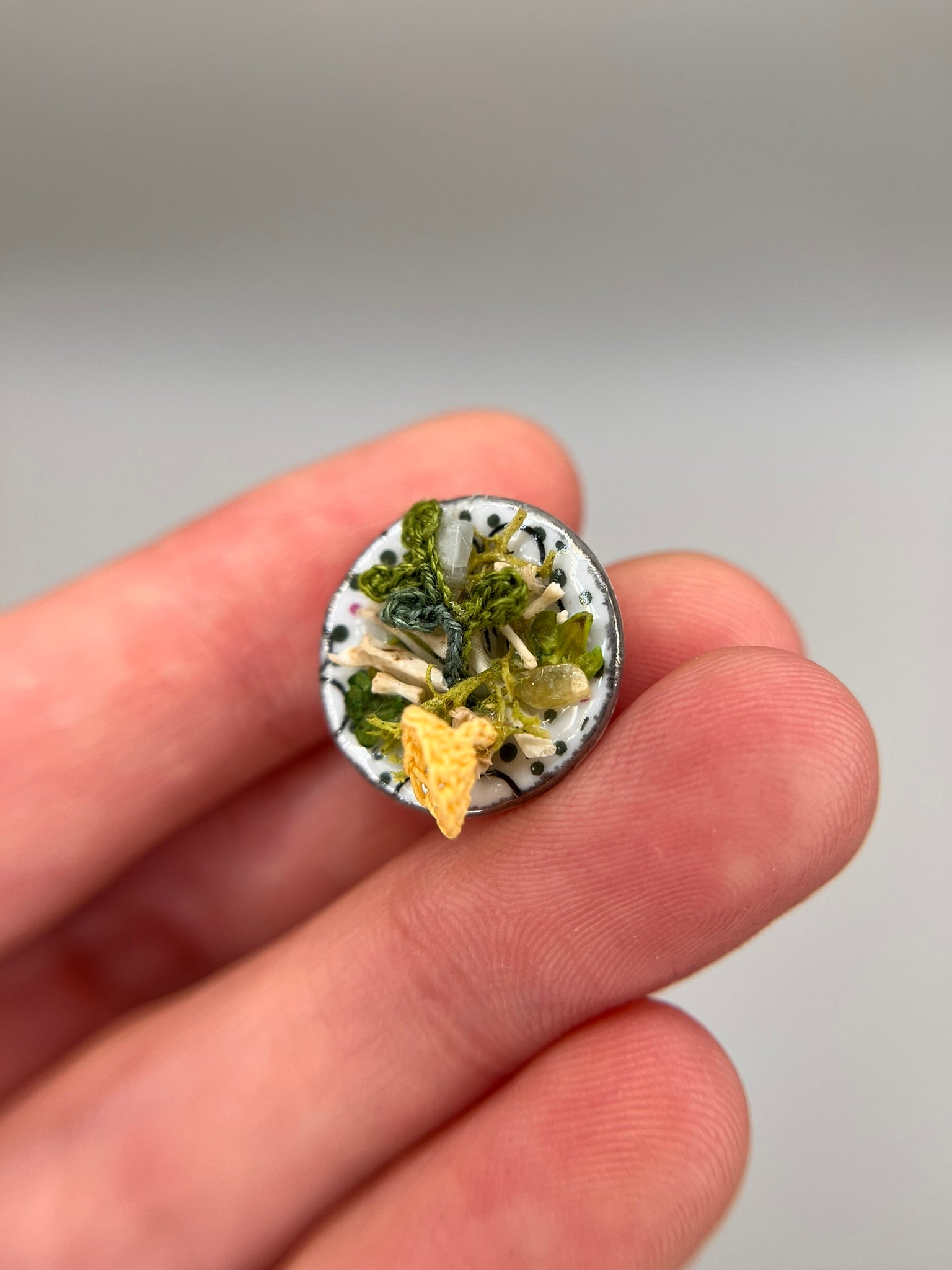 Bones harvested from owl pellets, cotton thread, crystal chips, microbead, moss, glue, miniature ceramic plate, magnet