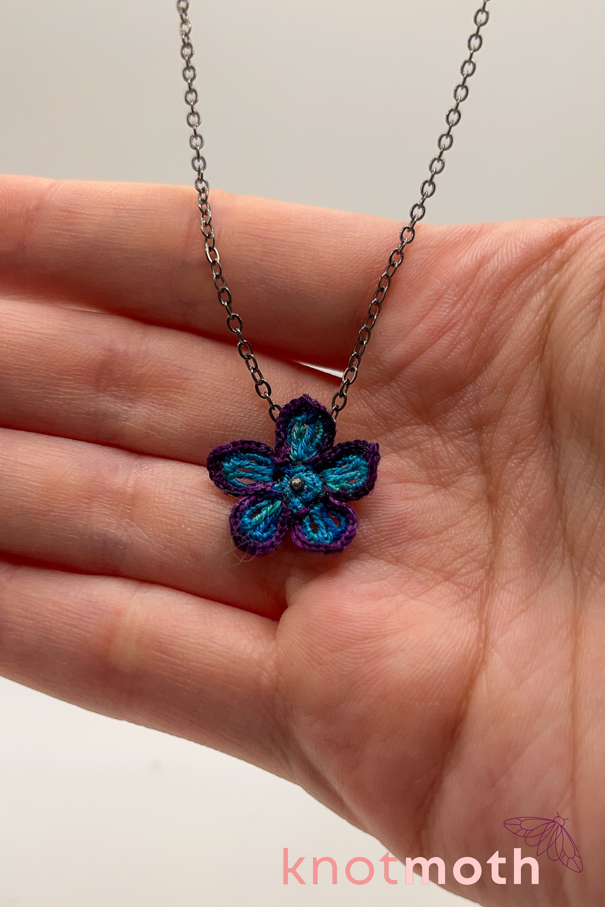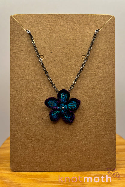 This dainty and intricately detailed micro-crochet flower necklace is the perfect accessory to show off your love of handmade botanical art! The tiny 5-petaled flower was made with blue and purple thread and a 0.5 mm crochet hook and is connected to an 18-inch necklace with a gunmetal color.
