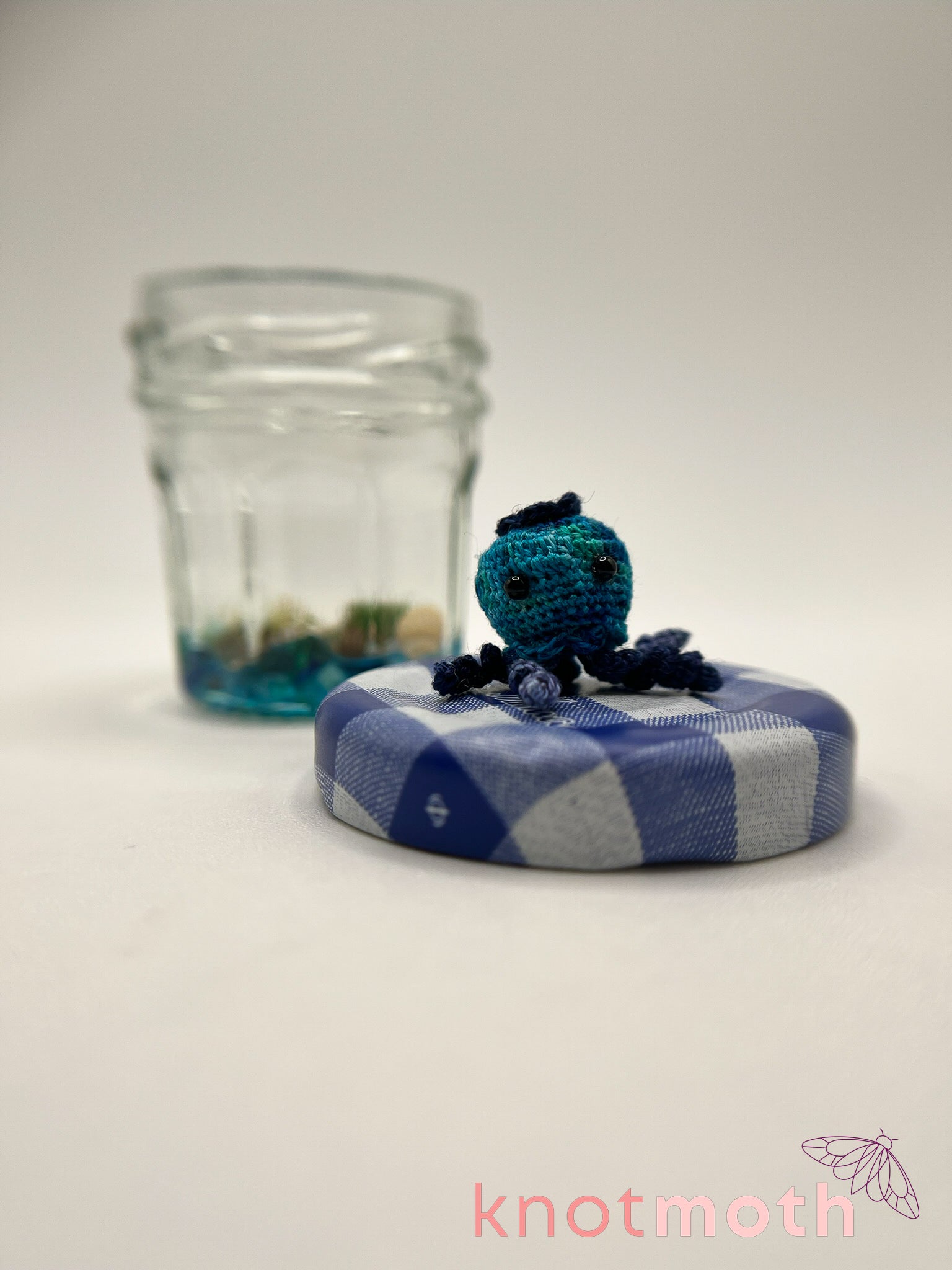 You can take the tiny amigurumi jellyfish out of the jar to admire the hand-stitched details and the hidden magnet lets you stick the plushie to the jar's metal lid, creating the illusion that the jellyfish is swimming!