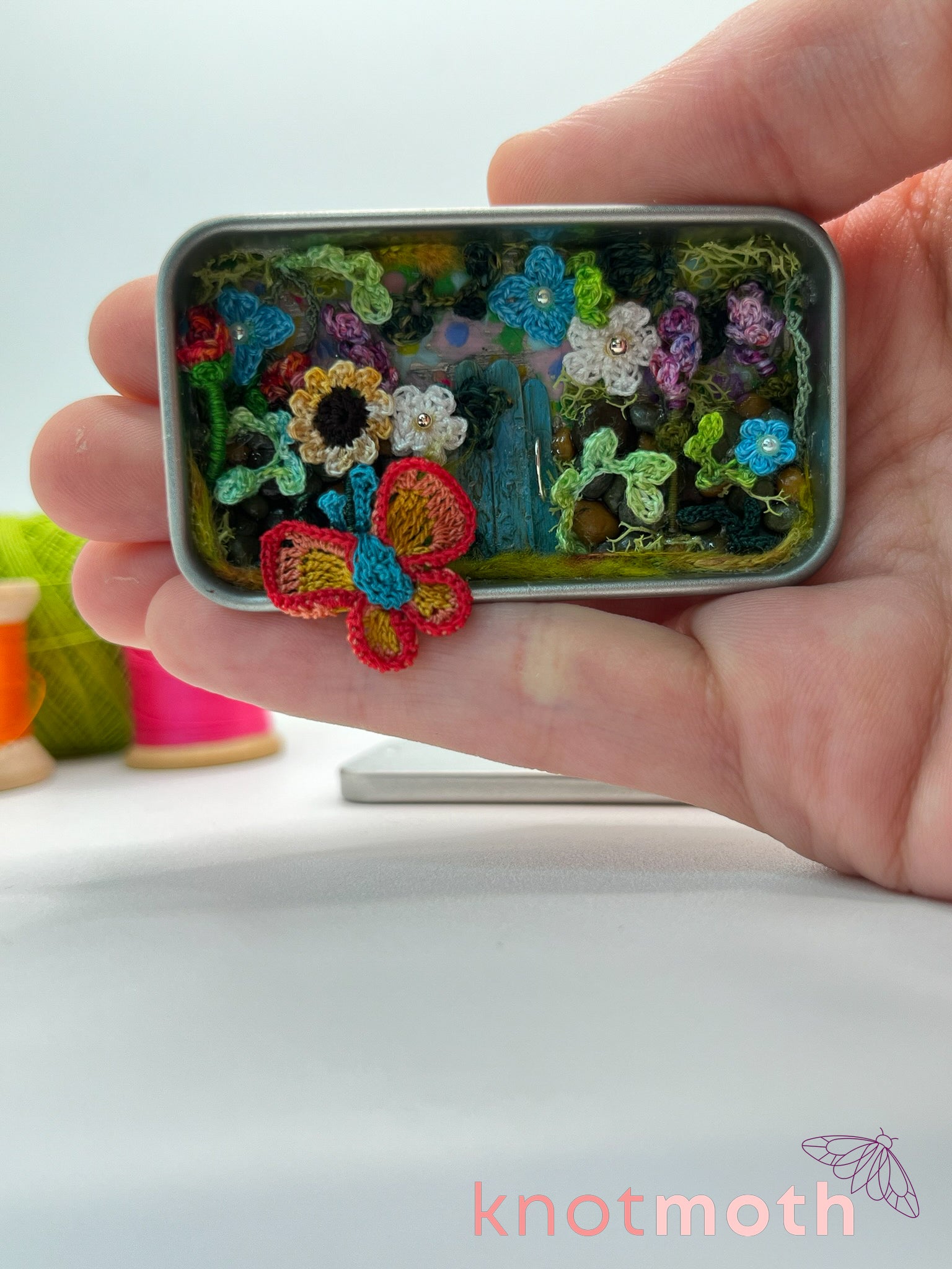 The tiny silver tin is filled with amazingly small details including hand-stitched crocheted flowers and plants, a wooden gate painted blue, a hand-molded stone fence, moss, and a hand-painted flower backdrop!
