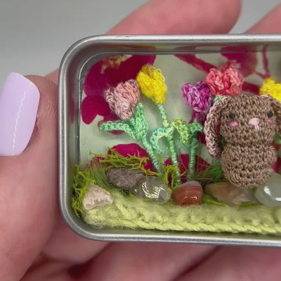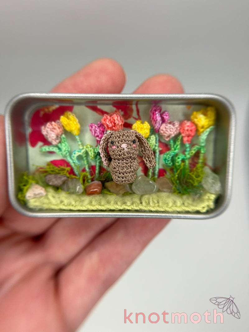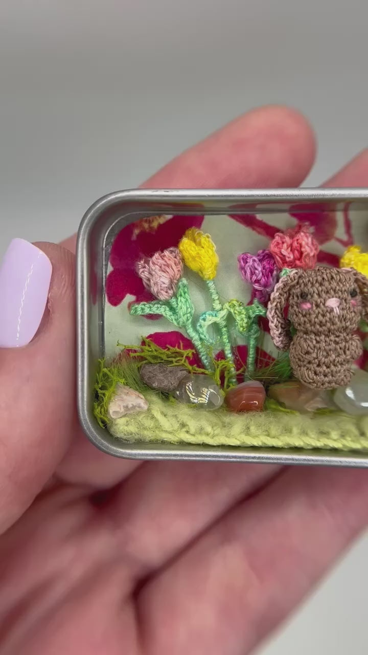 This charming and intricately detailed micro-crochet bunny and tulips scene inside a miniature metal tin will make you smile every time you slide off the tin's lid to take a peek, and it's small enough to carry inside your pocket!
