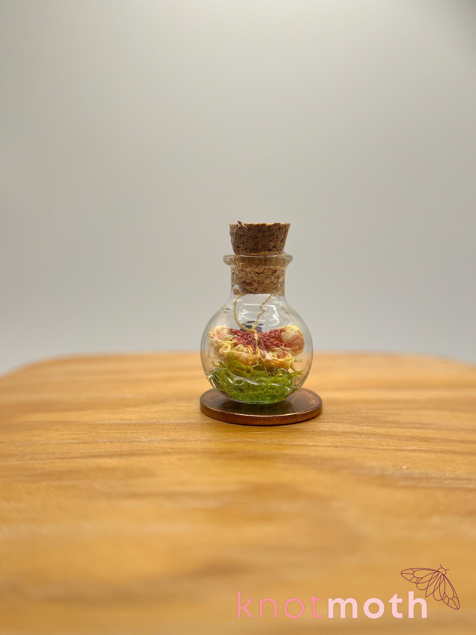 This dainty and intricately detailed micro-crochet butterfly terrarium jar is the perfect accessory to show off your love of whimsical botanical art! The micro-plushie is made with hand-dyed thread and a 0.5 mm crochet hook and the protective dust cover is decorated with moss and dried flowers.