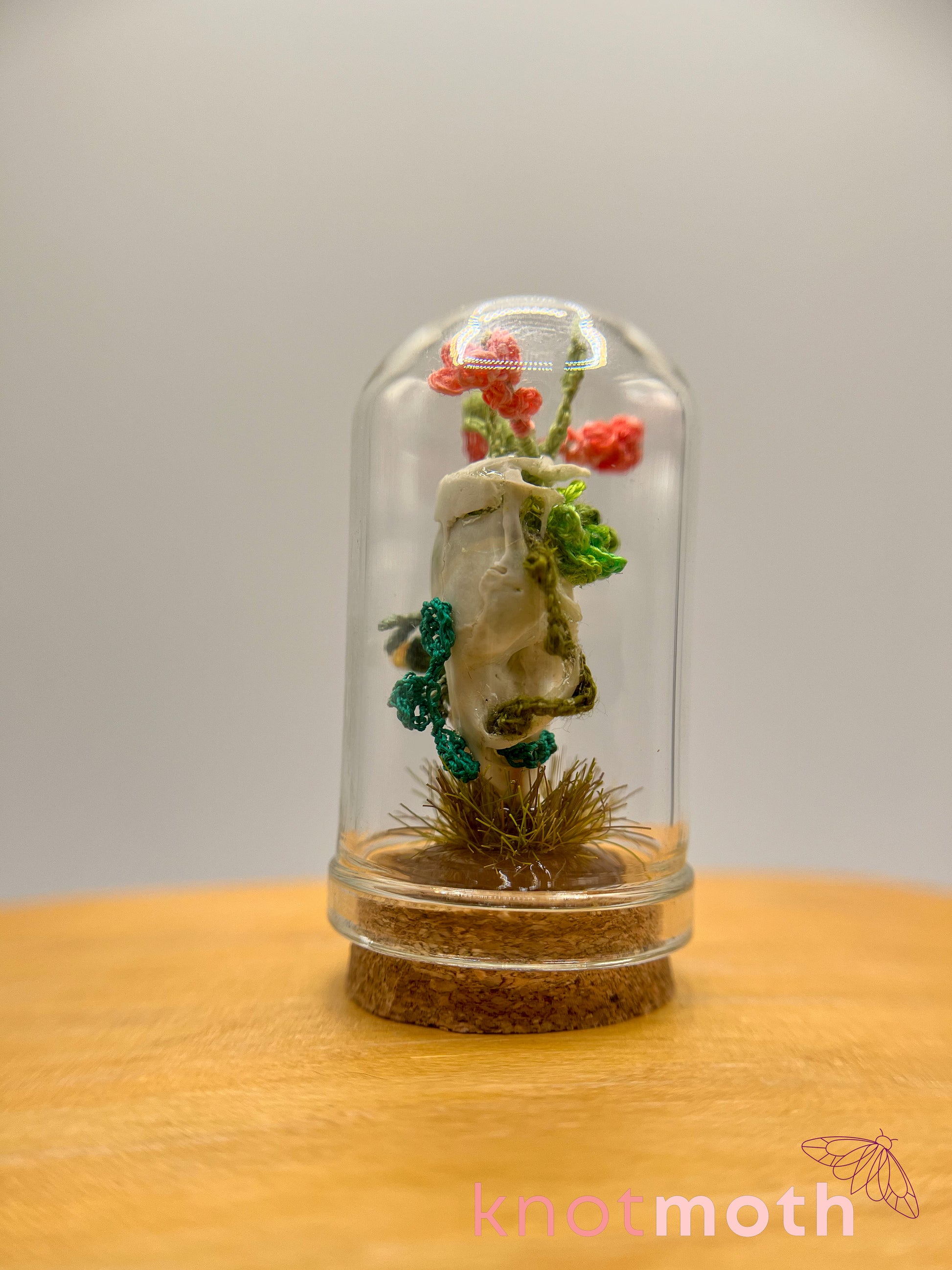 This beautifully macabre cloche jar features handmade micro-crochet cacti, flowers, succulents, and vines "growing" from a tiny ethically sourced skull dissected from owl pellets.