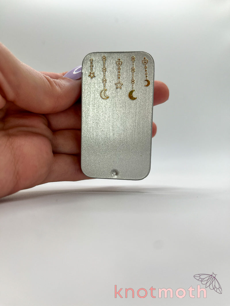 The tiny silver tin is filled with unbelievably small details including hand-stitched crocheted flowers, glow-in-the-dark stars, and a crescent moon that connects magnetically to the galaxy-themed backdrop.