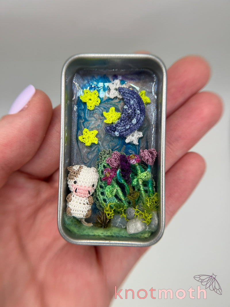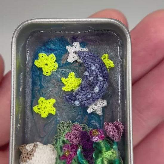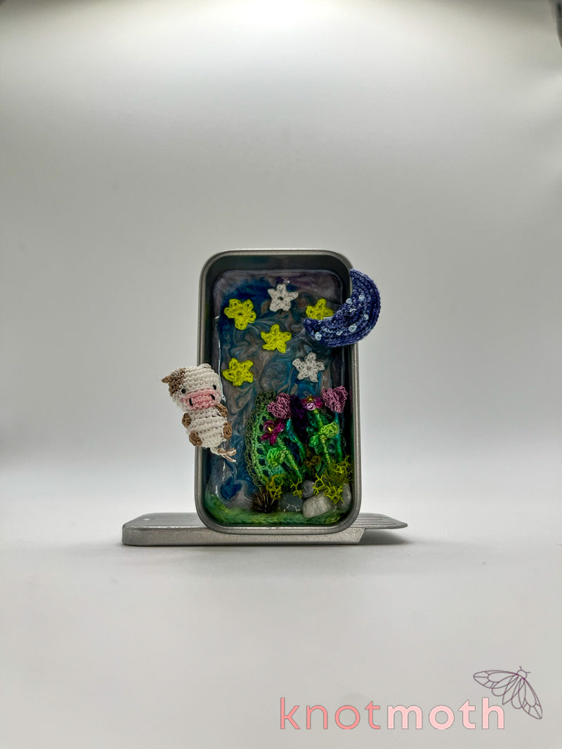 This charming and intricately detailed micro-crochet cow & flowers nighttime scene inside a miniature metal tin will make you smile every time you slide off the tin's lid to take a peek, and it's small enough to carry inside your pocket!