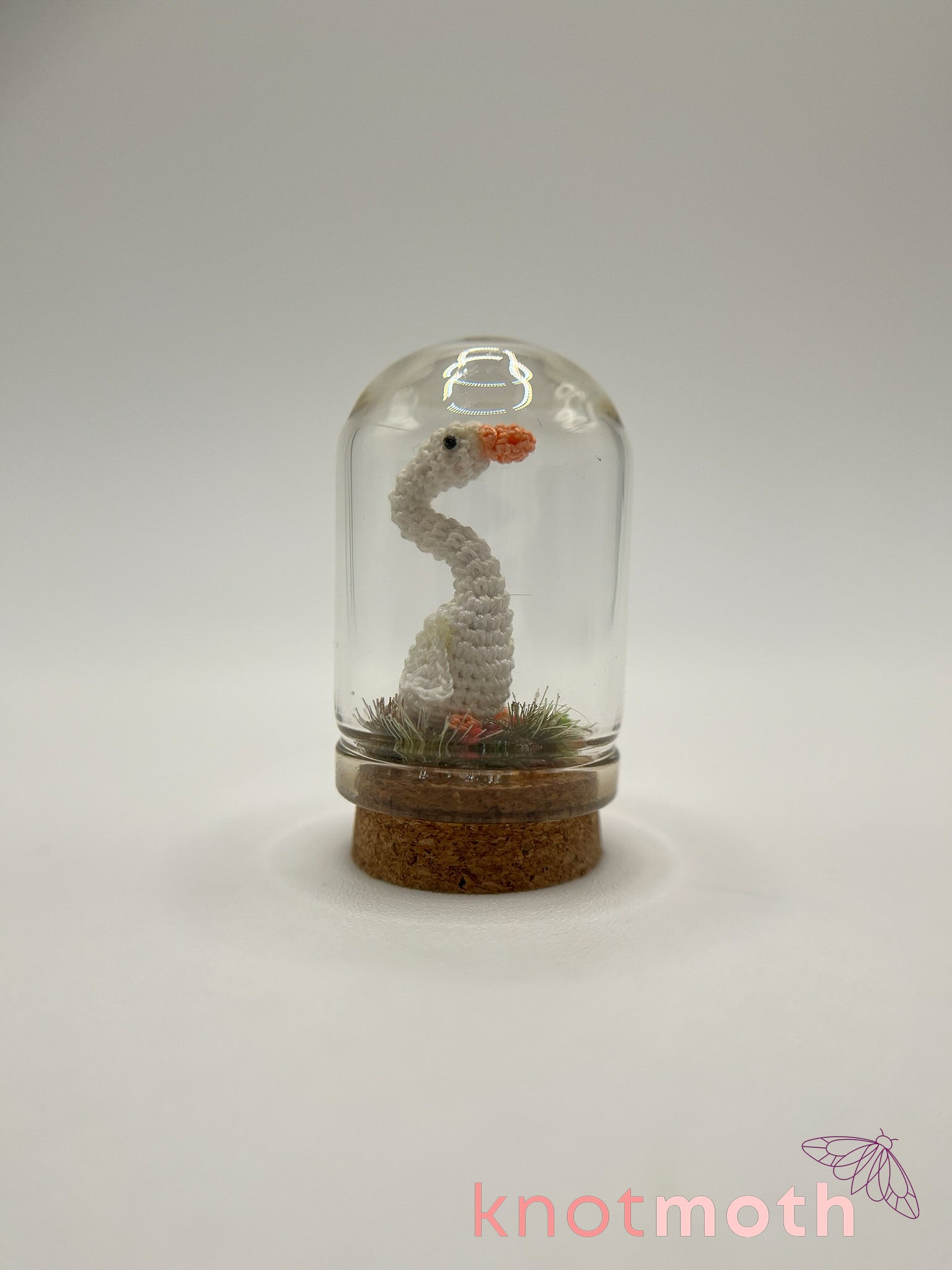 This adorable micro-goose is made with thread and a 0.5 mm crochet hook and magnetically attaches to a glass cloche jar decorated with fake grass and dried flowers.