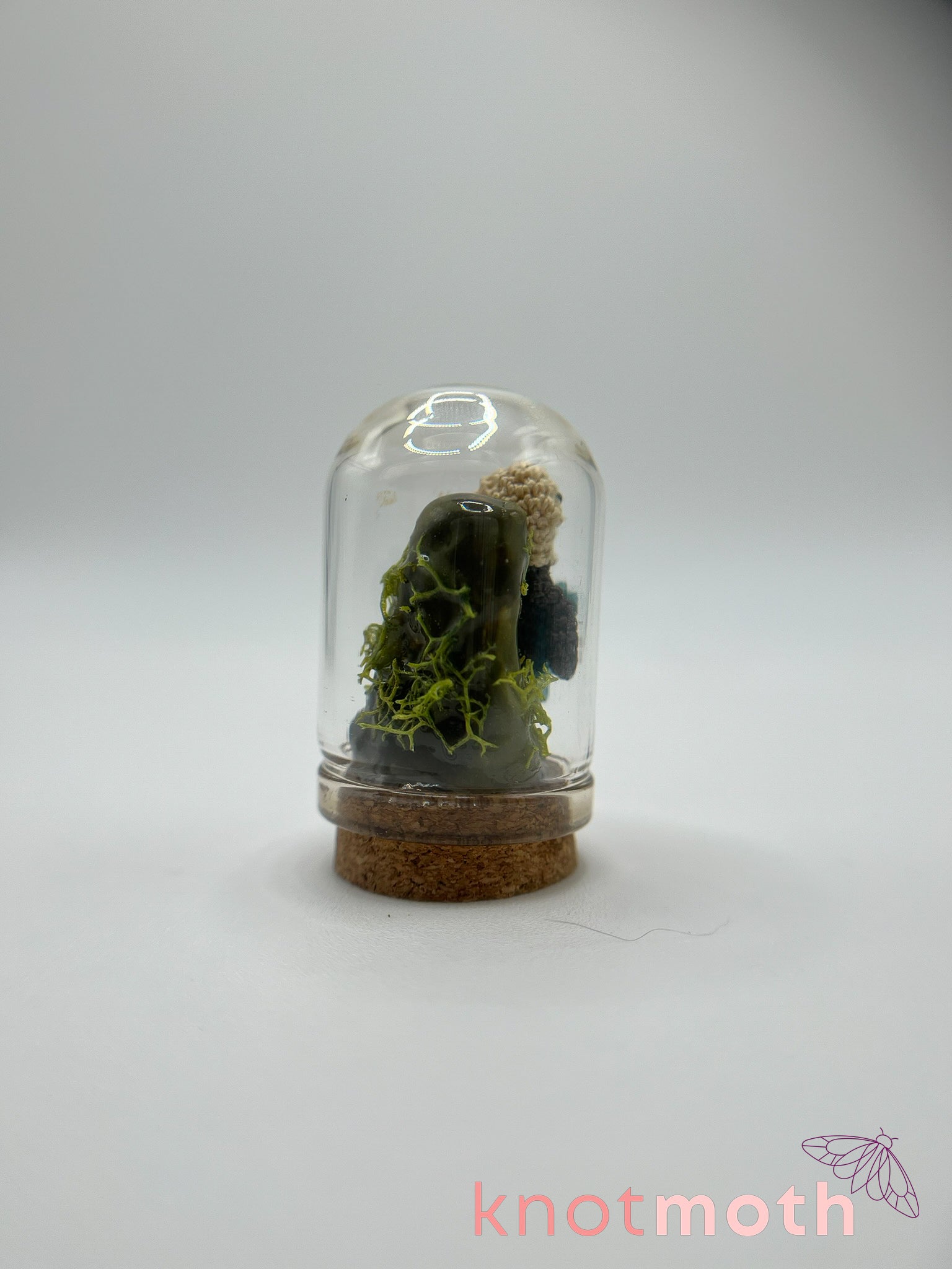 thread, microbeads, magnets, clay, moss, resin, glass jar, and cork