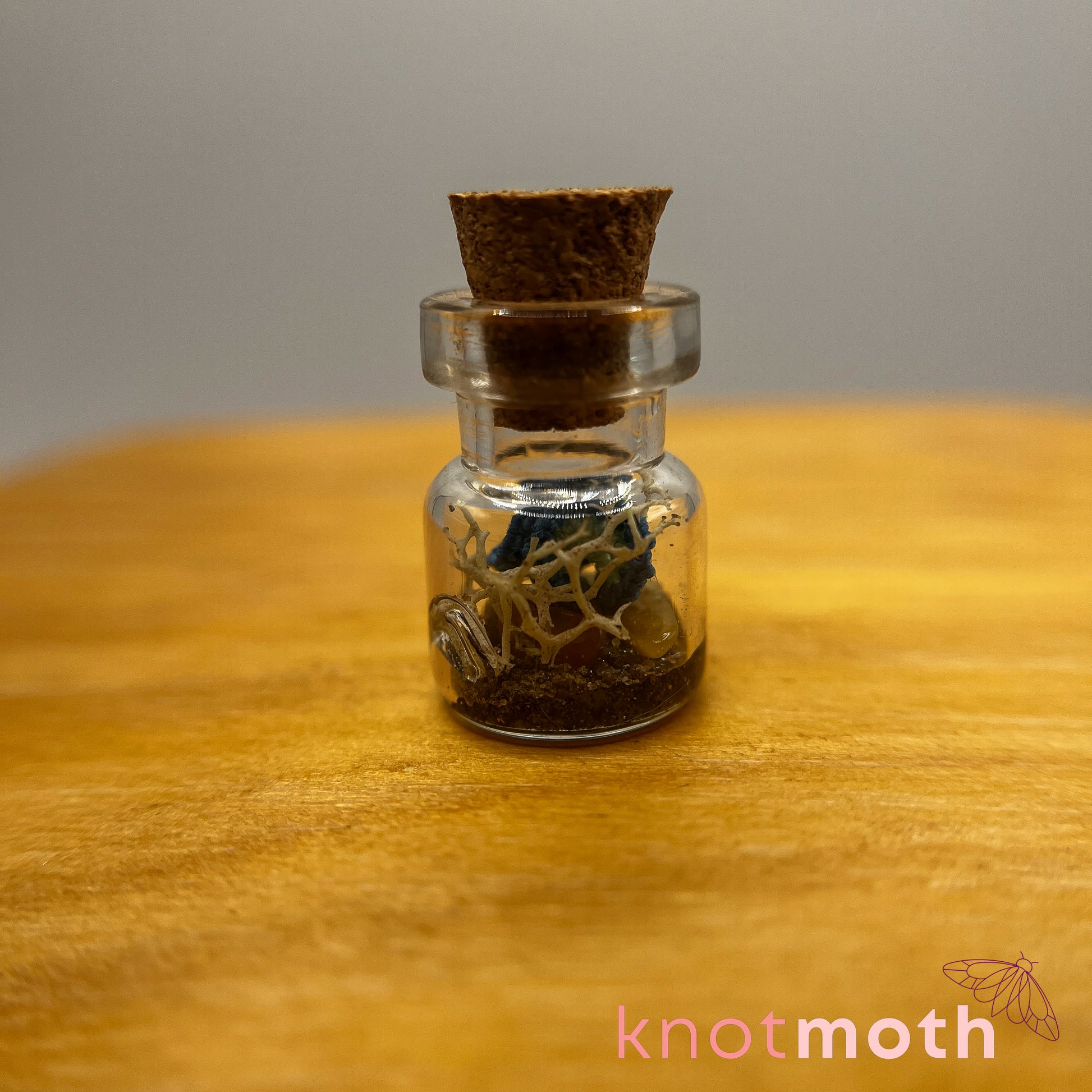 Cotton thread, crystal chips, moss, sand, glass jar with cork, resin glue; optional metal hardware