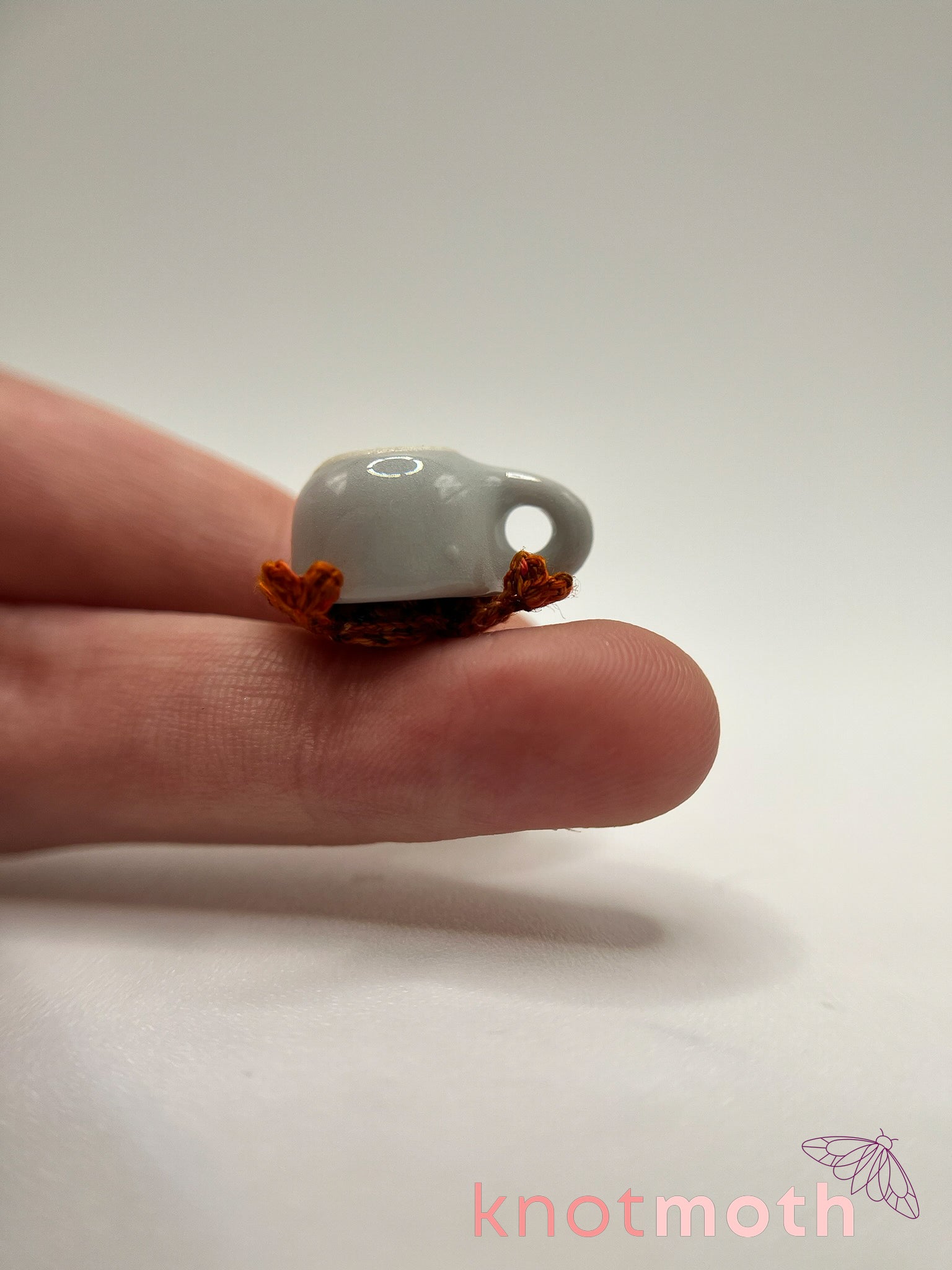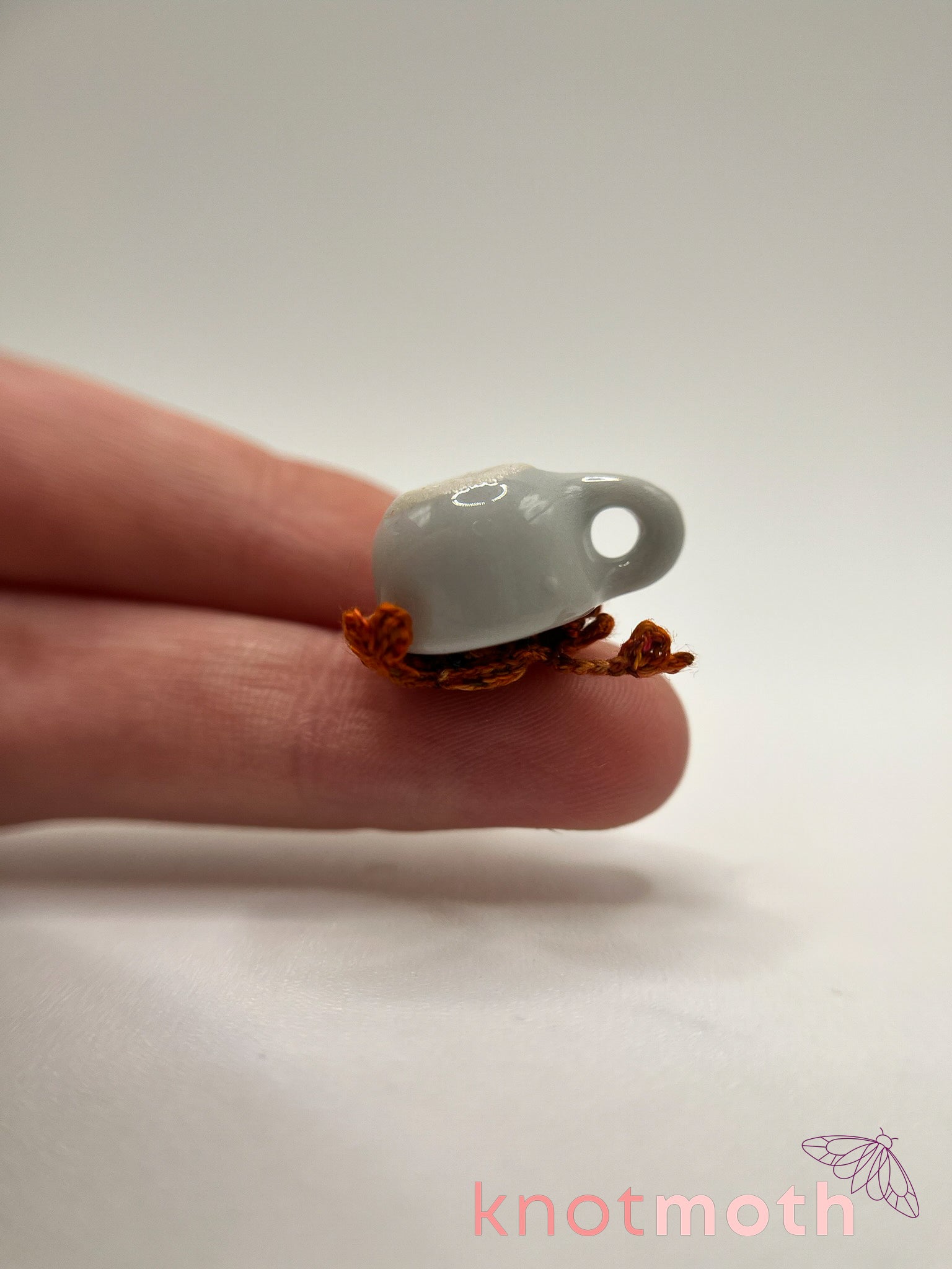 This adorable micro-crochet hermit crab was made with a 0.5 mm crochet hook and hand-dyed thread and magnetically snaps to a tiny ceramic mug.