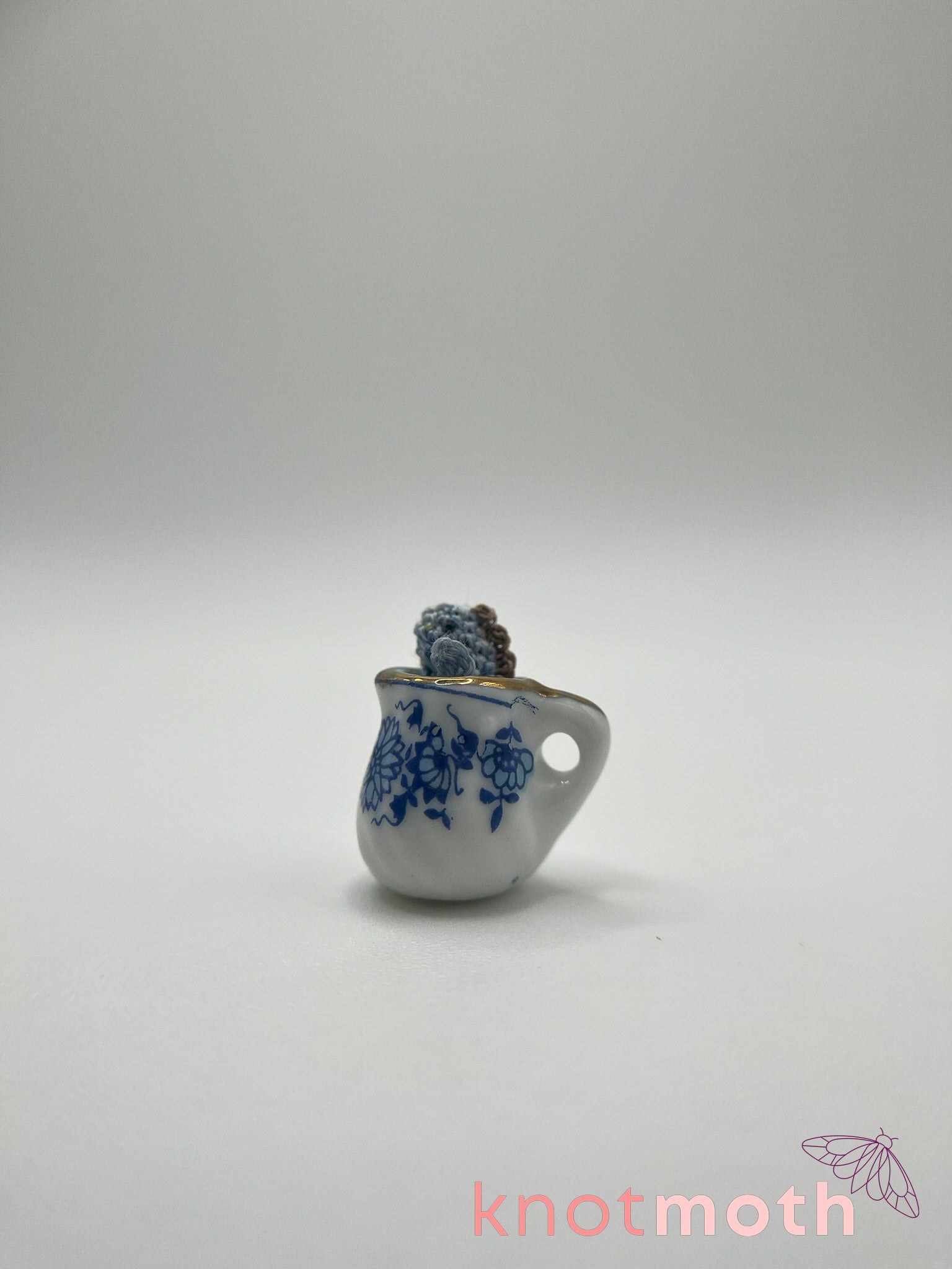 This cute tea-themed micro crochet tea-rex mug was made with a 0.5 mm crochet hook and hand-dyed thread and magnetically snaps to a miniature ceramic mug.