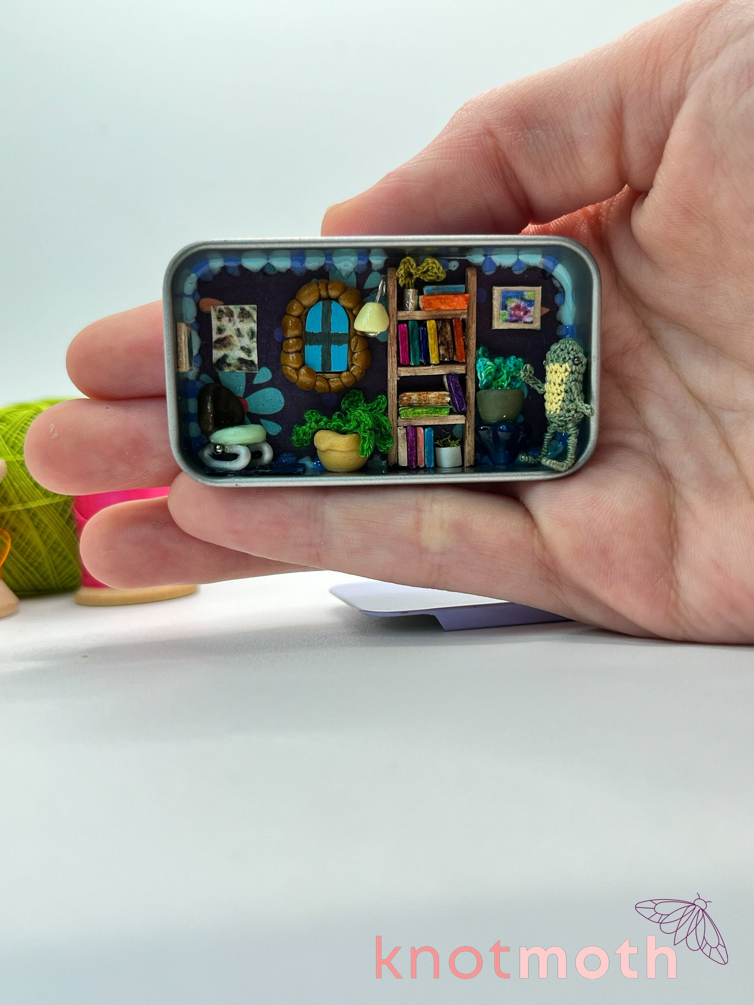 The tiny light purple tin is filled with amazingly small details including several hand-stitched crocheted plants, a wooden bookshelf filled with colorful books, a hand-molded clay and wire chair, a mini lamp, frog-themed art, and a tiny window with a stone frame!