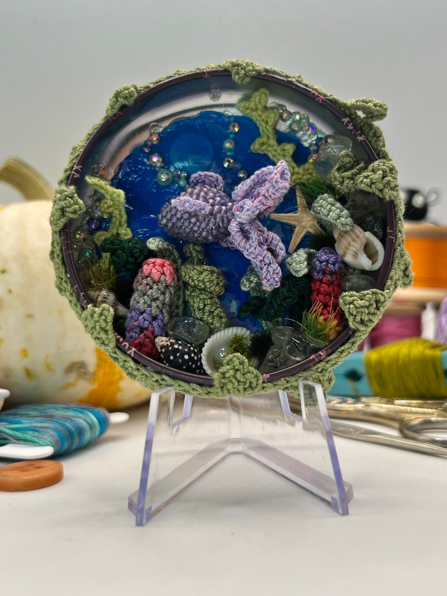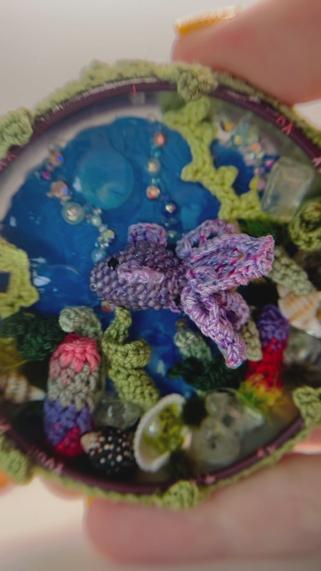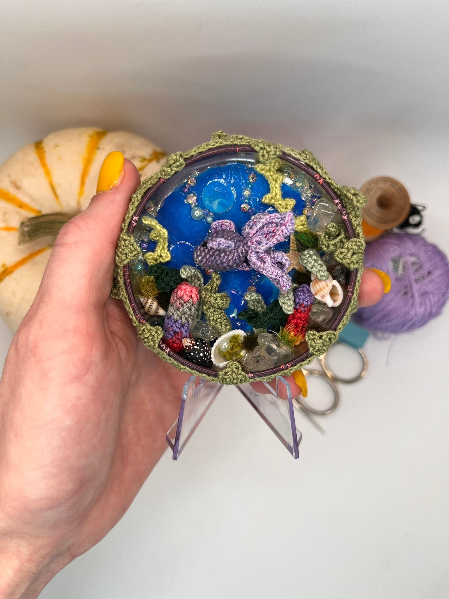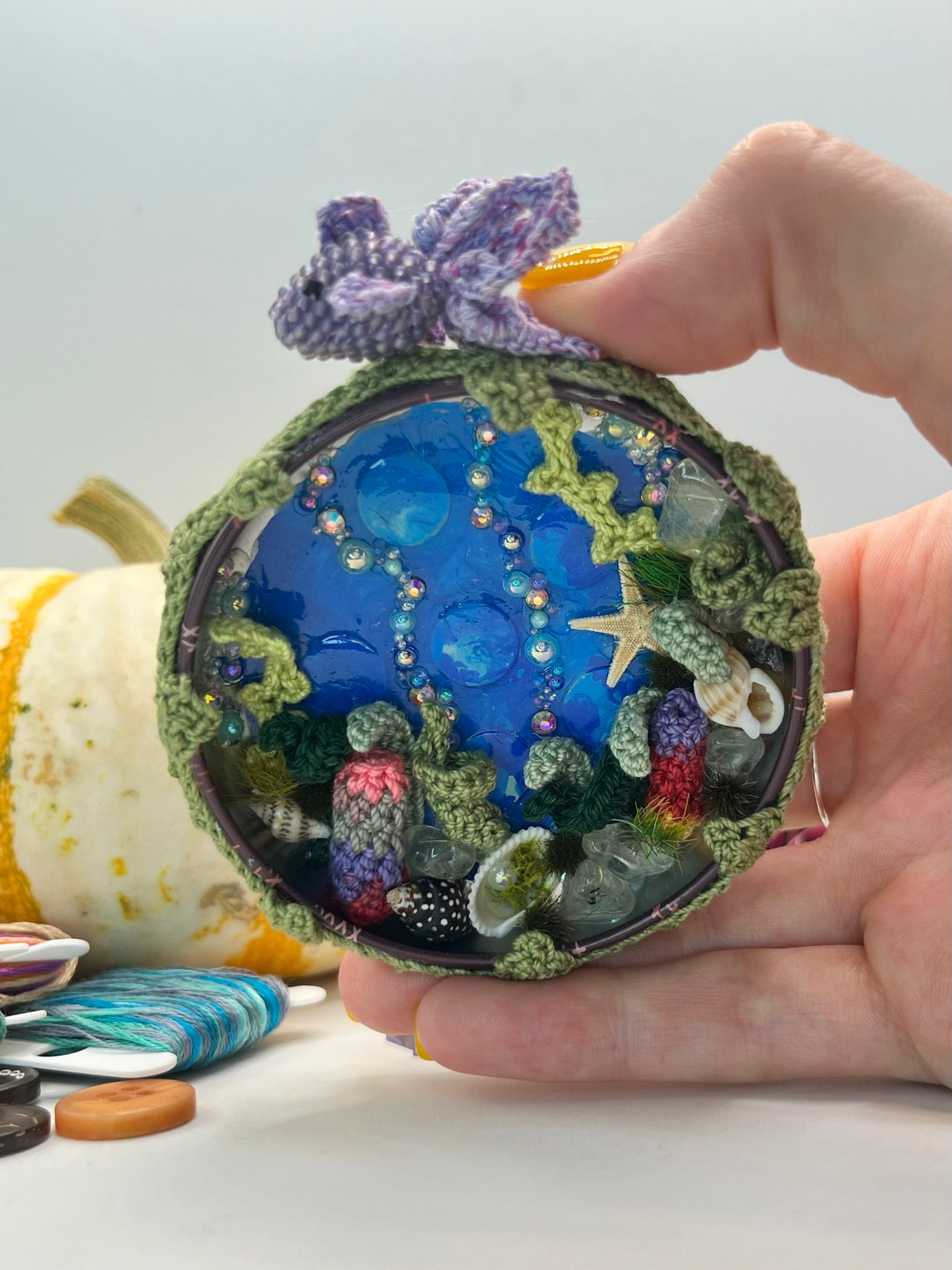 The miniature metal tin is filled with unbelievably small details including crocheted coral, plants, and seaweed, a sparkly "bubble" backdrop, and details like crystal chips, moss, and grass tufts that create a natural and realistic effect.