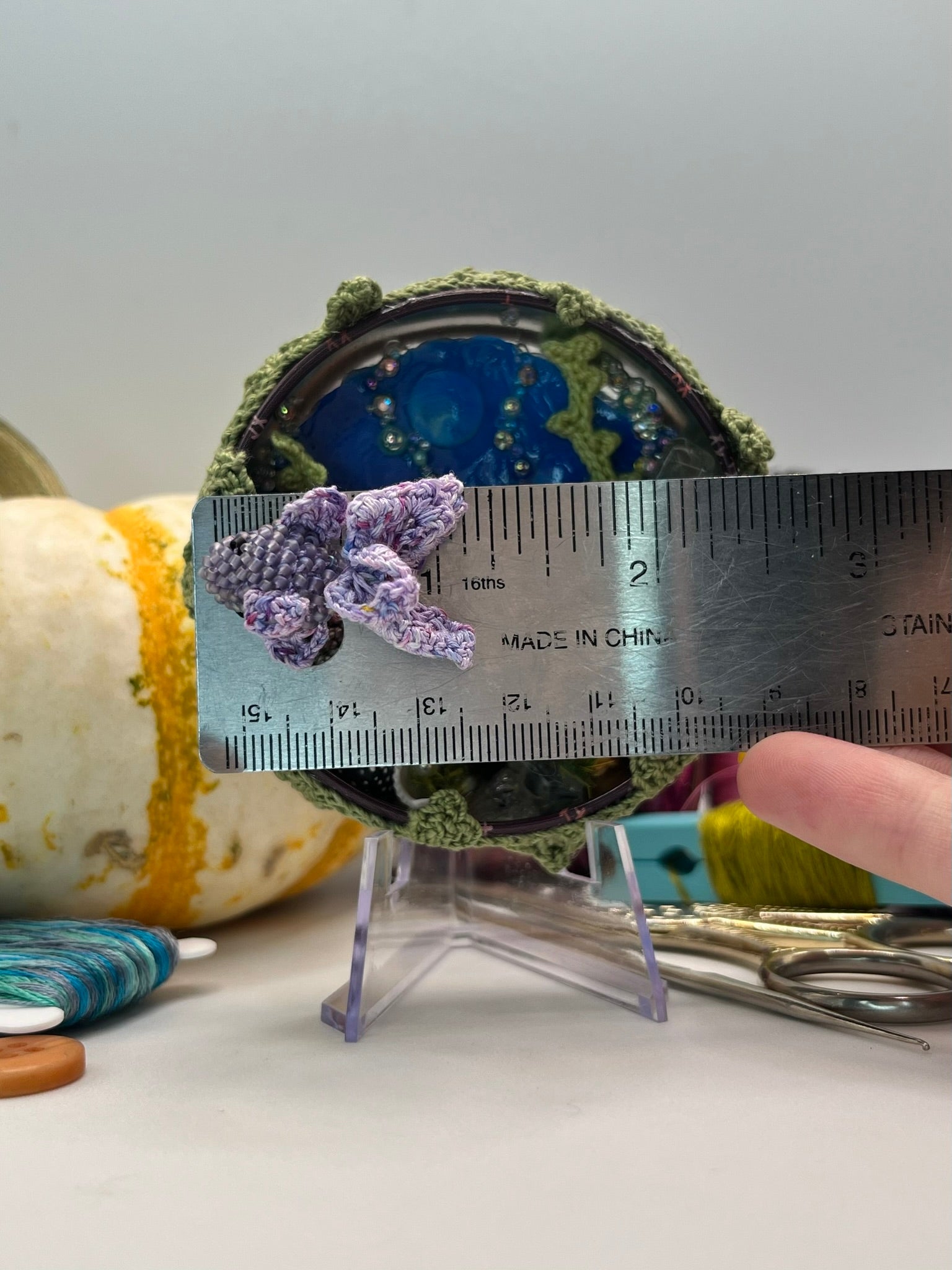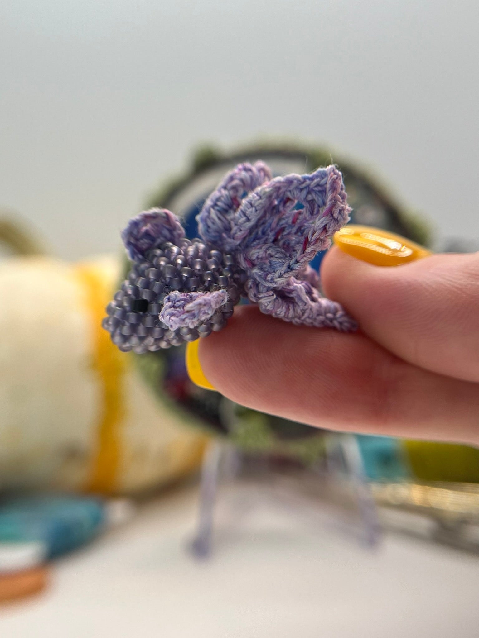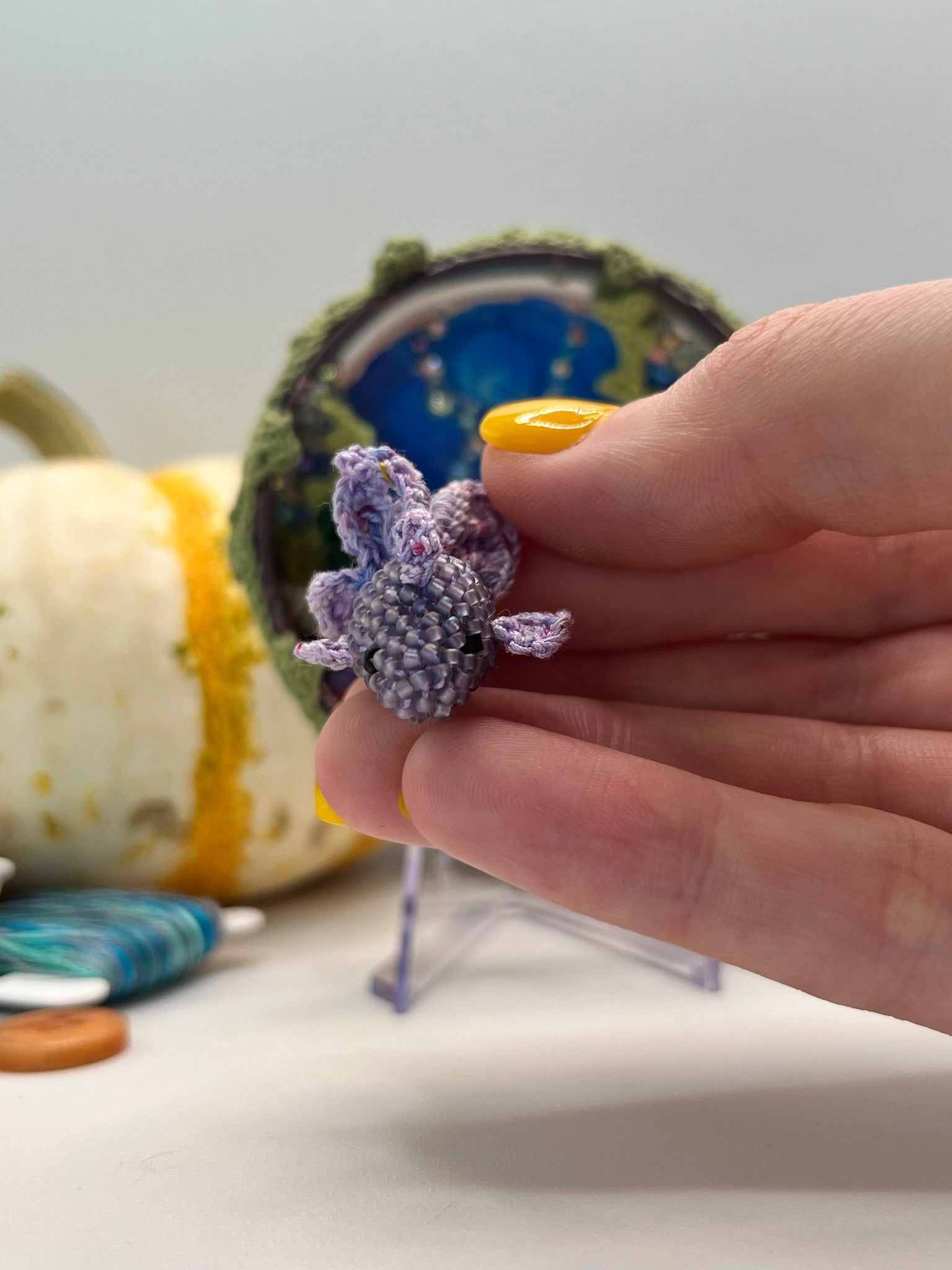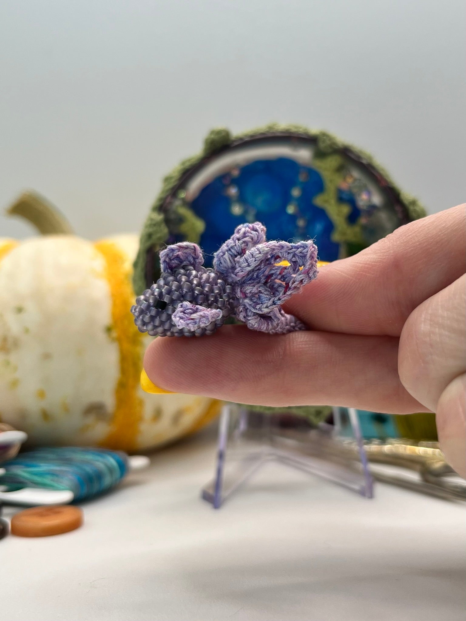Crocheted with a 0.6 mm hook, iridescent glass beads, and hand-dyed thread, the tiny plush sticks magnetically to her vibrant, plant-filled enclosure and can be taken out to admire the microscopic details!