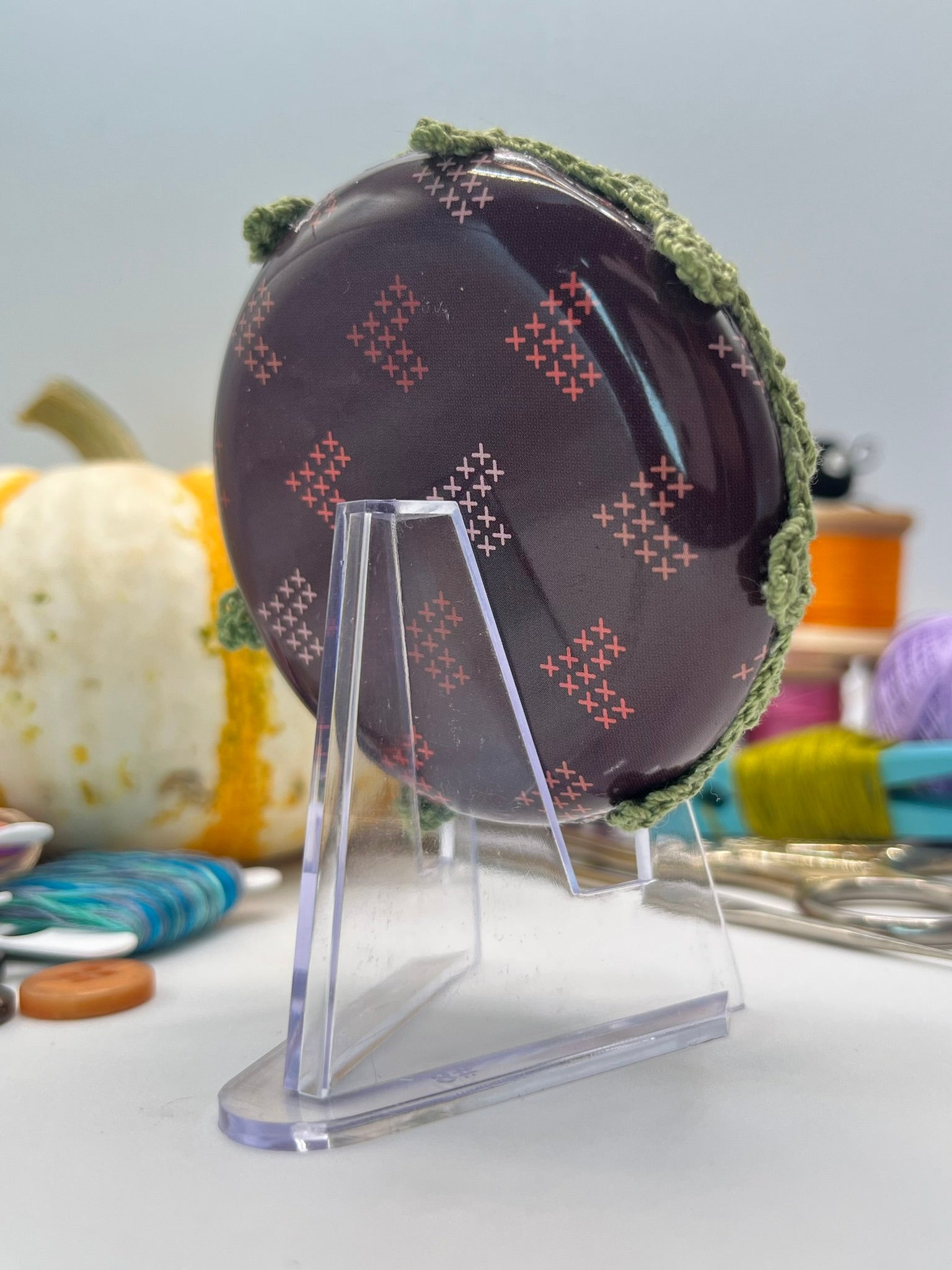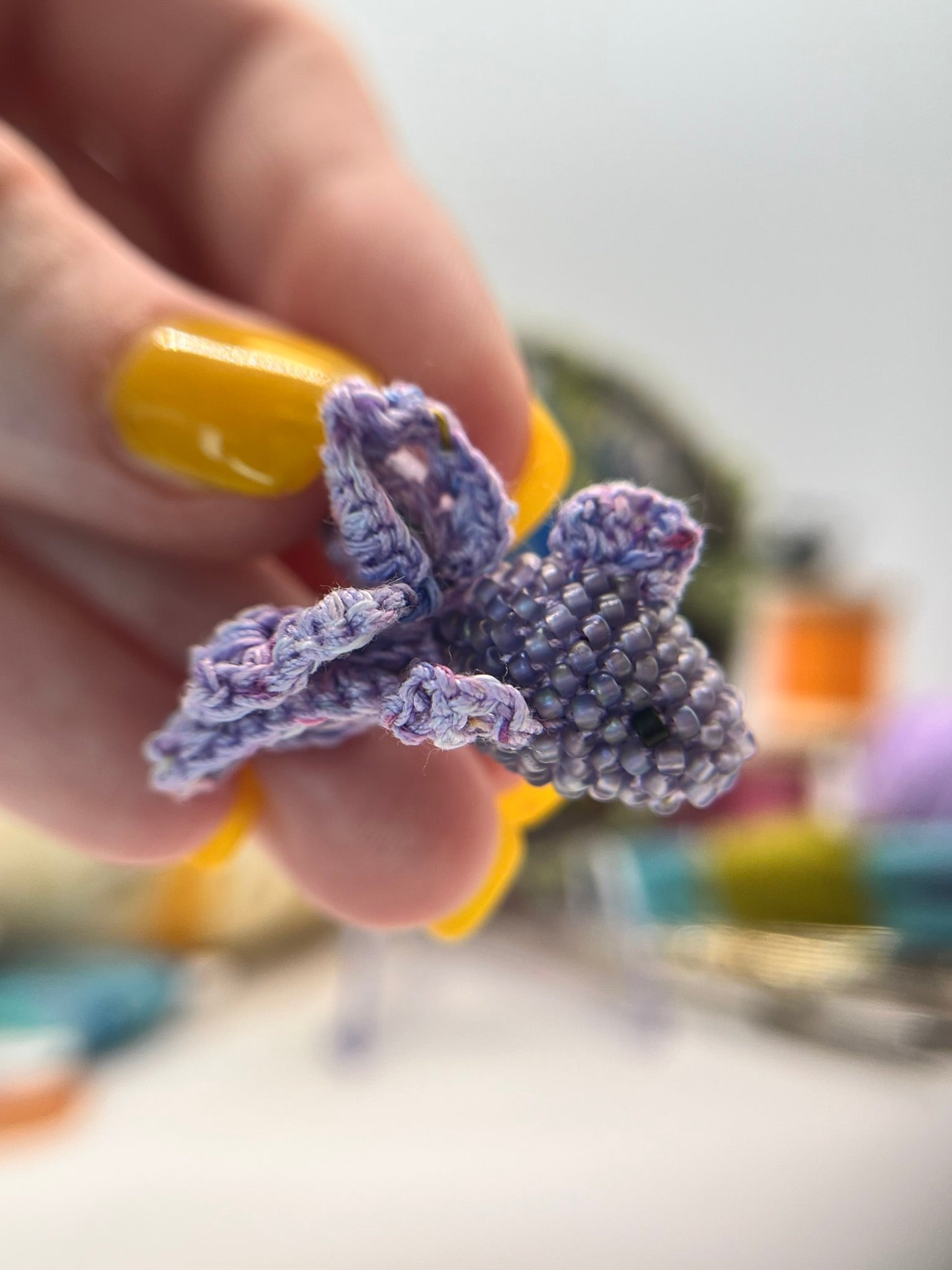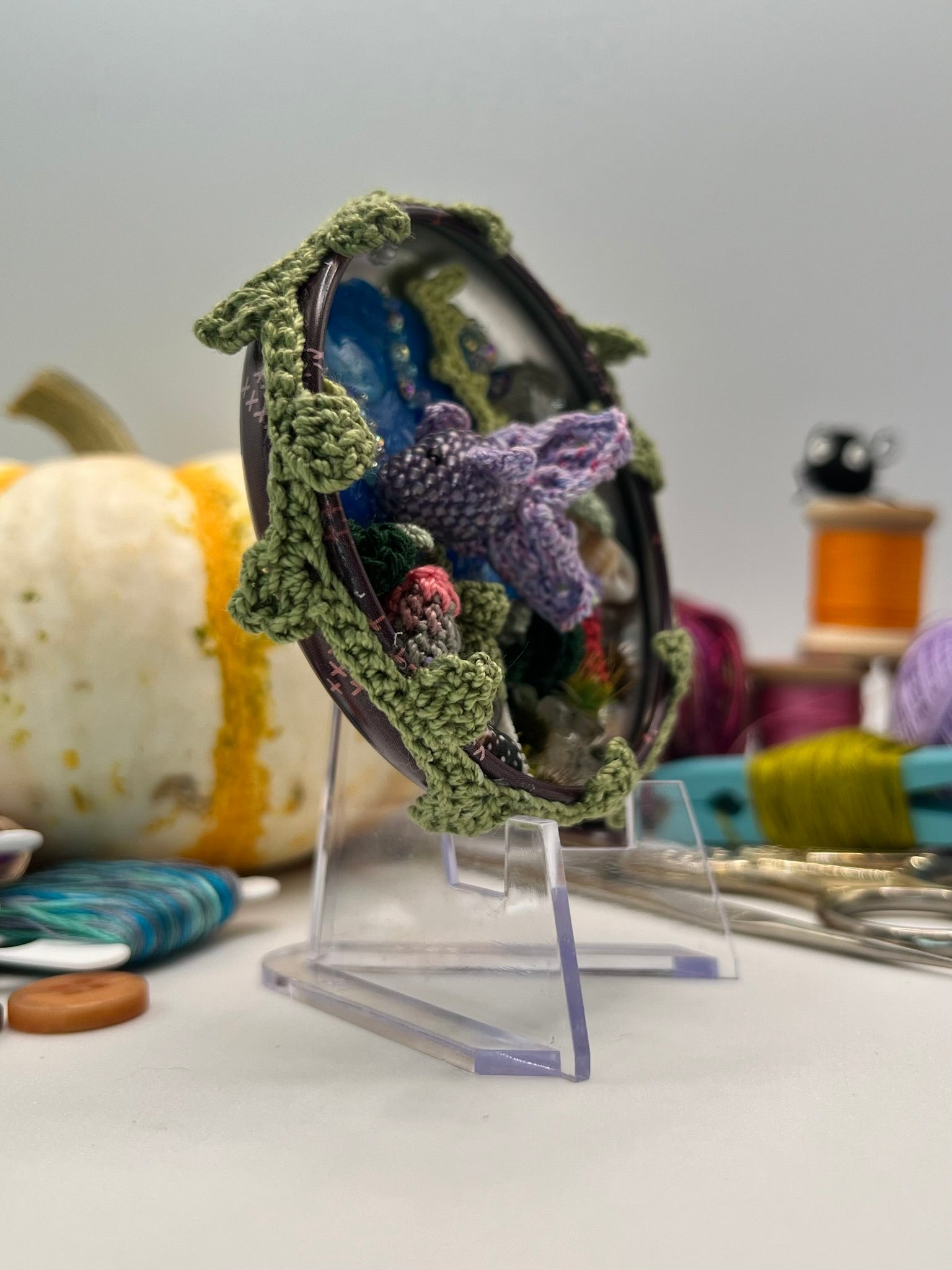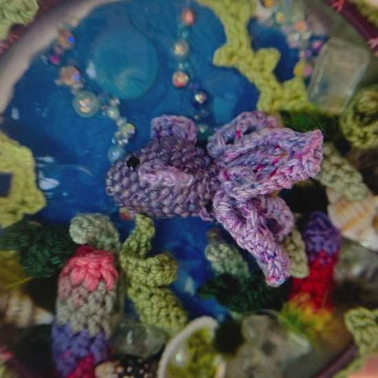 Crocheted with a 0.6 mm hook, iridescent glass beads, and hand-dyed thread, the tiny plush sticks magnetically to her vibrant, plant-filled enclosure and can be taken out to admire the microscopic details!
