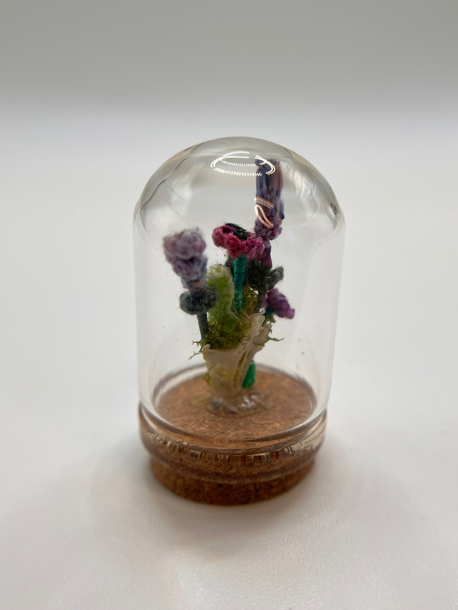 This trinket jar makes the perfect gift, home decor, or altarpiece for anyone who loves miniature botanical fiber art and bones!