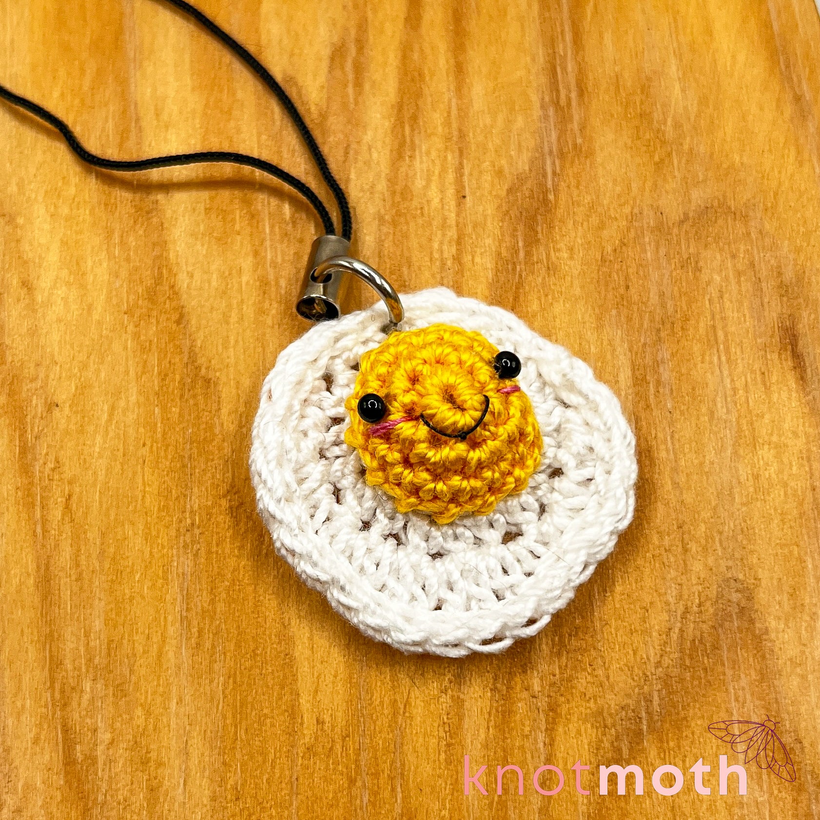 This adorable crochet fried egg keychain is the perfect accessory for any food lover and is sure to bring a smile to your face every time you reach for your keys.