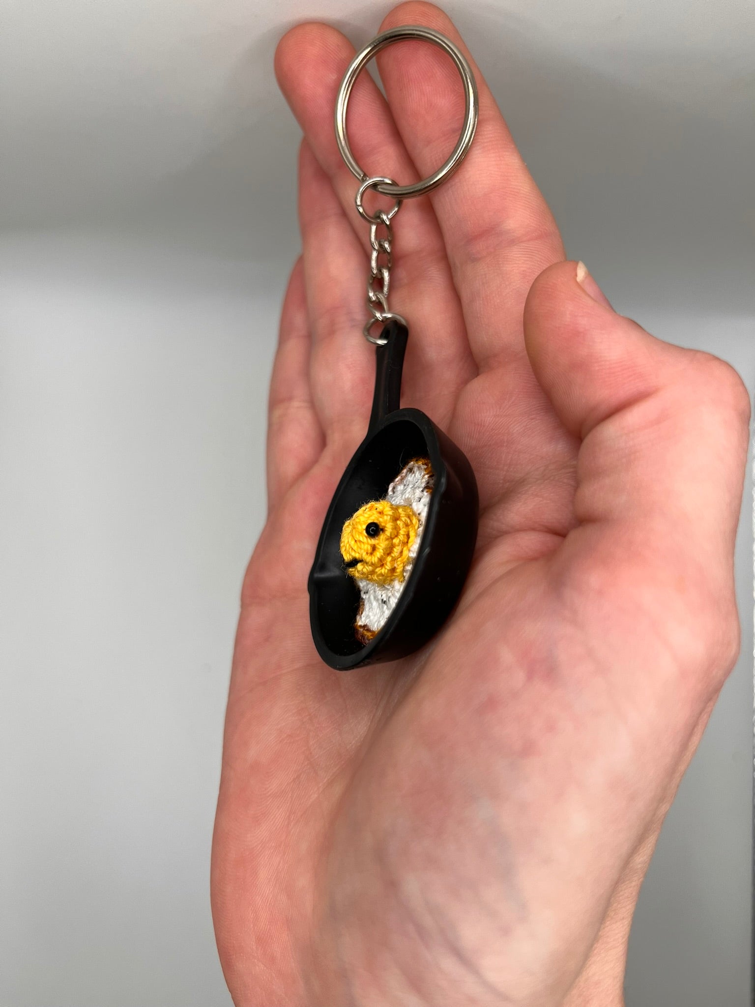 Cotton thread, plastic skillet, glue, dye, glass eyes, and metal keychain components