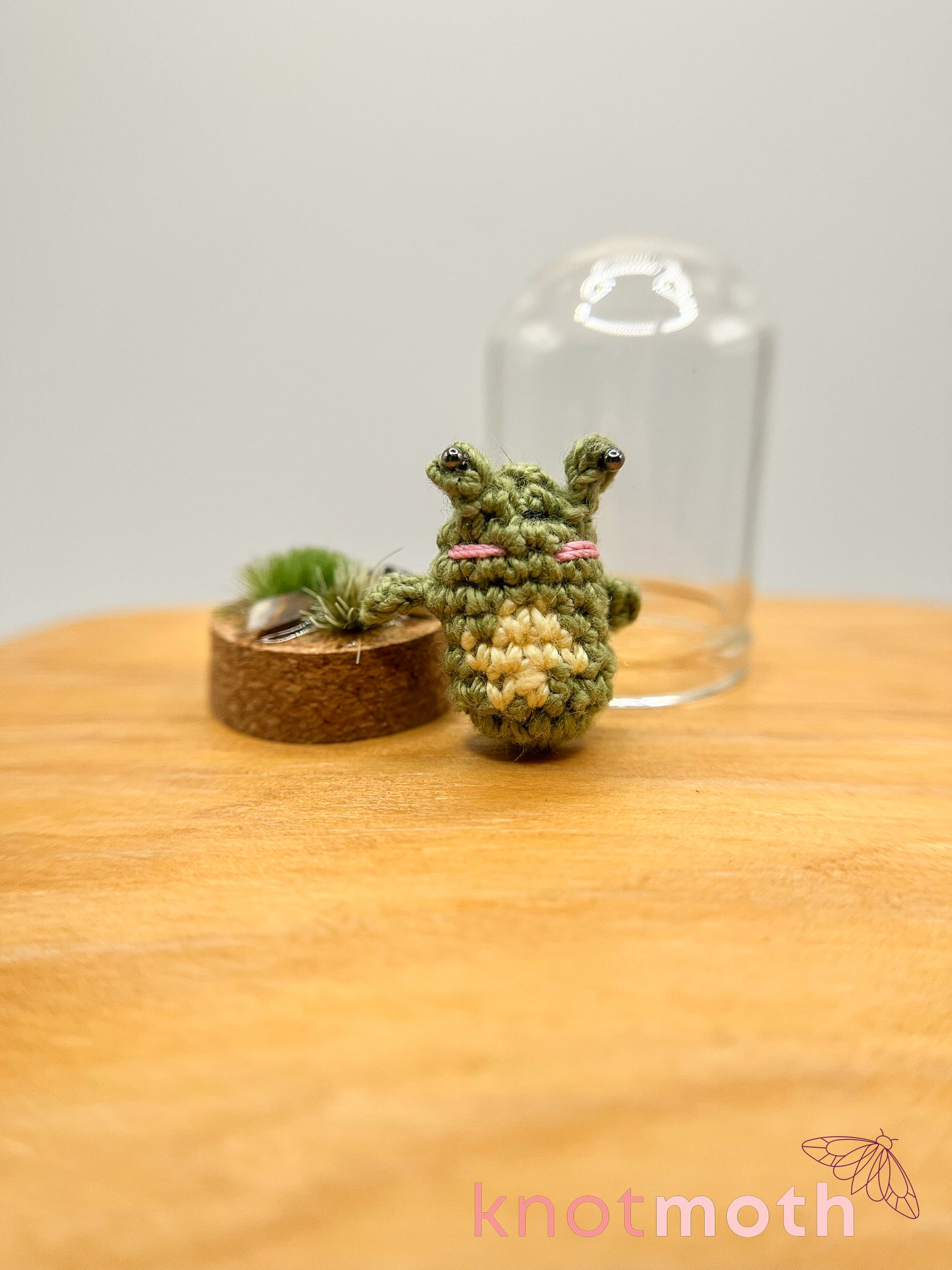 Perfect for gifting or keeping, this charming handmade micro crochet frog cloche jar is sure to make your home just a little bit cuter! Stitched with a 1.0 mm crochet hook, the tiny frog plushie rests in a protective glass jar decorated with crystal chips and fake grass.