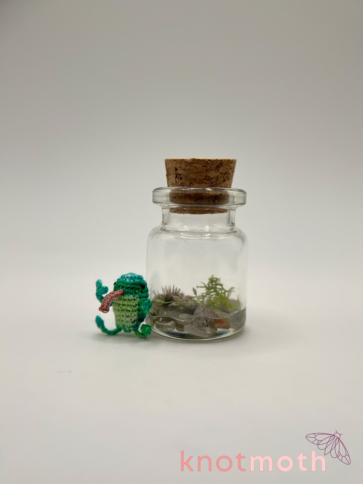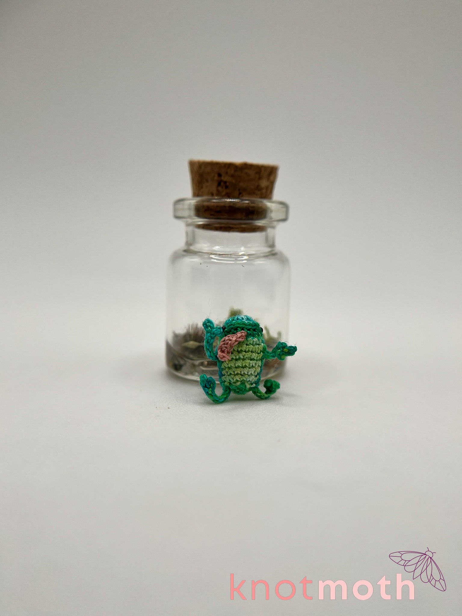 This adorable micro crochet frog trinket jar was made with thread and a 0.5 mm crochet hook, the micro-plushie frog rests in a small glass jar decorated with crystal chips, dried flowers, and fake grass.