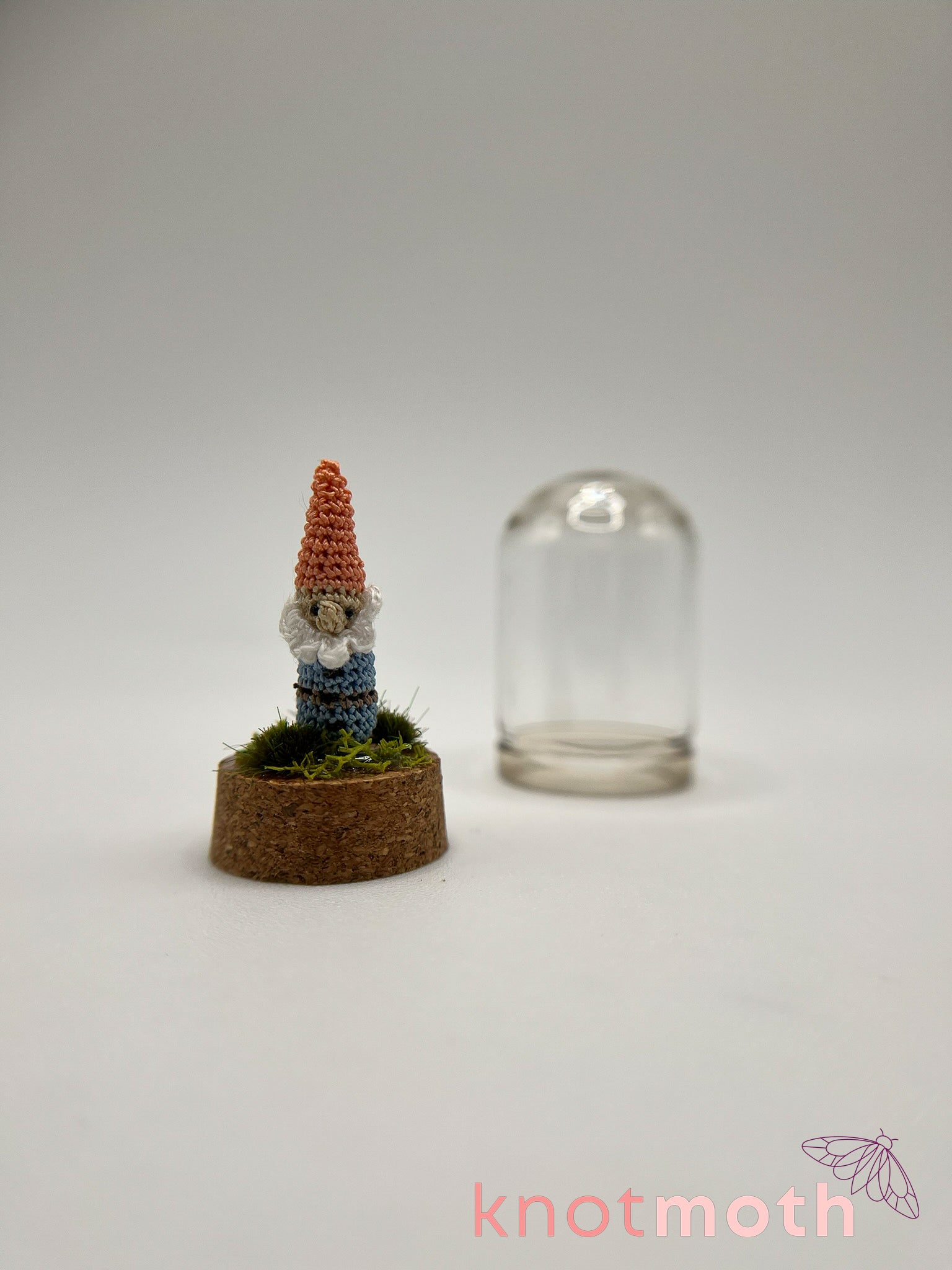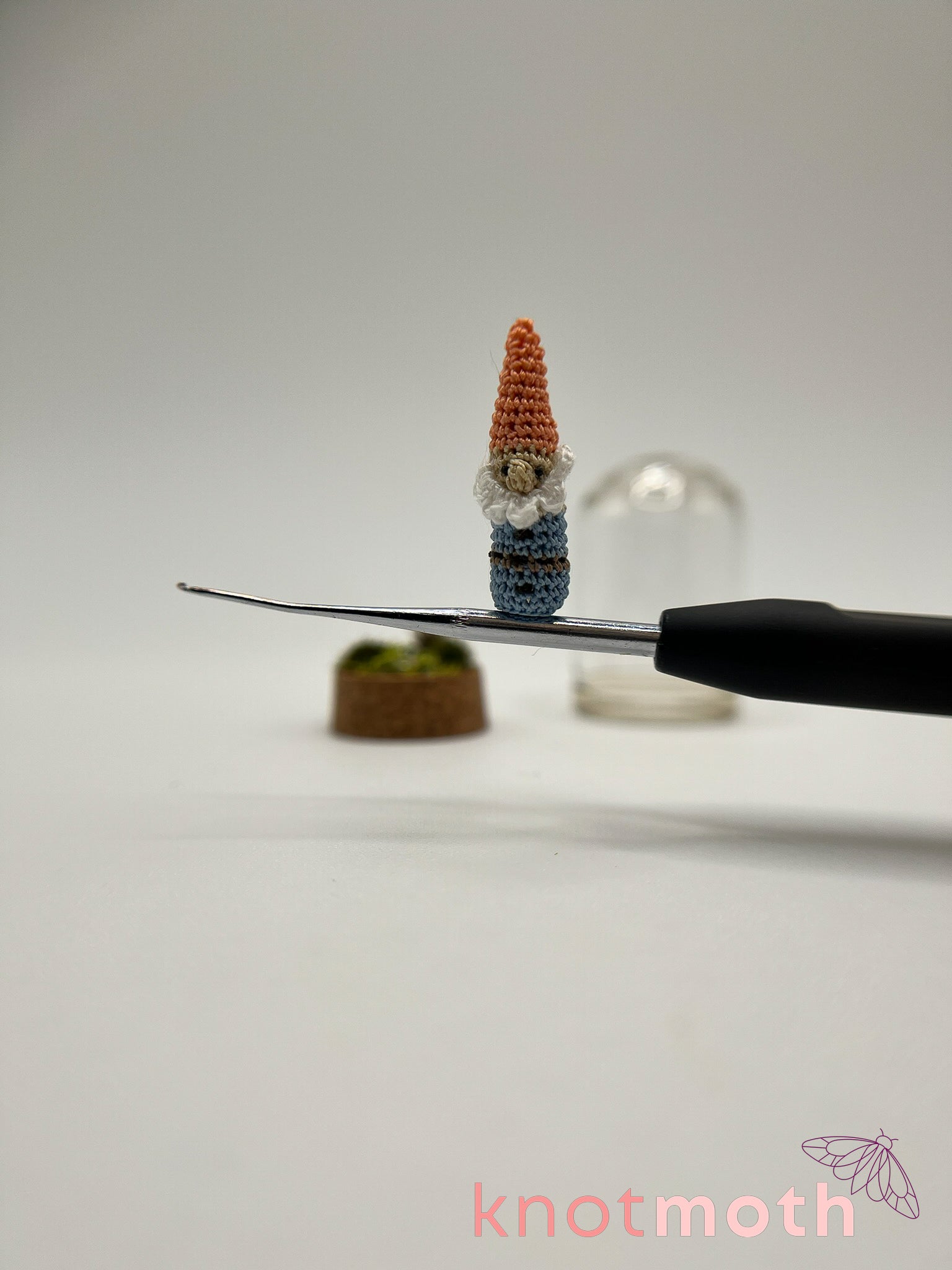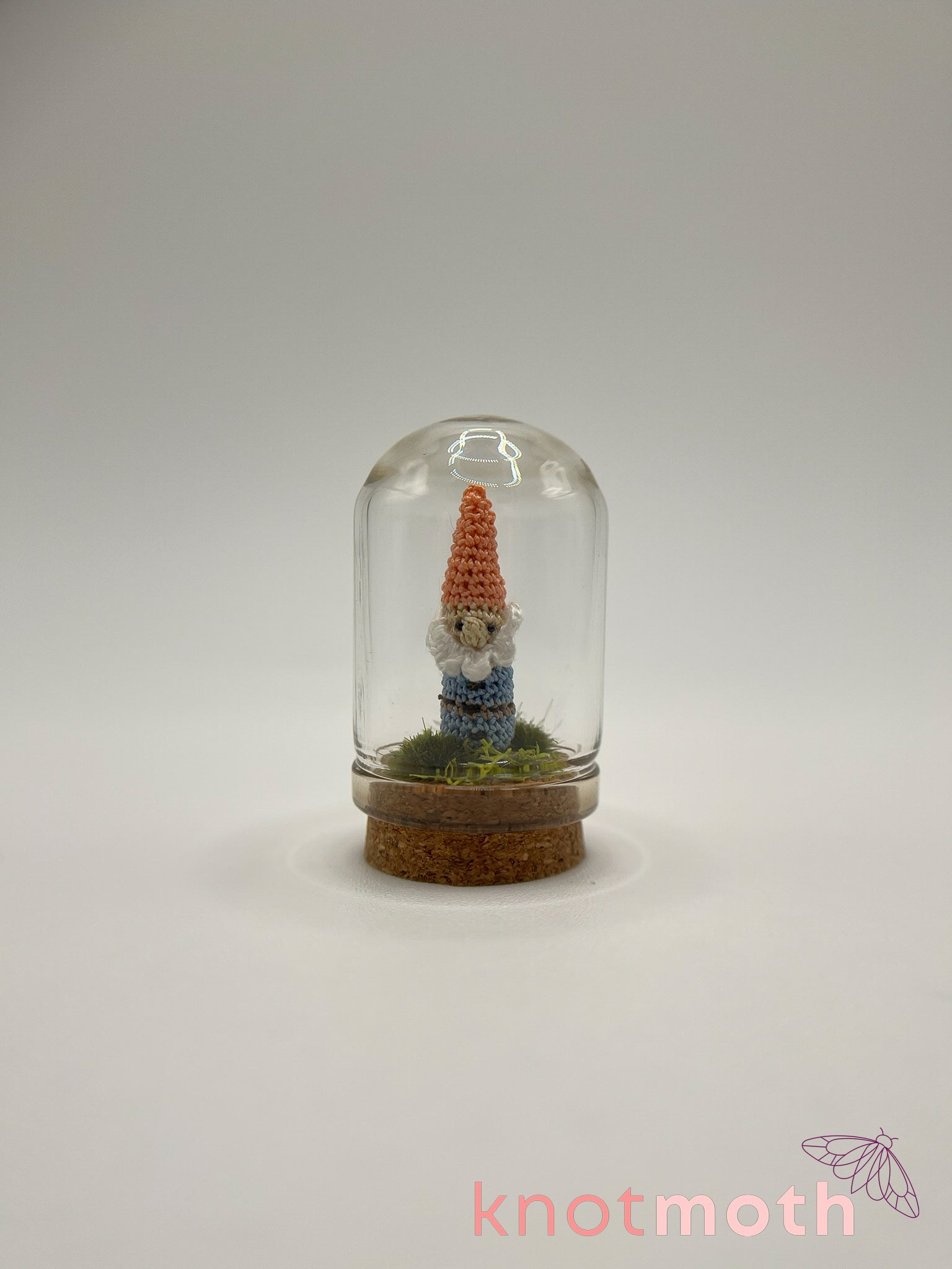 This charming micro crochet gnome cloche jar was made with thread and a 0.5 mm crochet hook and is magnetically attached to a protective glass cloche jar decorated with dried flowers, moss, and fake grass.
