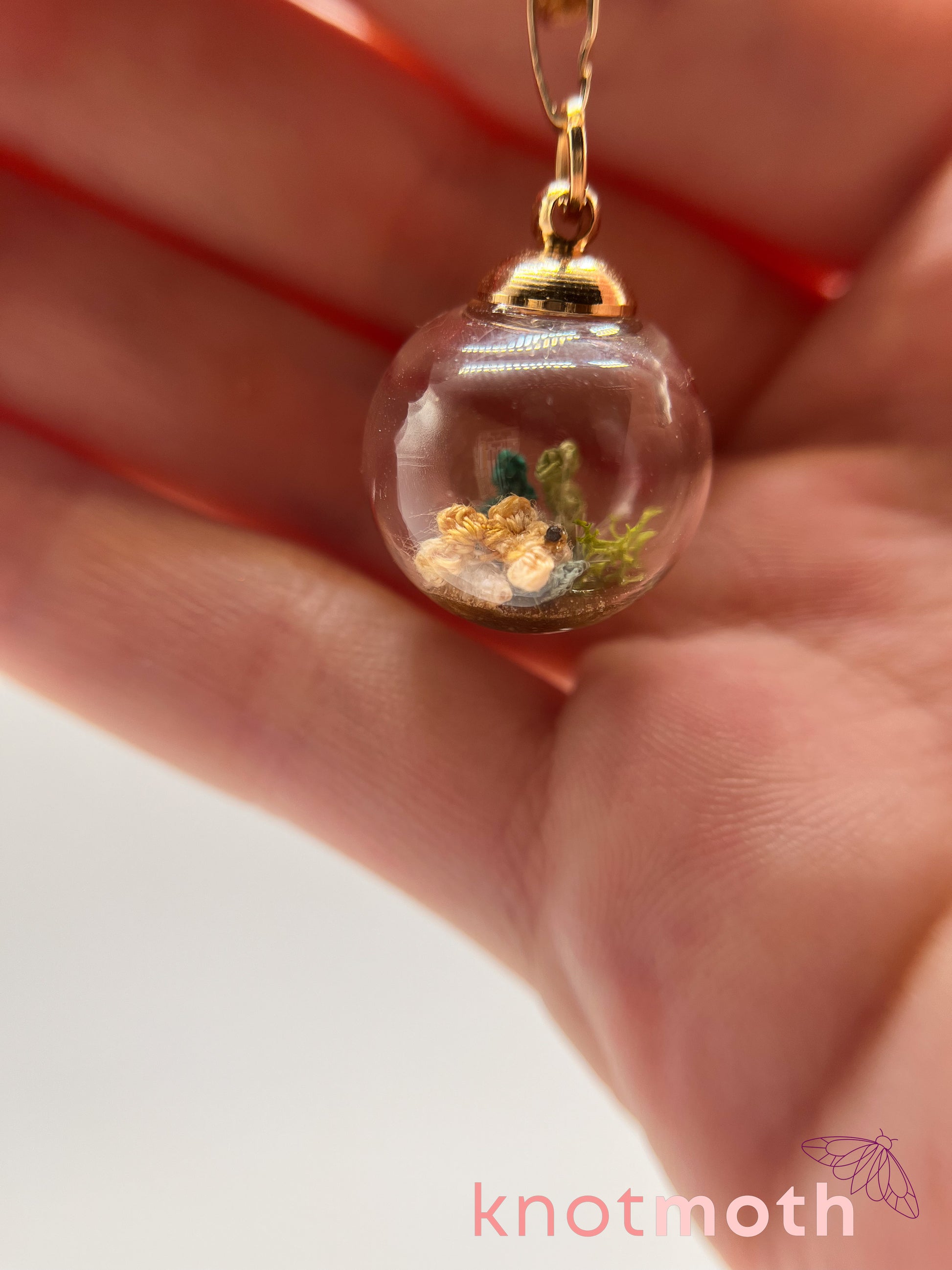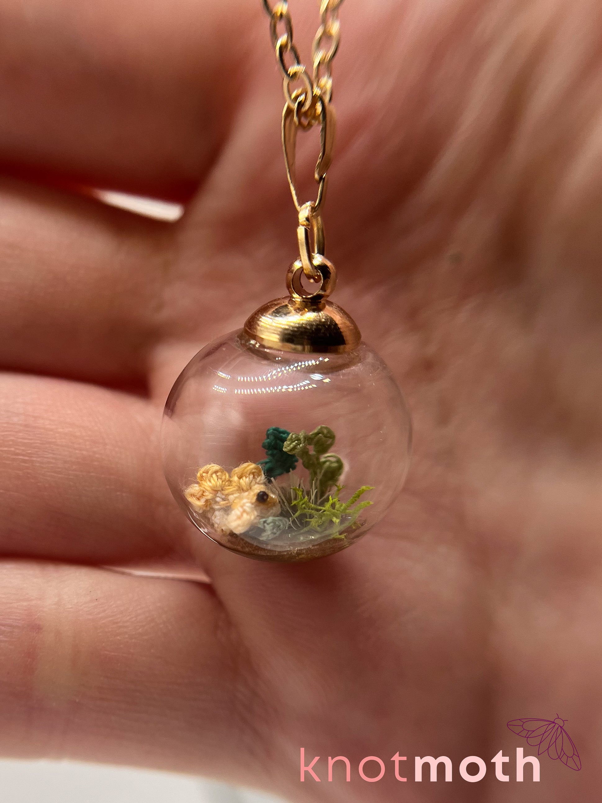 This adorable handmade micro crochet goldfish aquarium necklace is the perfect whimsical accessory for anyone who loves unique handmade jewelry! The tiny glass globe is decorated with hand-stitched plants, sand, moss, and grass, and you can shake the charm to move the fish and make it "swim" around!