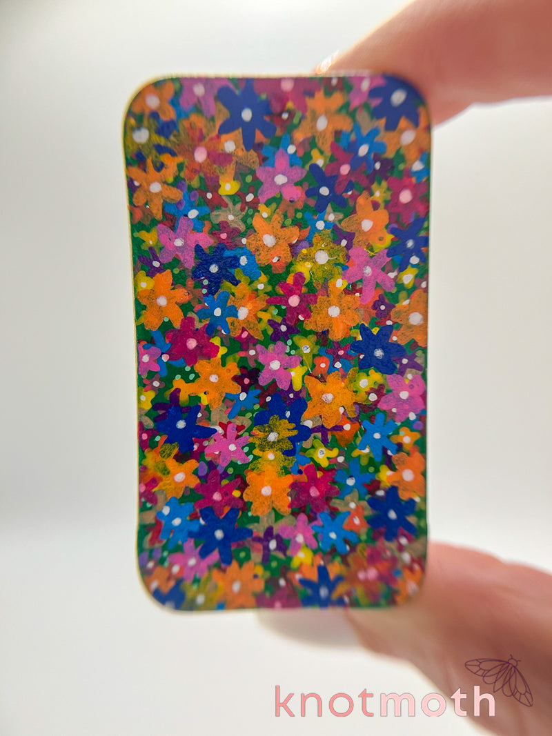 This charming and intricately detailed micro-crochet hen and chick flower meadow scene inside a miniature metal tin will make you smile every time you slide off the tin's lid to take a peek, and it's small enough to carry inside your pocket!
