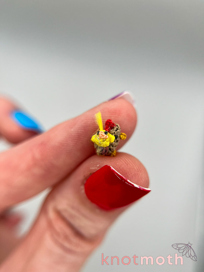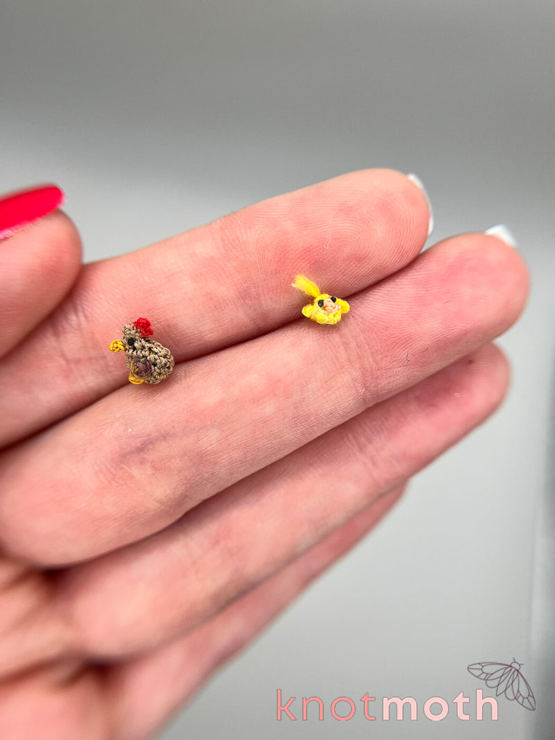Handmade with thread and a 0.5 mm crochet hook, the amazingly tiny chickens snap together and to the metal tin with a satisfying click that makes them great as a fidget toy!