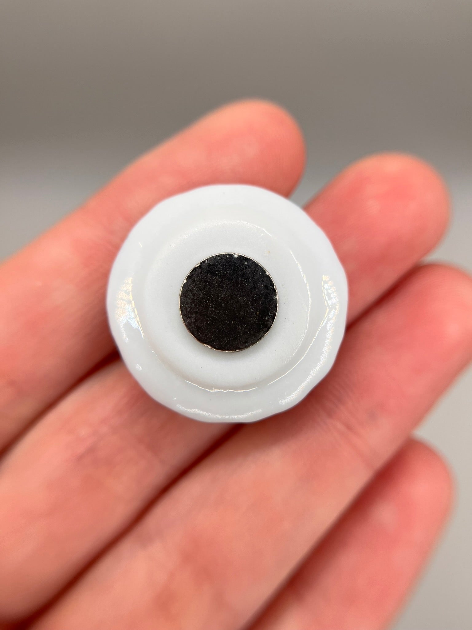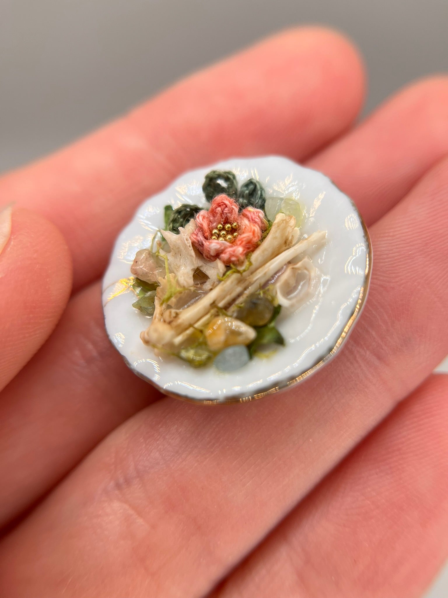 Bones harvested from owl pellets, cotton thread, crystal chips, microbead, moss, glue, miniature ceramic plate, magnet