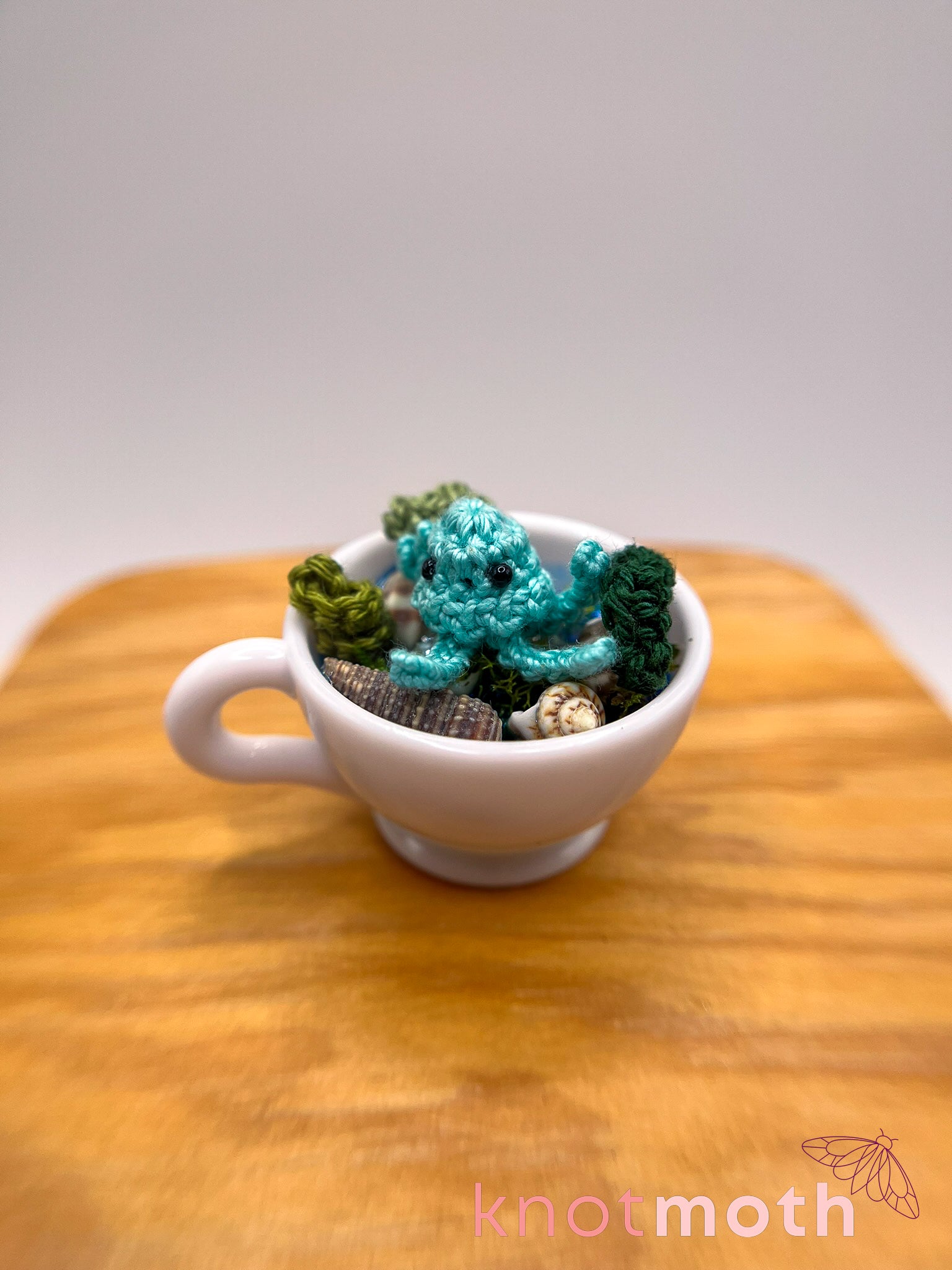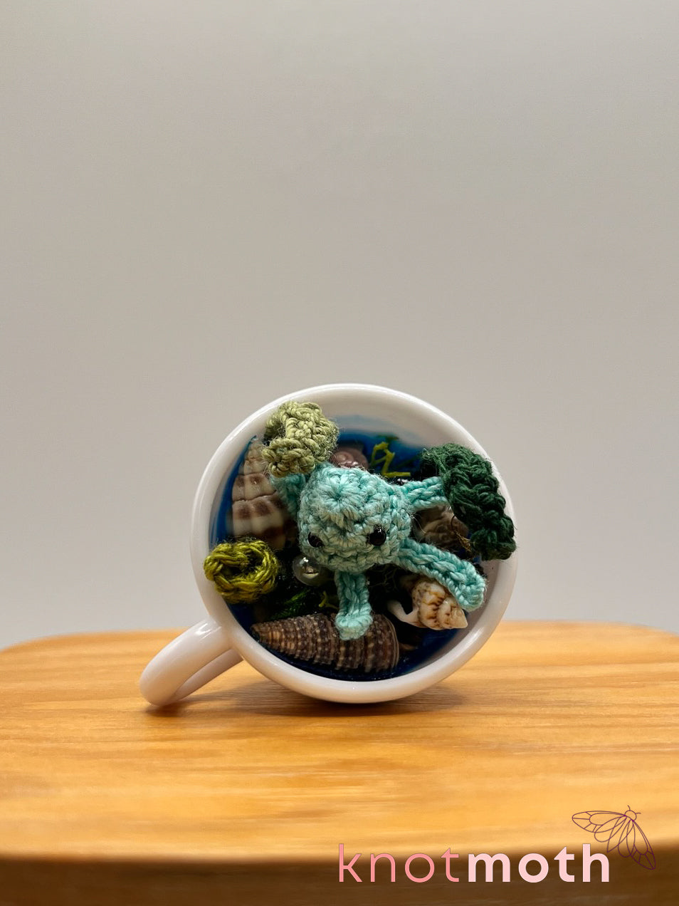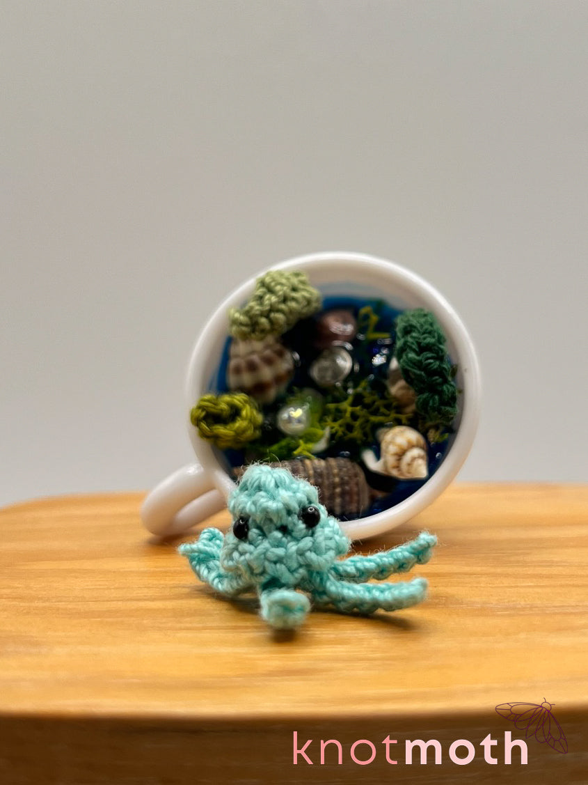 The tea-nsy amigurumi sea creature magnetically connects to a small teacup decorated with ocean-themed details including crocheted seaweed and plants, seashells, crystals, fake grass, and sparkly resin.