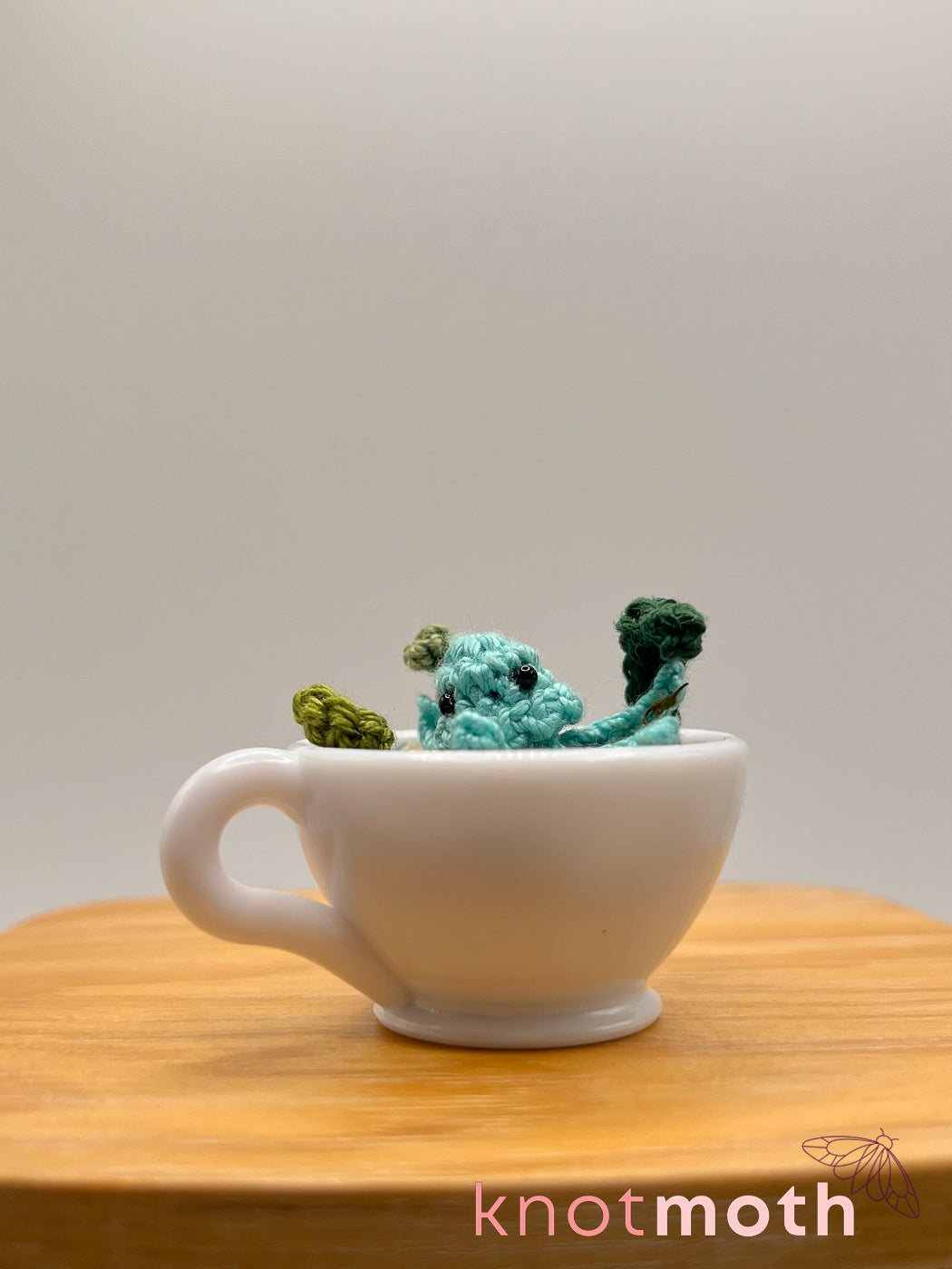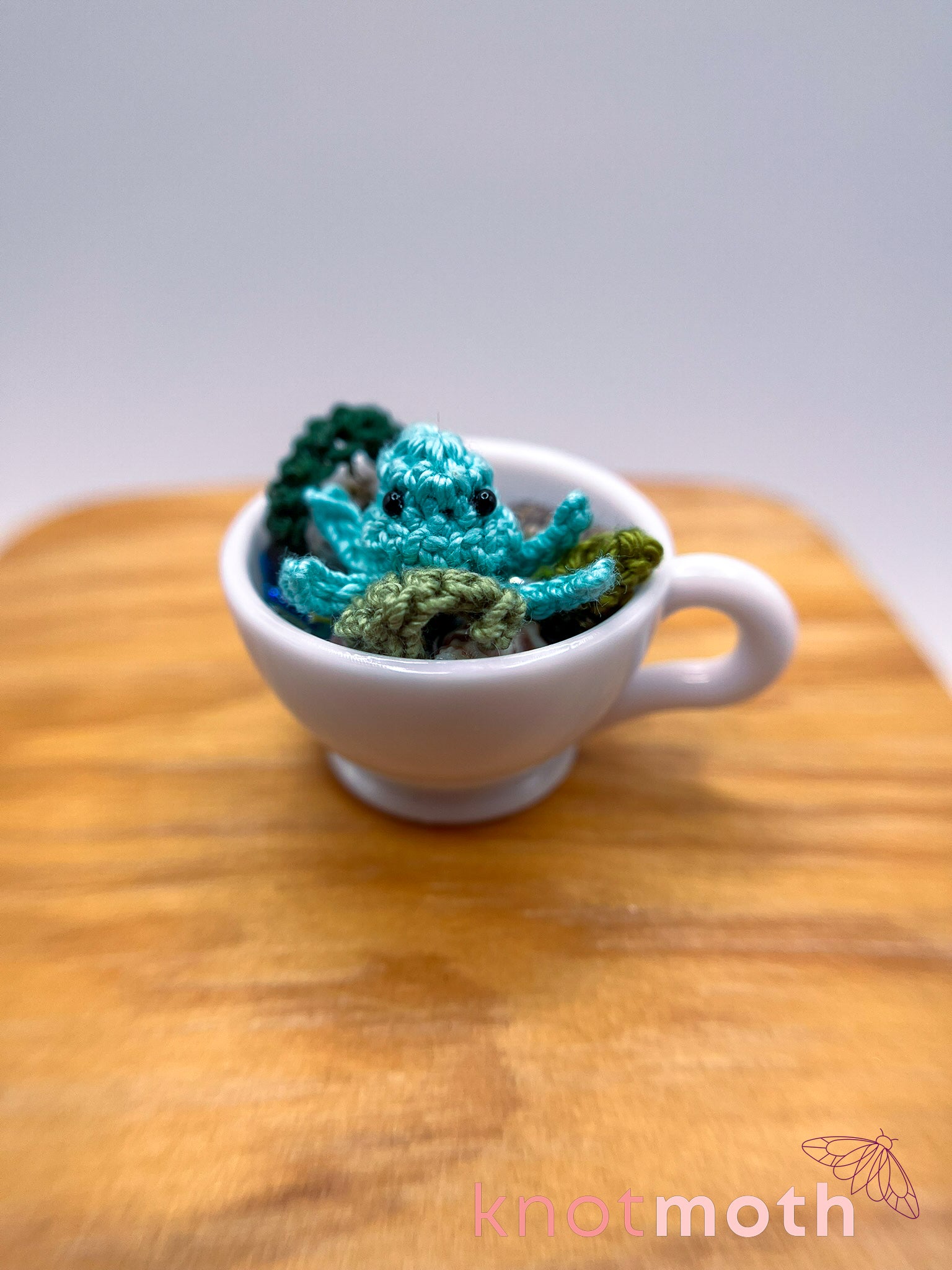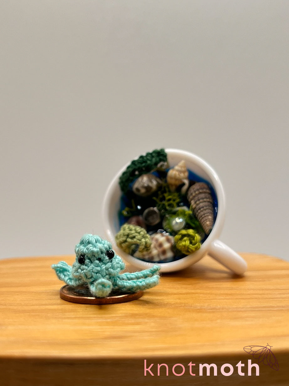 The tea-nsy amigurumi sea creature magnetically connects to a small teacup decorated with ocean-themed details including crocheted seaweed and plants, seashells, crystals, fake grass, and sparkly resin.