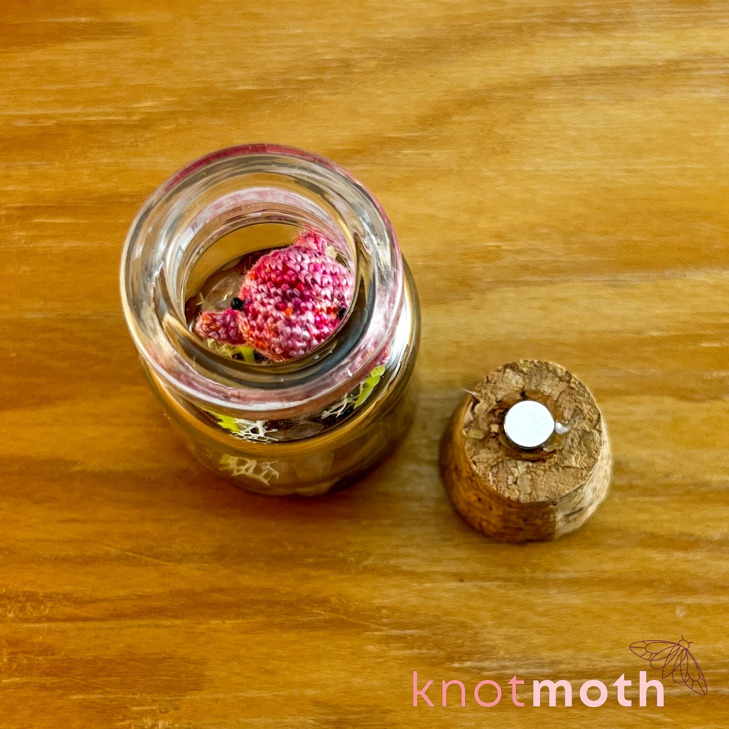 Thread, magnet, glue, micro beads, glass jar with cork, crystal chips, moss, plastic plants, resin