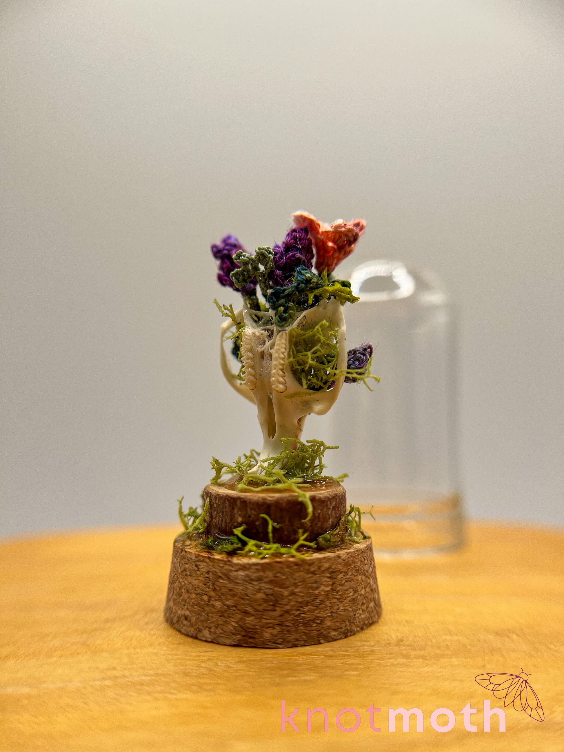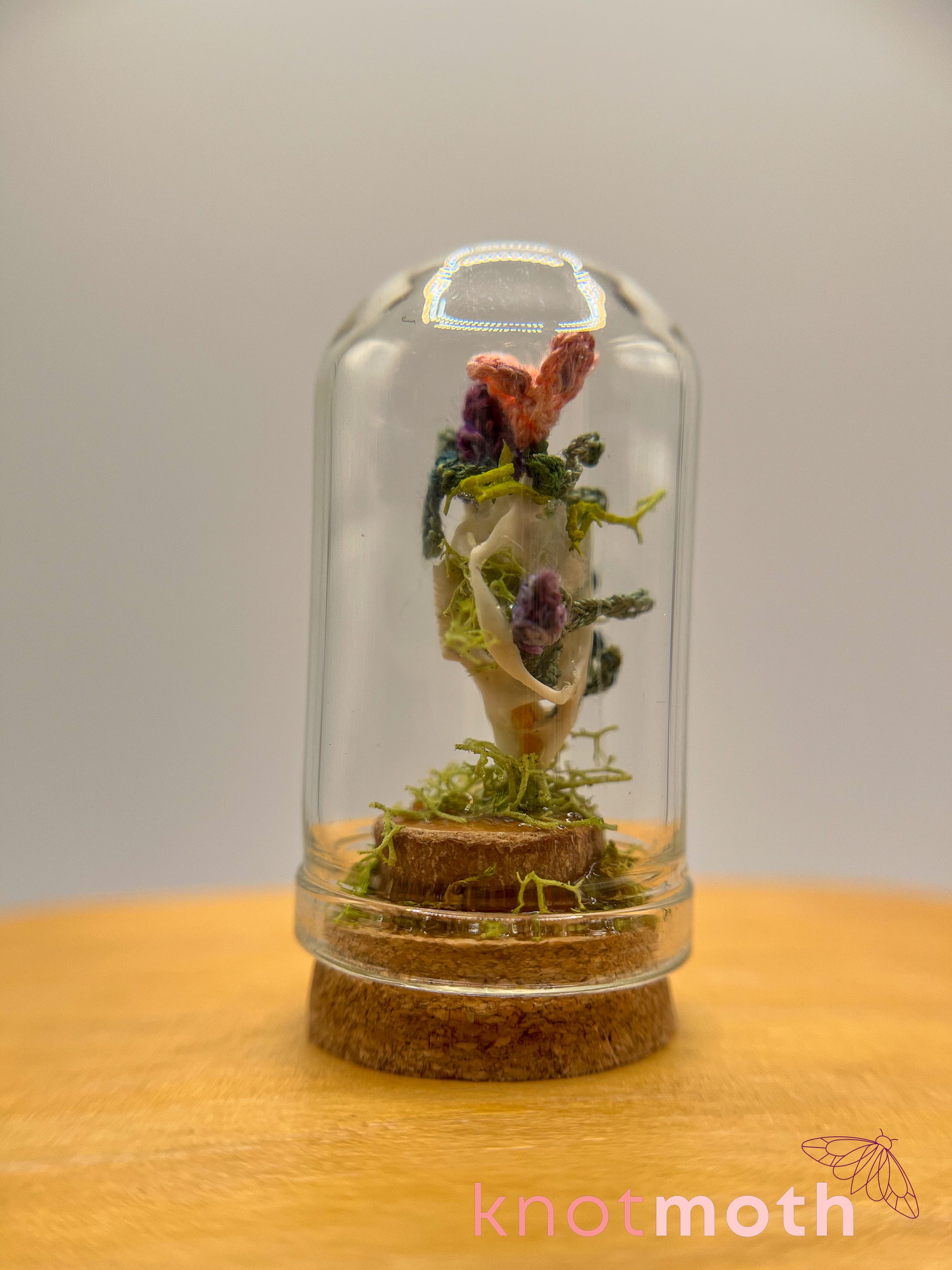 This beautifully macabre cloche jar features handmade micro-crochet lavender, primrose, and vines "growing" from a tiny ethically sourced skull dissected from owl pellets.