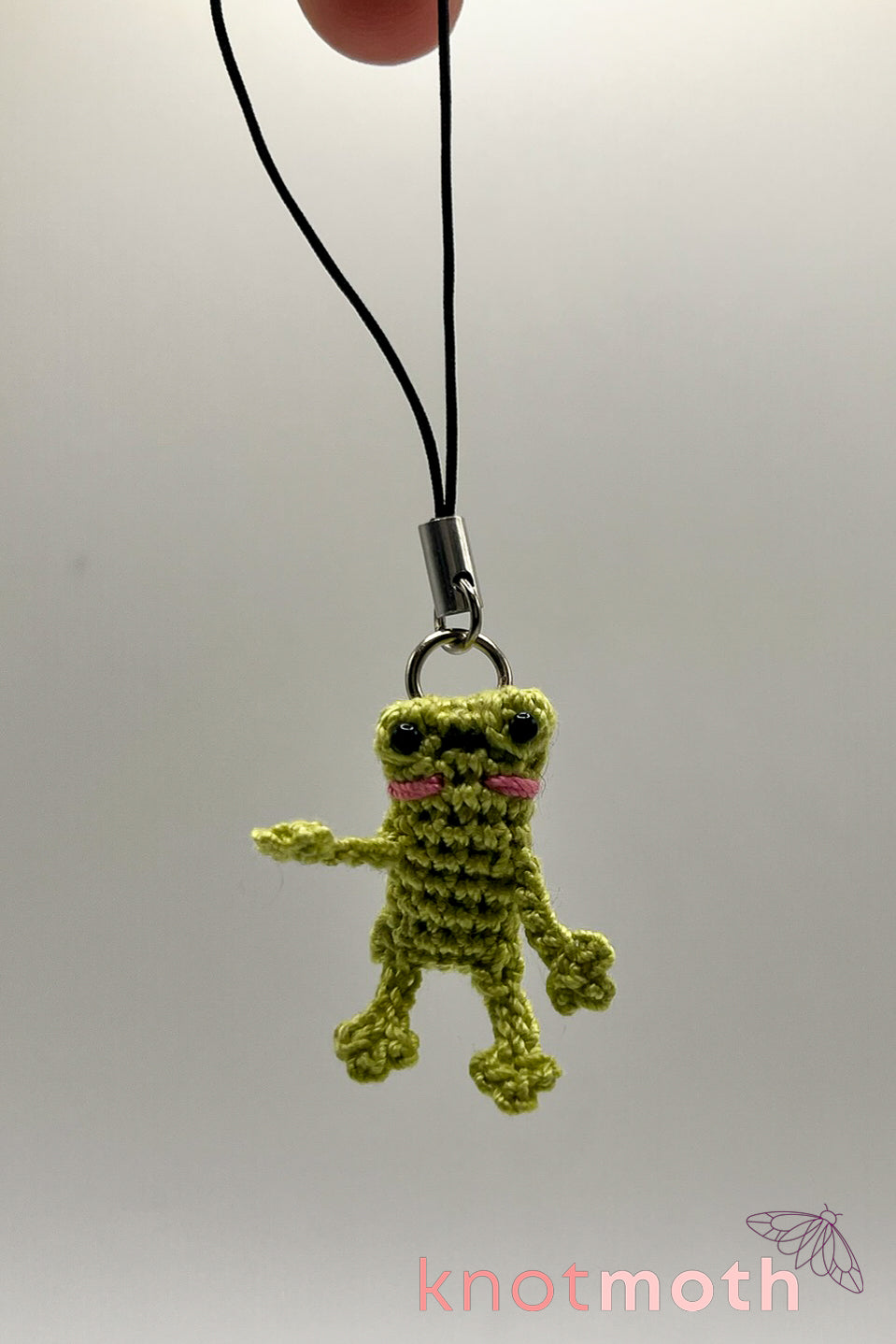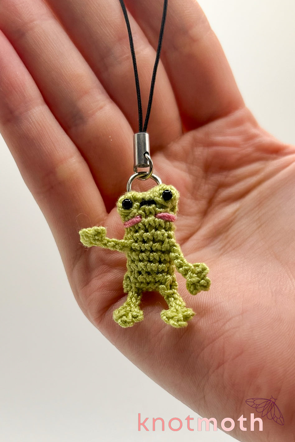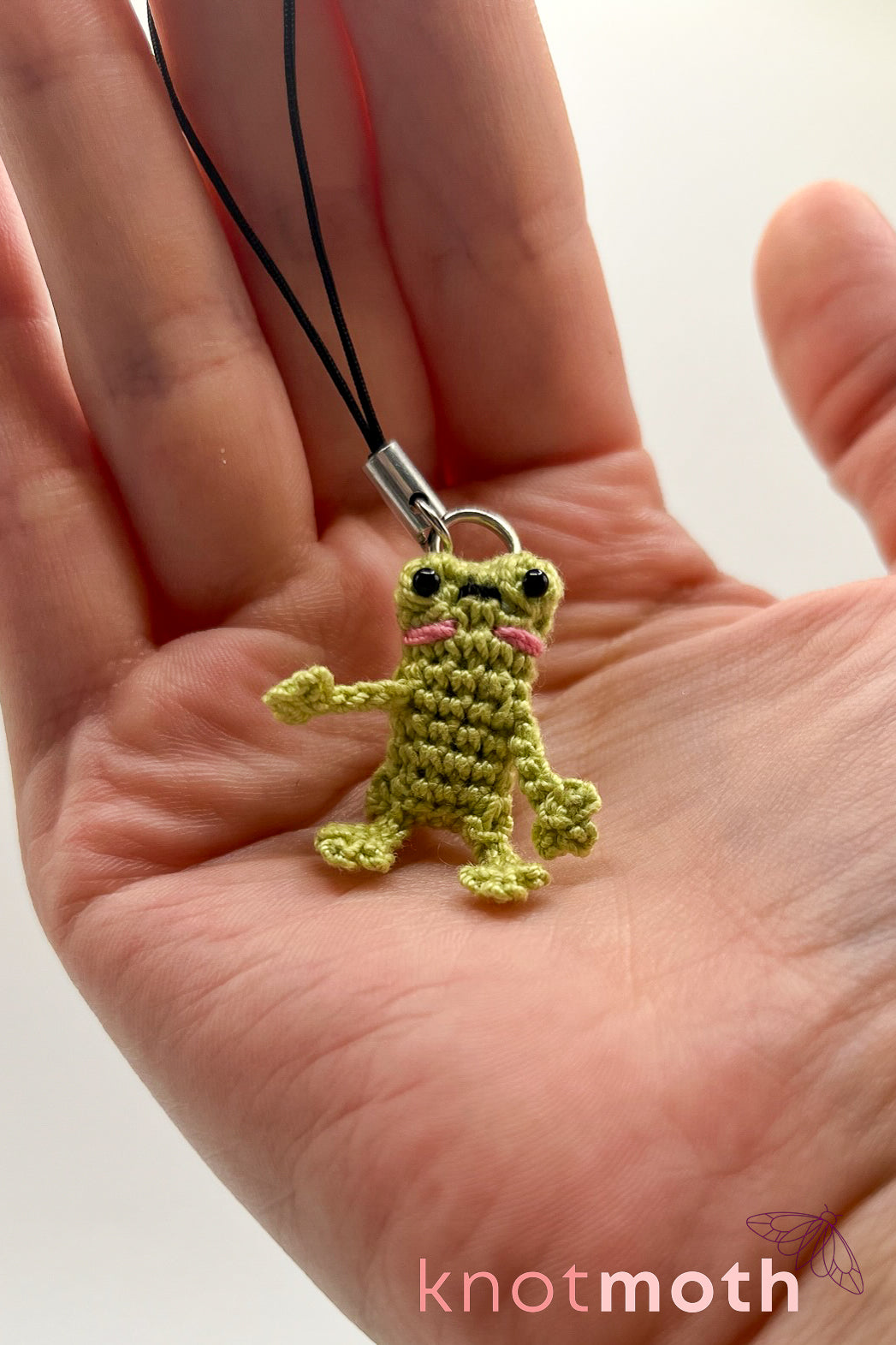 This adorable handmade micro-crochet crab plushie made with light green thread and a 1.0 mm crochet hook is the perfect accessory for lovers of froggy fiber art!