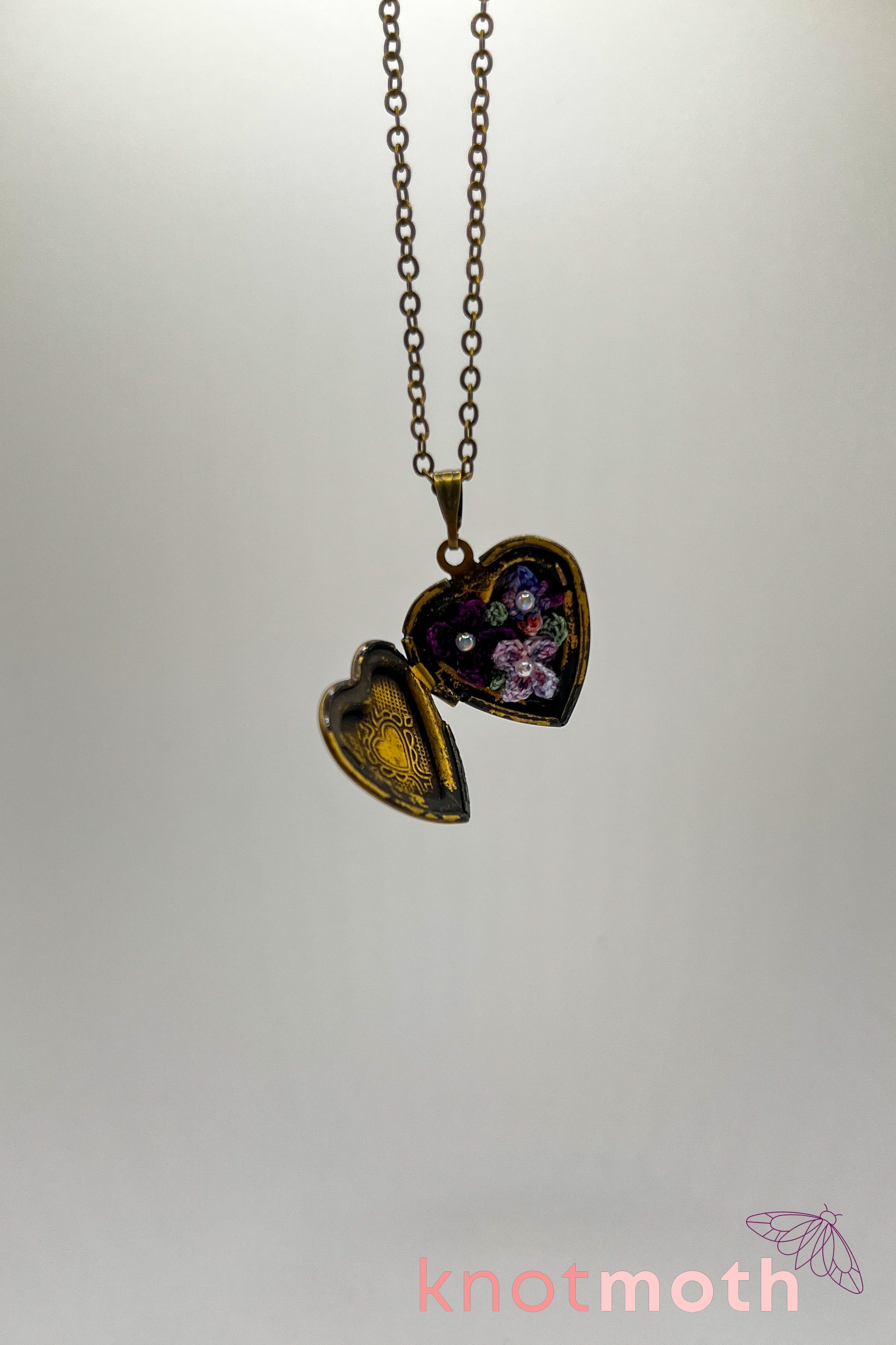 Show your love for someone special or treat yourself to a unique, elegant handmade masterpiece! This charming engraved bronze heart-shaped locket is filled with beautiful purple micro-crochet lilac flowers for a tiny and intricate piece of simply breathtaking jewelry!