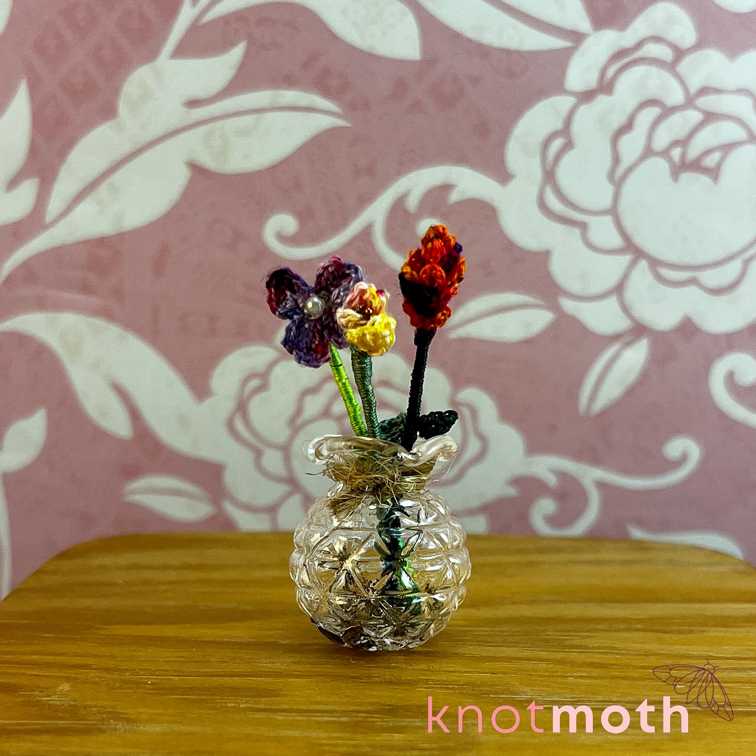 This lovely and delicate handmade micro crochet flower bouquet in a miniature glass vase is the perfect trinket to celebrate your love of botanical fiber art!