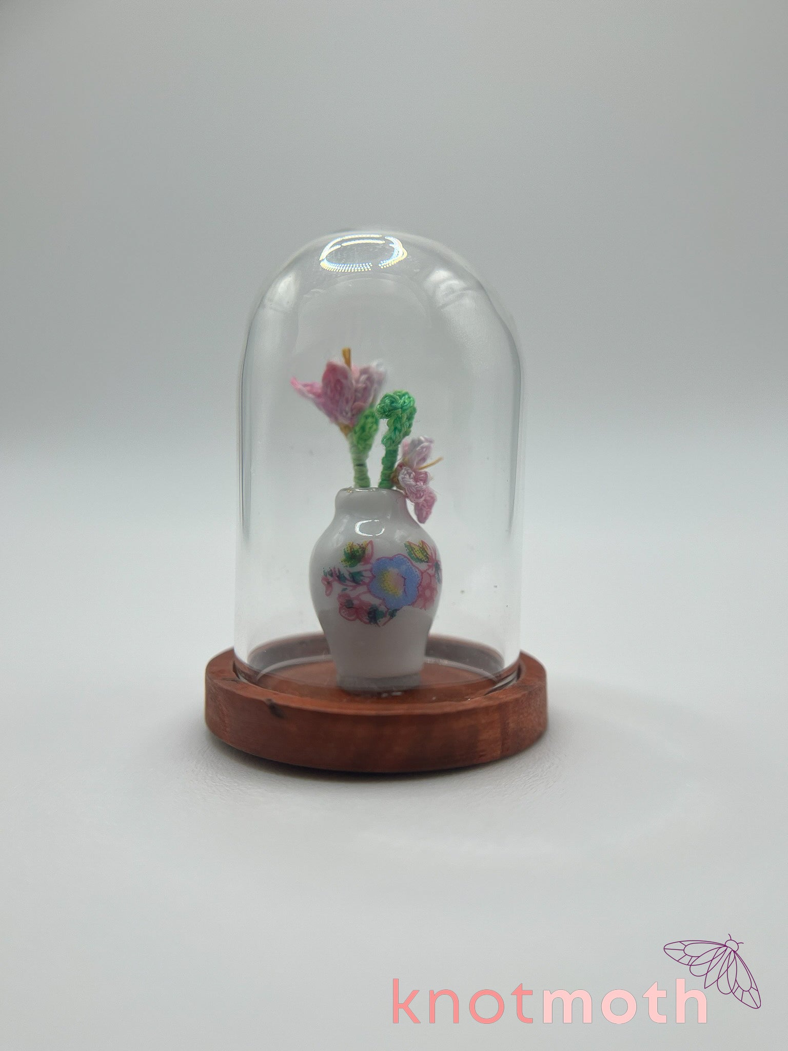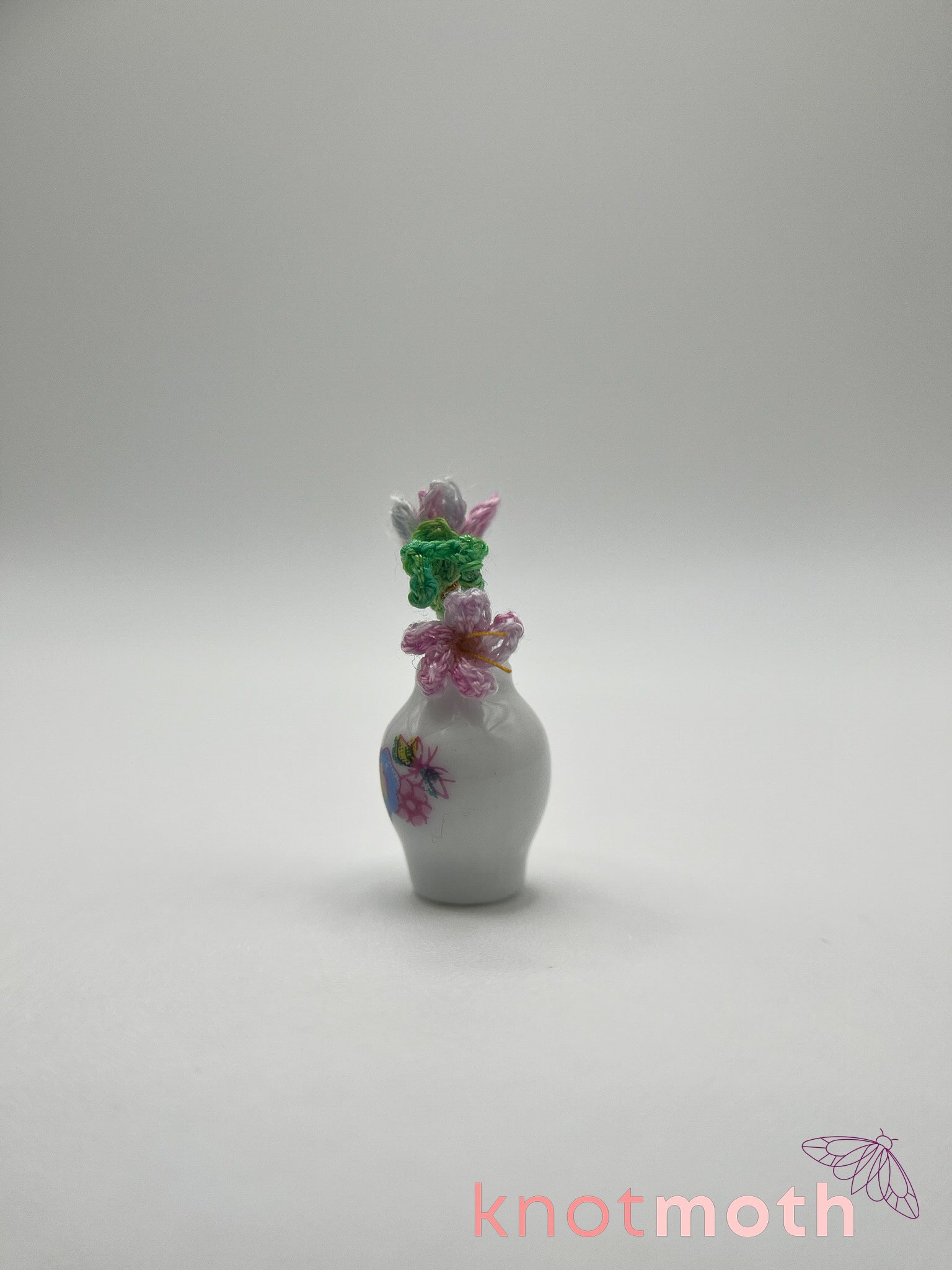 This lovely and delicate handmade micro crochet flower bouquet in a miniature glass vase is the perfect trinket to celebrate your love of botanical fiber art!
