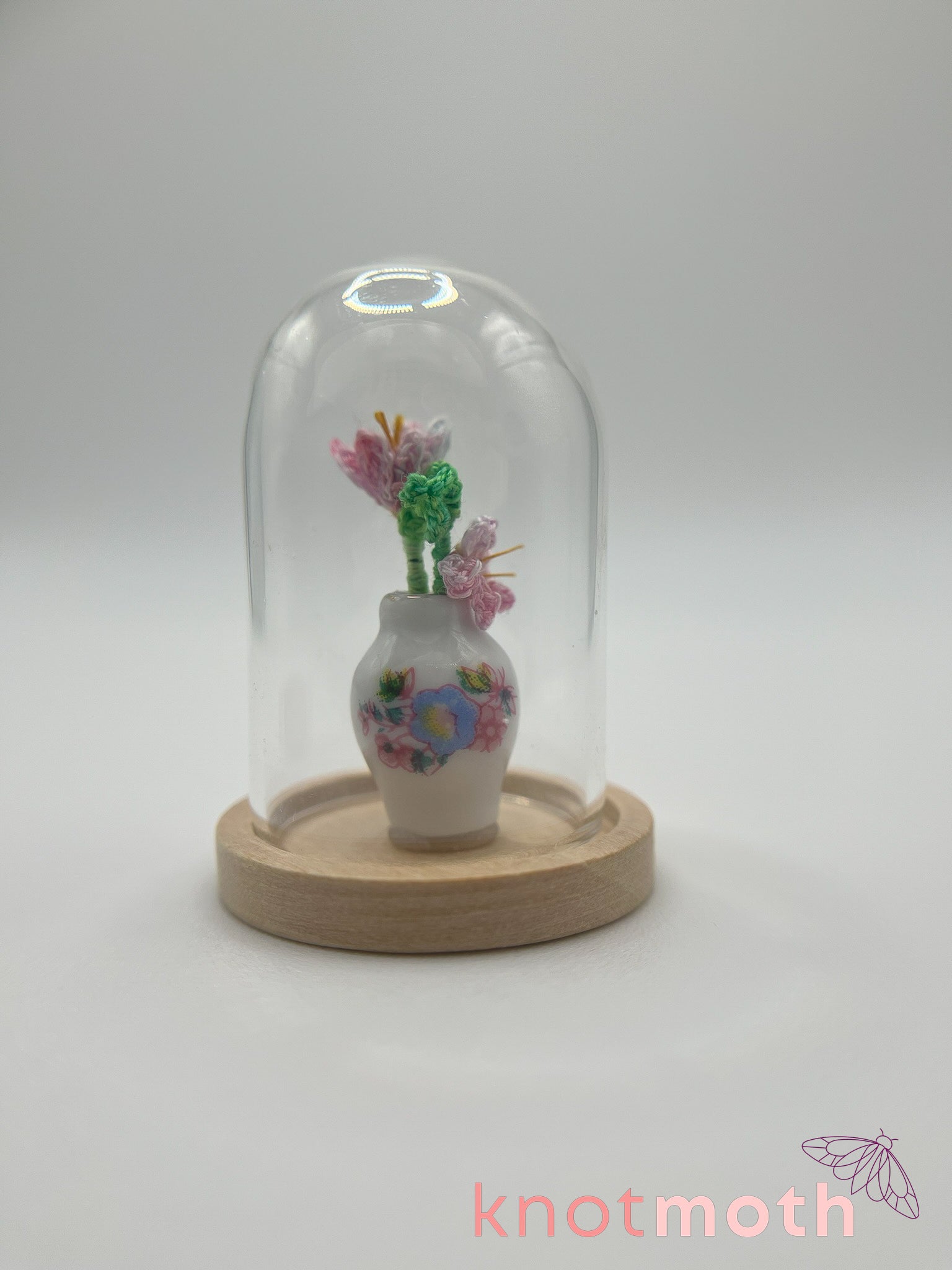 Thread, floral wire, magnet, resin, glass vase, glue; optional glass cloche jar with wooden base