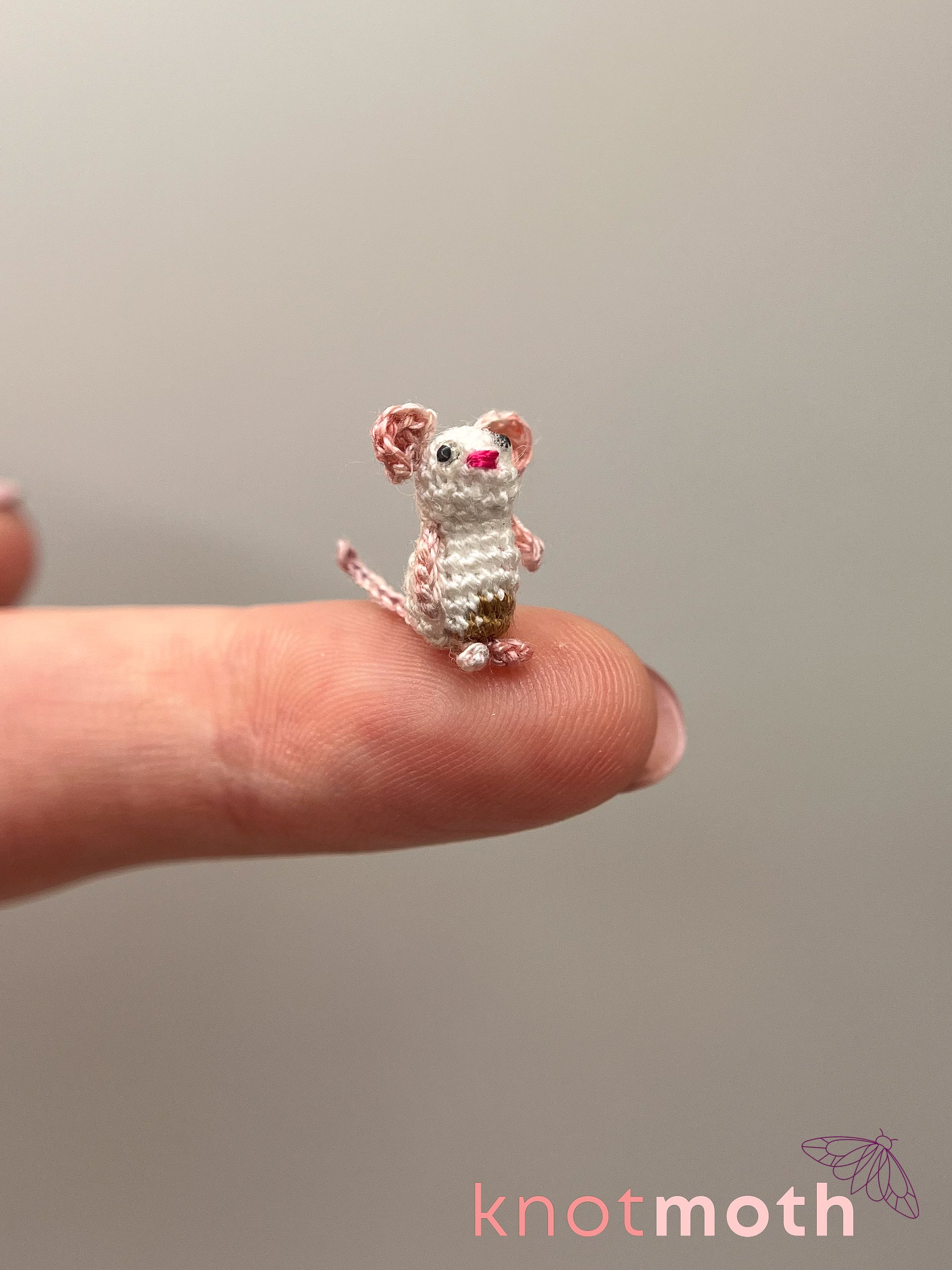 This micro-crochet mouse mug is the perfect handmade trinket for anyone who loves miniature fiber art! Meticulously stitched with hand-dyed thread and a 0.5 mm crochet hook, you'll be amazed and charmed by the intricacy and whimsy of this piece.