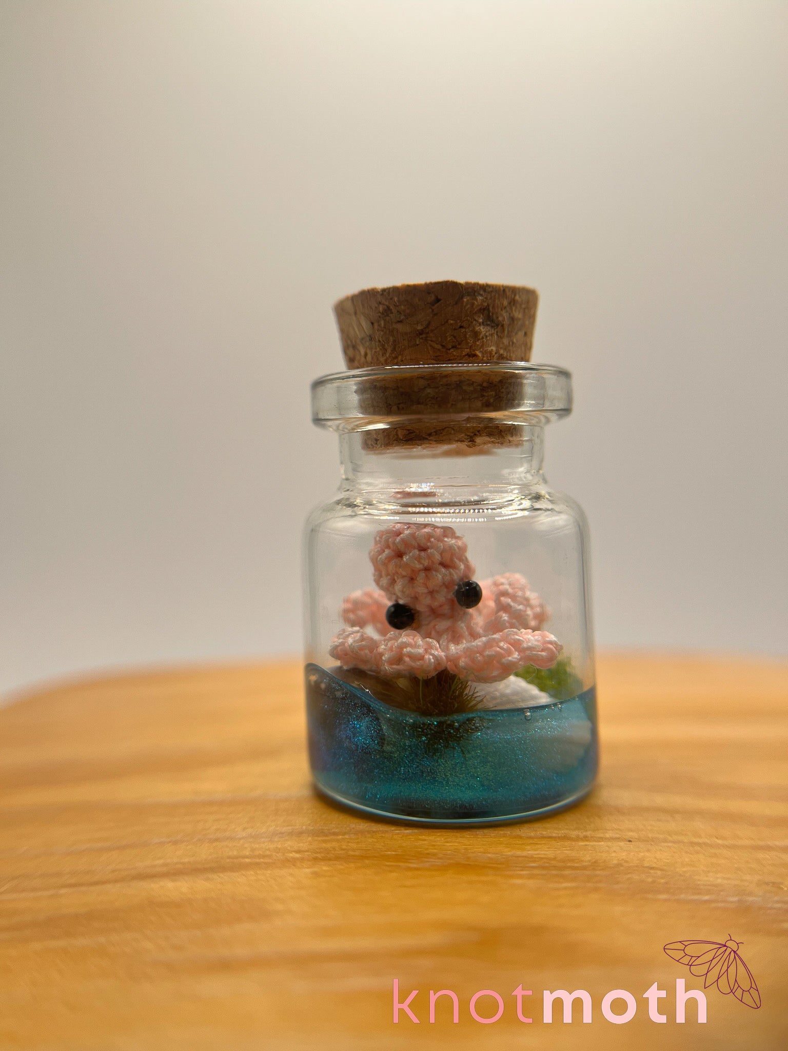 Perfect for gifting or keeping, this charming handmade micro crochet glow-in-the-dark octopus trinket jar is sure to make your home just a little bit cuter! Stitched with a 0.5 mm crochet hook and glow thread, the tiny octopus rests in a protective glass jar decorated with crystal chips, seashells, moss, fake grass, and dyed resin that lights up under UV.