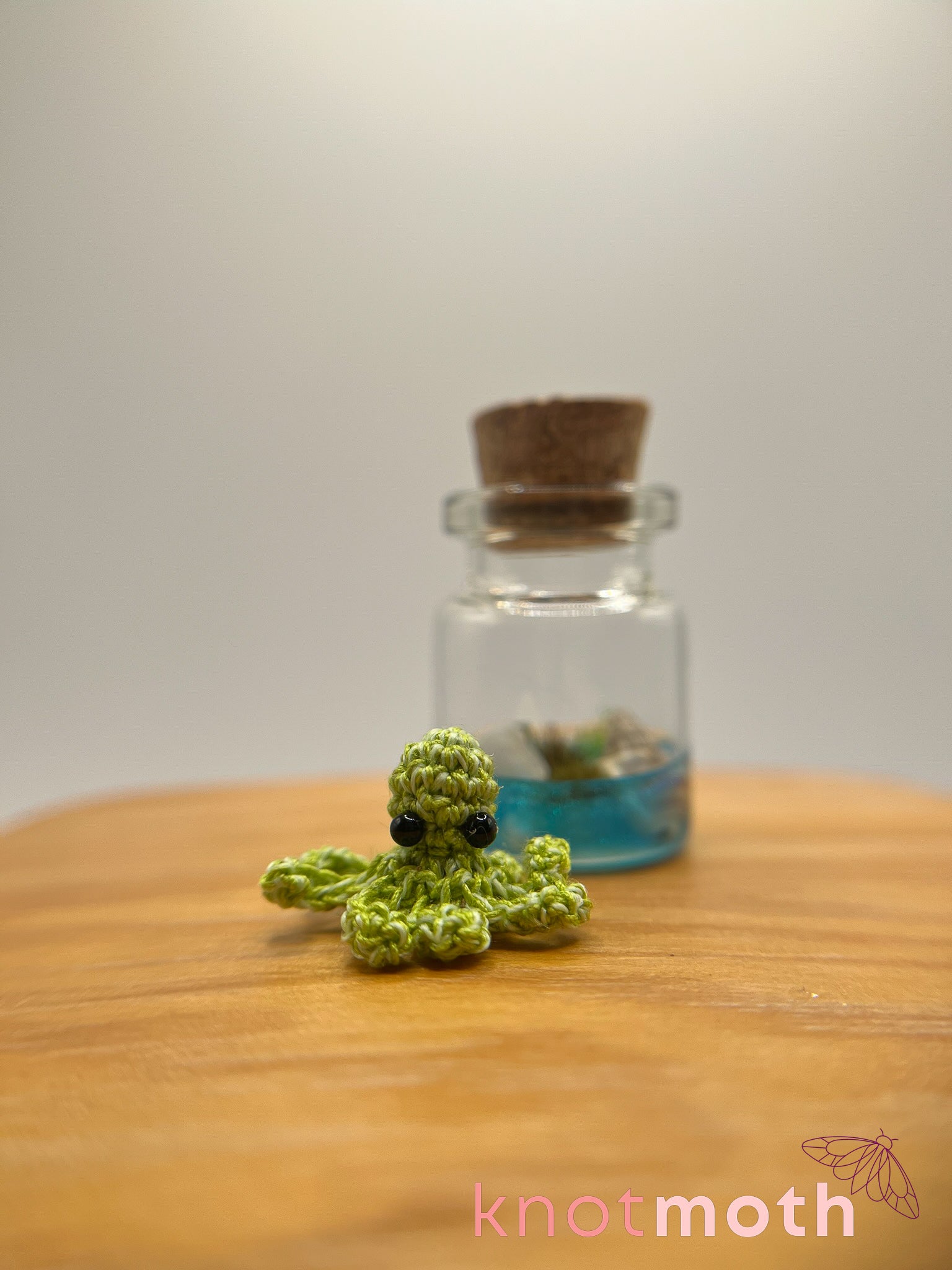 Perfect for gifting or keeping, this charming handmade micro crochet glow-in-the-dark octopus trinket jar is sure to make your home just a little bit cuter! Stitched with a 0.5 mm crochet hook and glow thread, the tiny octopus rests in a protective glass jar decorated with crystal chips, seashells, moss, fake grass, and dyed resin that lights up under UV.