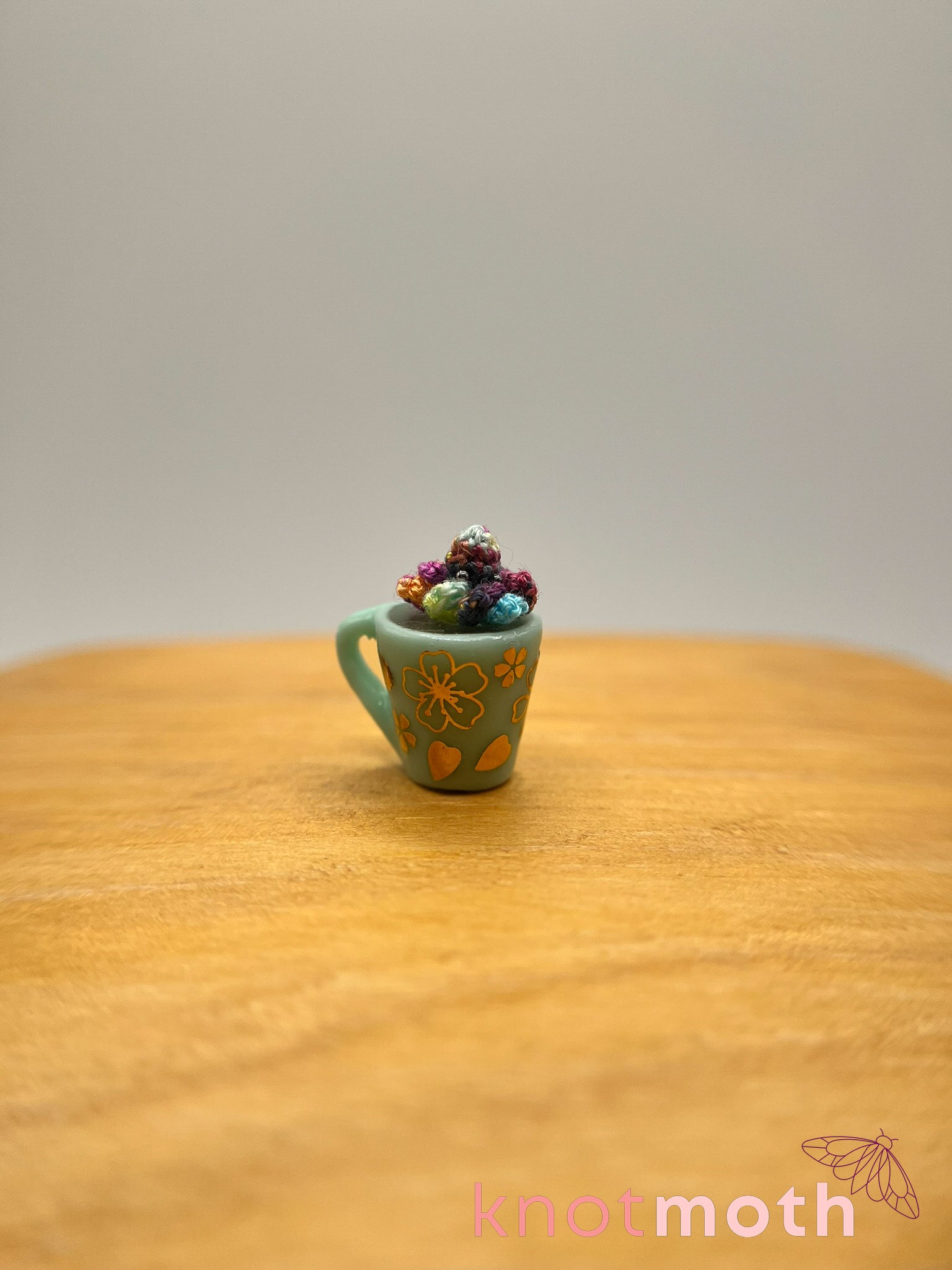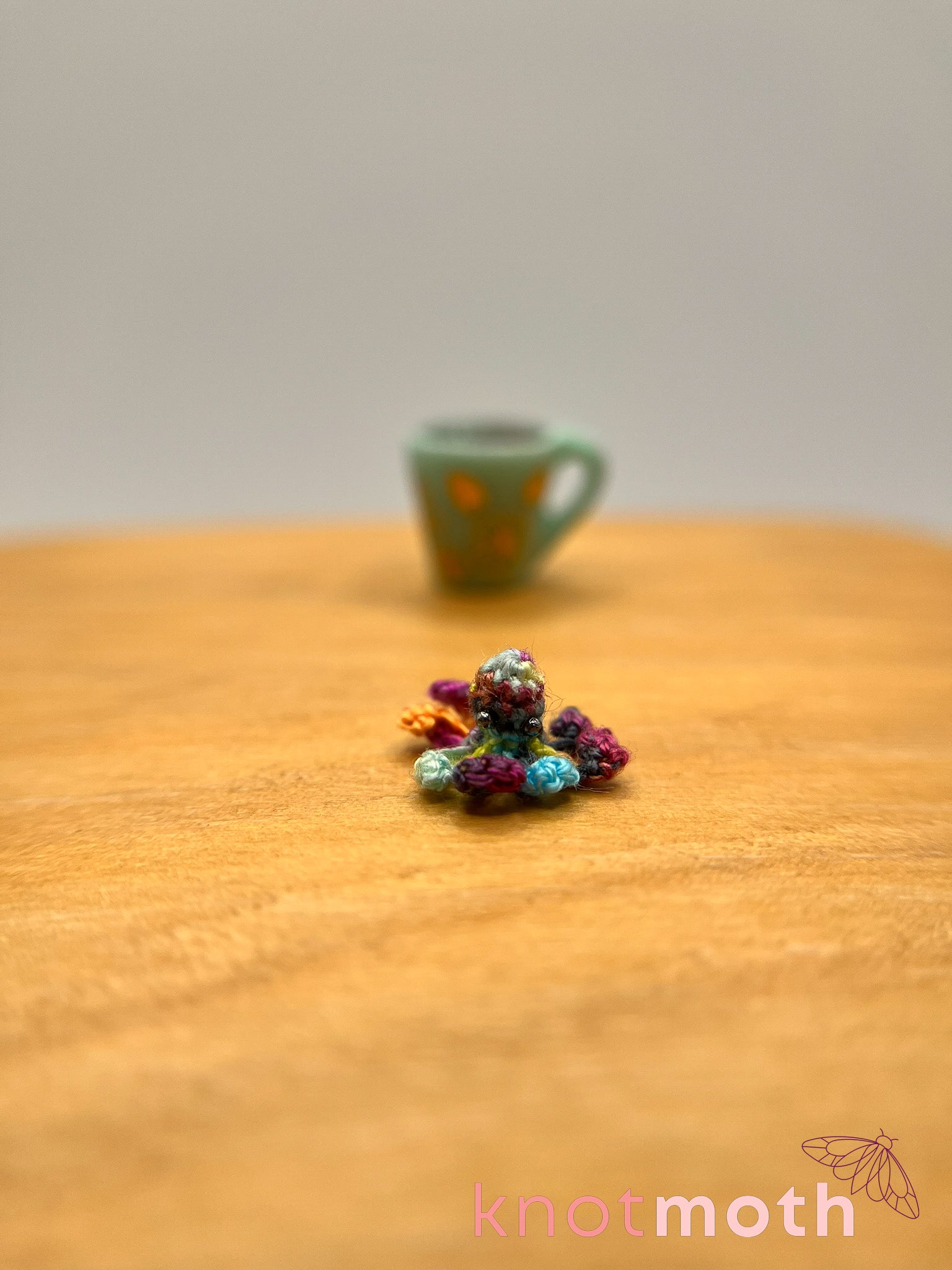 This micro-crochet octopus mug is the perfect handmade trinket for anyone who loves miniature fiber art! Meticulously stitched with hand-dyed thread and a 0.5 mm crochet hook, you'll be amazed and charmed by the intricacy and whimsy of this piece.