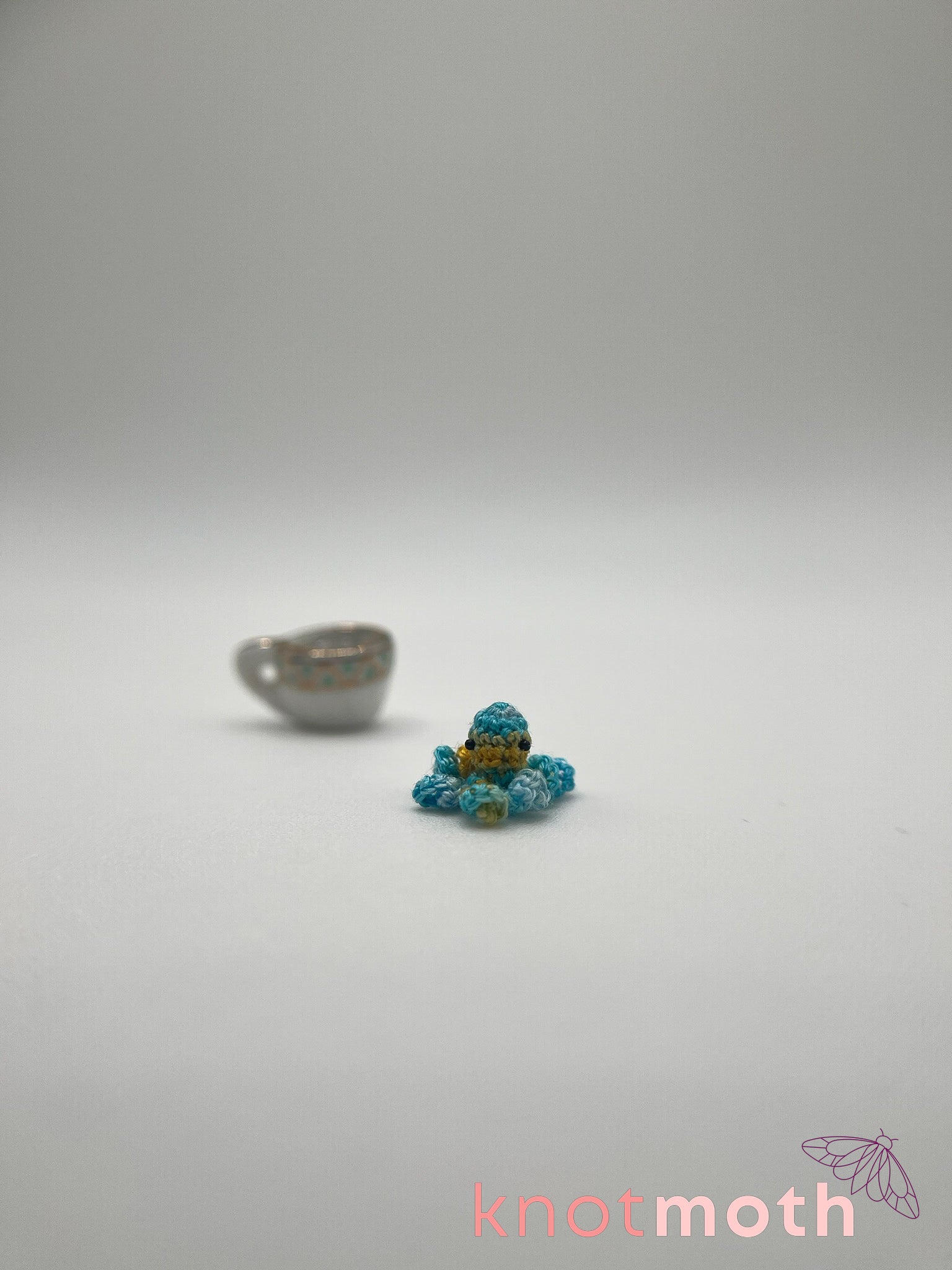 This micro-crochet octopus teacup is the perfect handmade trinket for anyone who loves miniature fiber art! Meticulously stitched with hand-dyed thread and a 0.5 mm crochet hook, you'll be amazed and charmed by the intricacy and whimsy of this piece.