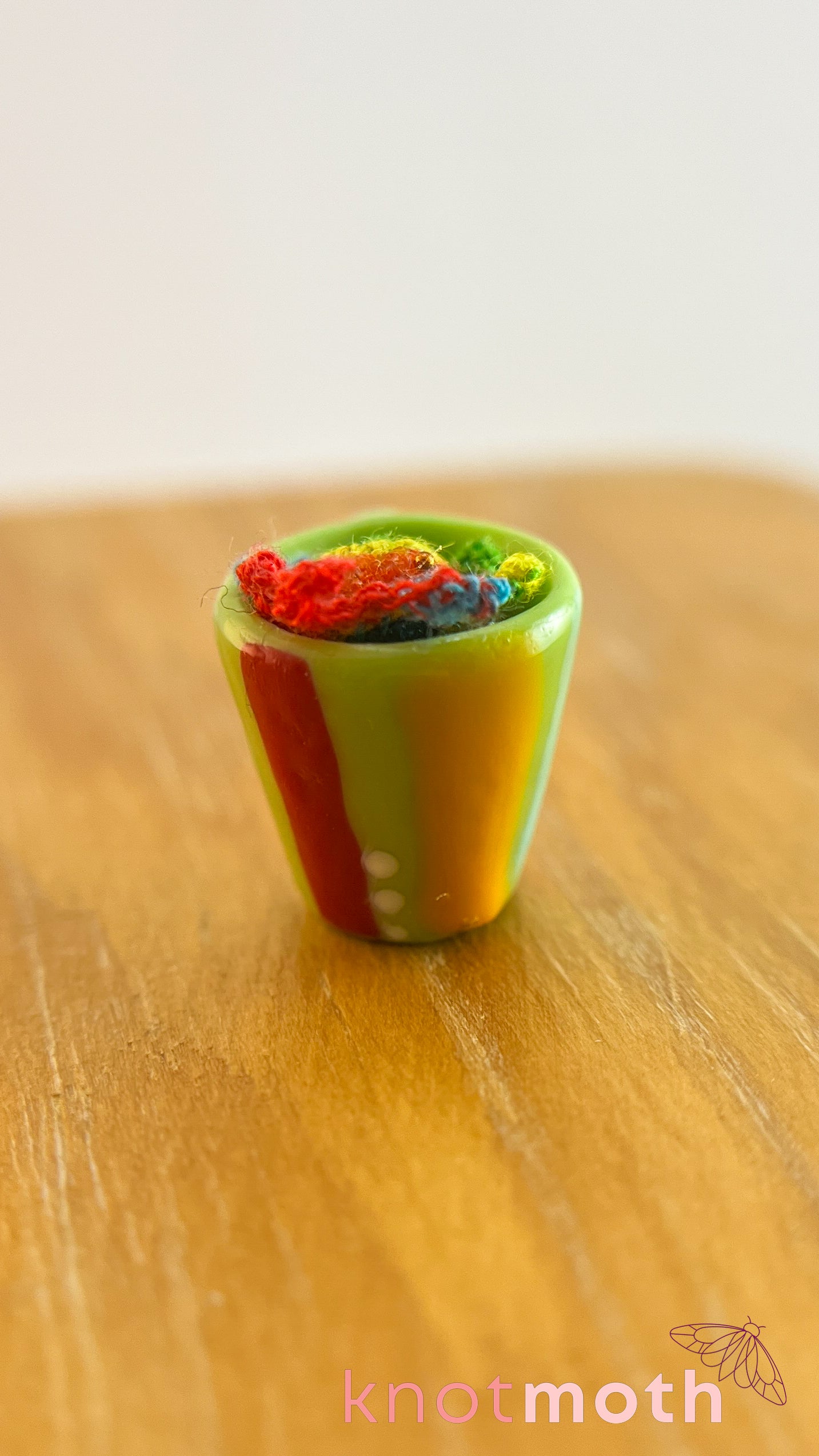 Cotton thread, micro beads, magnets, plastic mug, resin glue, crystal chips