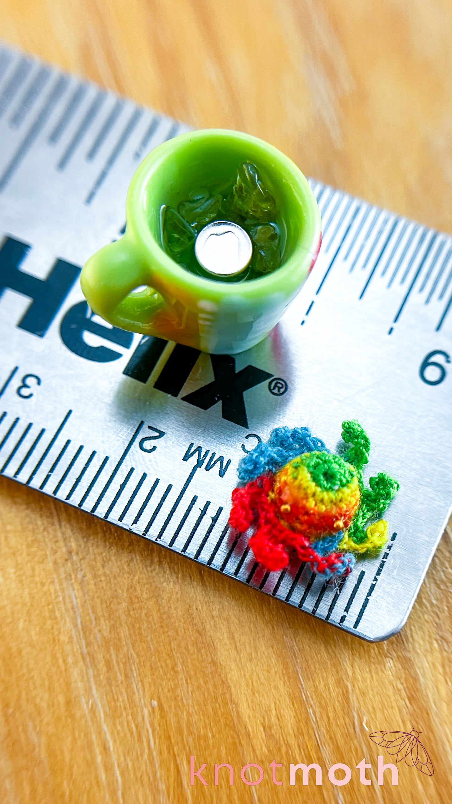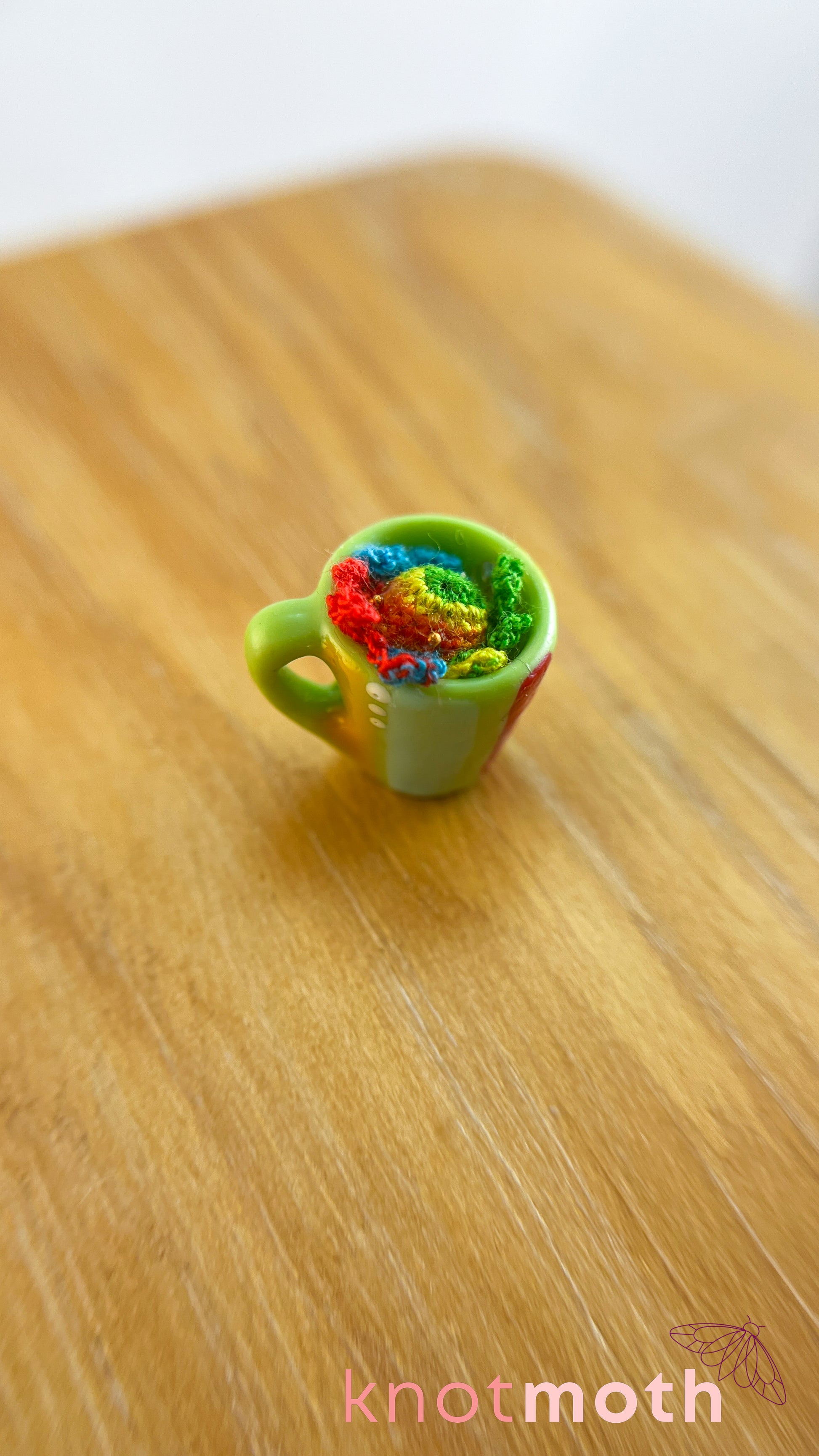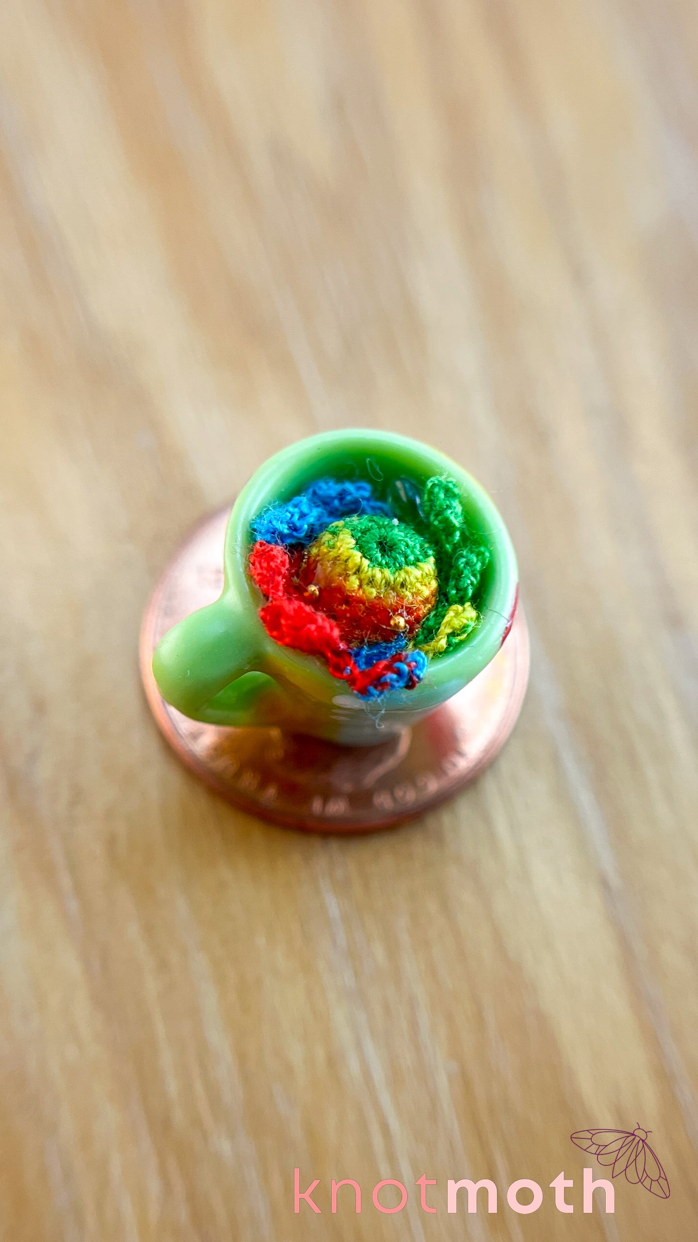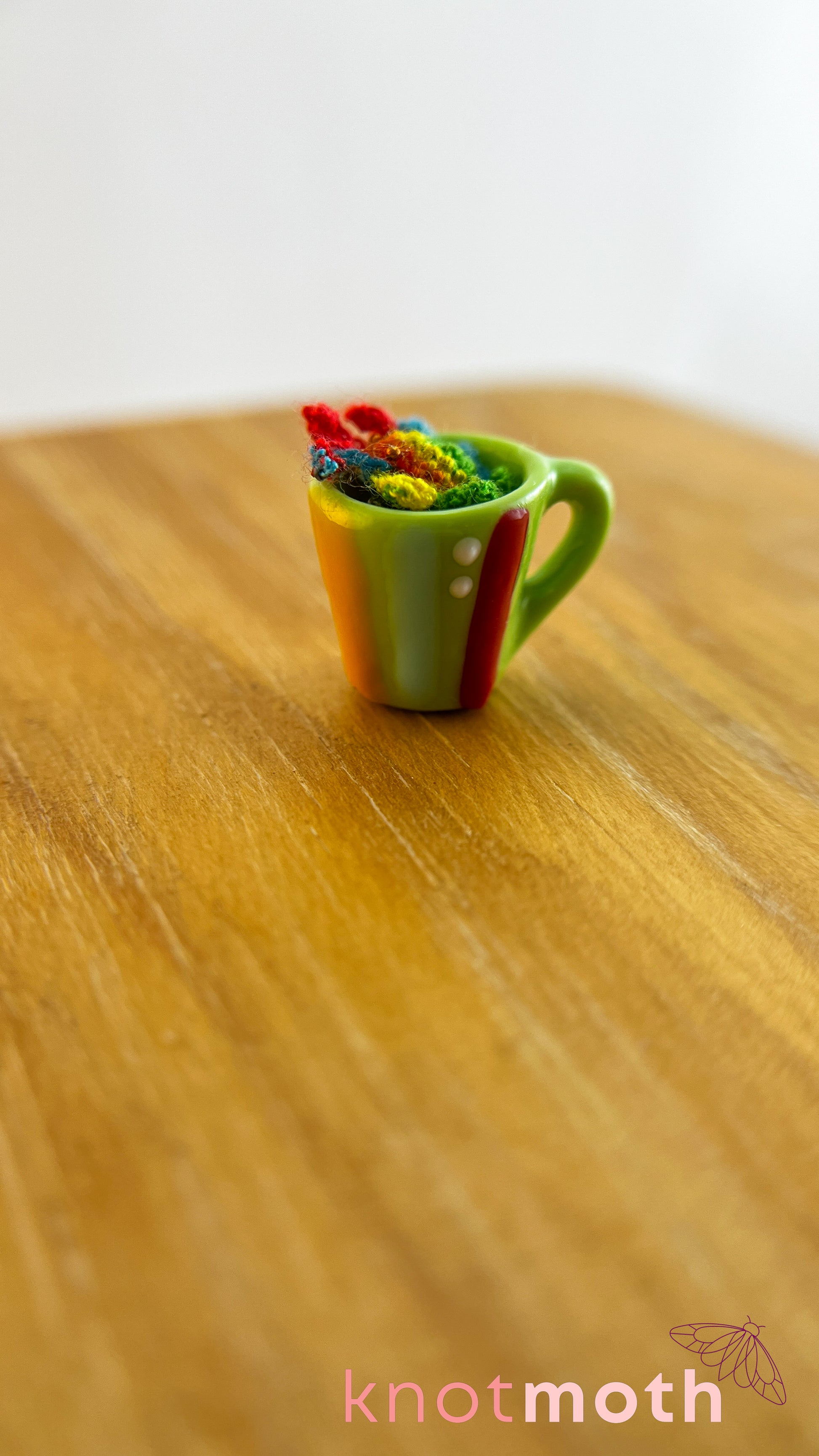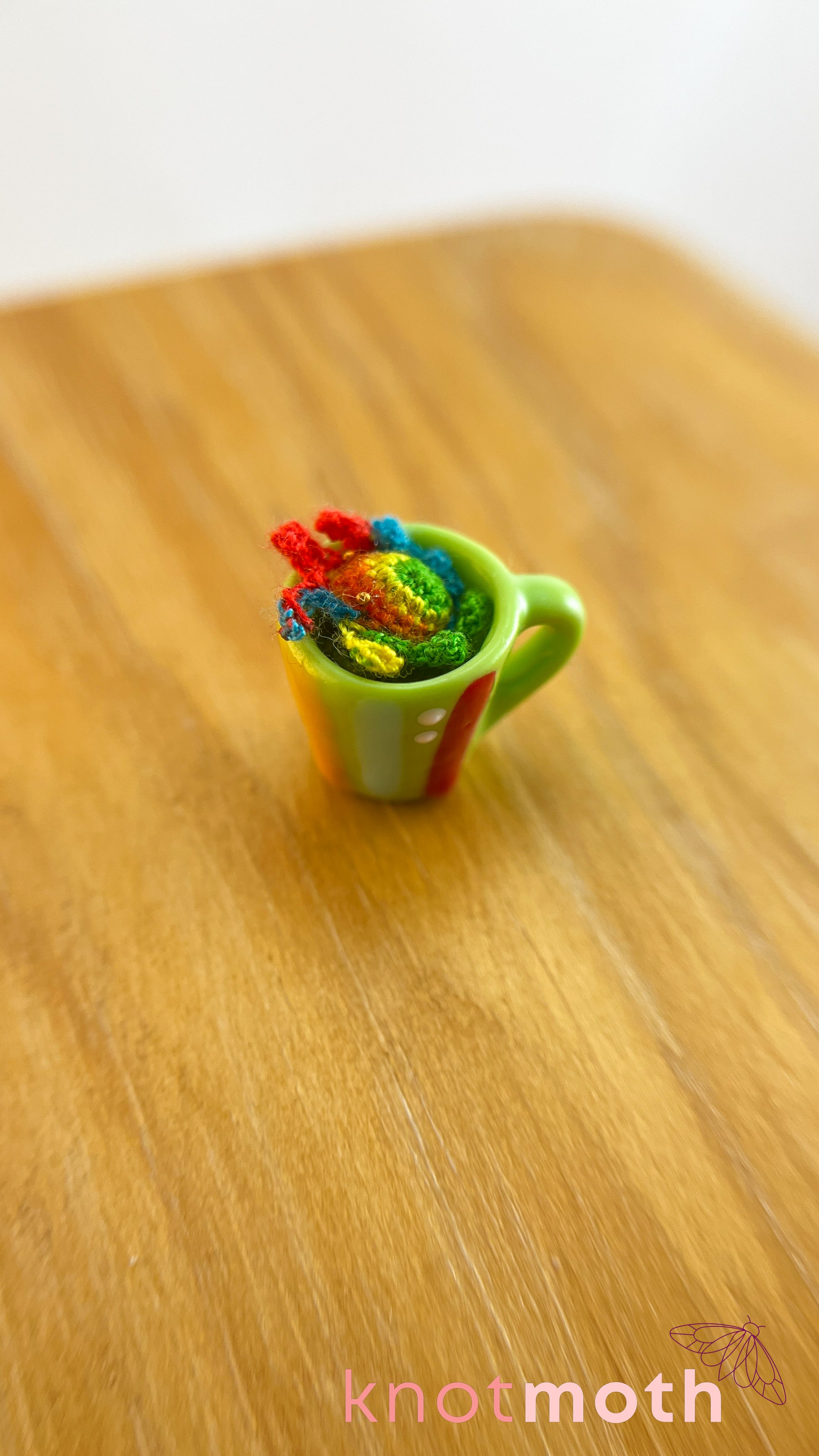 This dainty and intricately detailed removable micro crochet plushie with a matching hand-painted mug is the perfect accessory to show off your love of handmade miniature fiber art!