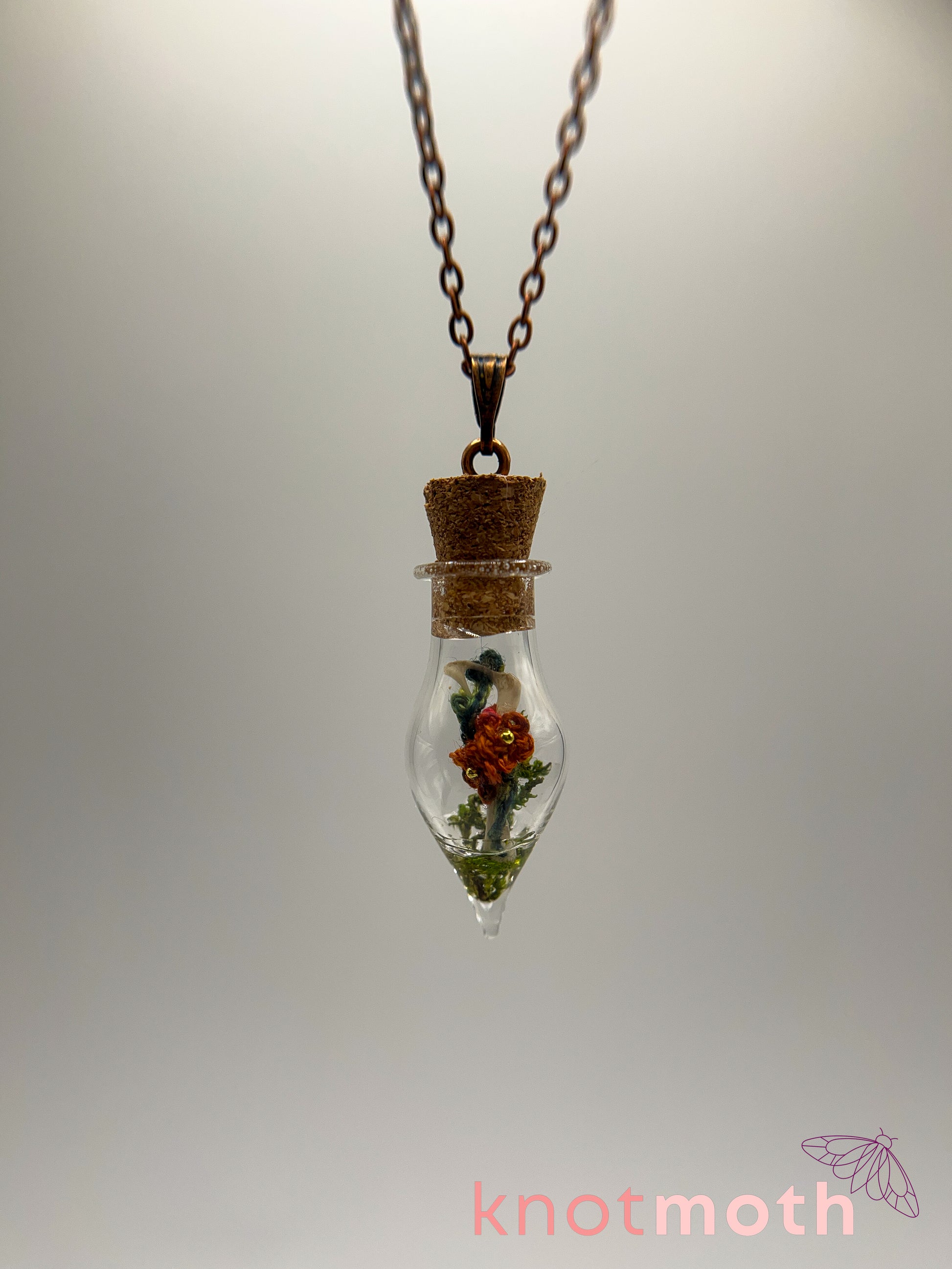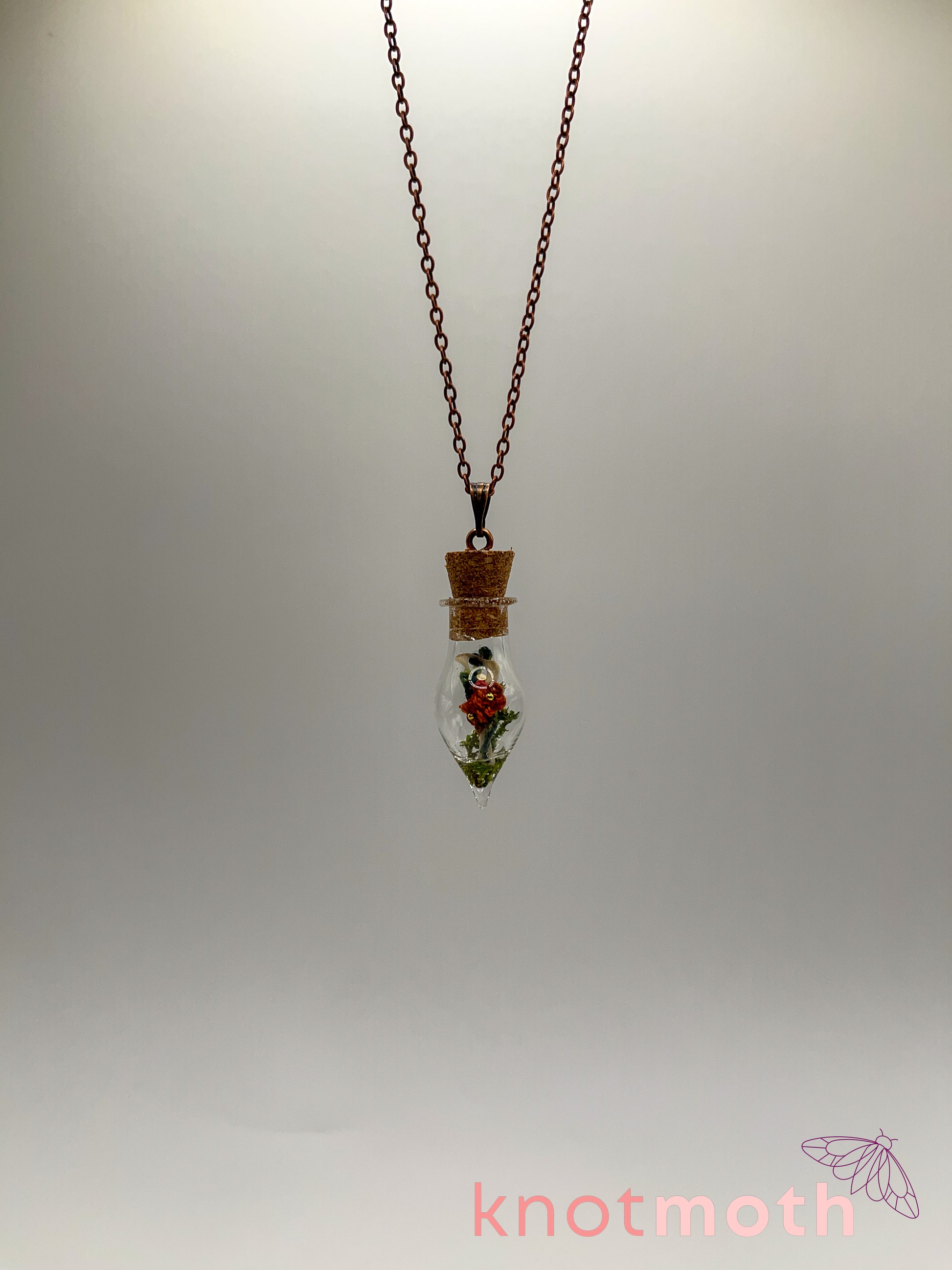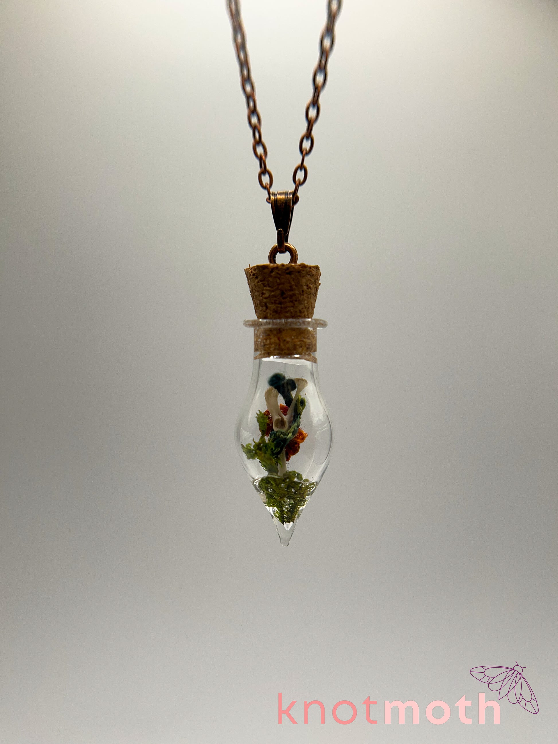 bone dissected from owl pellets, thread, moss, resin glue, zinc alloy metal necklace, metal loop, glass jar with cork