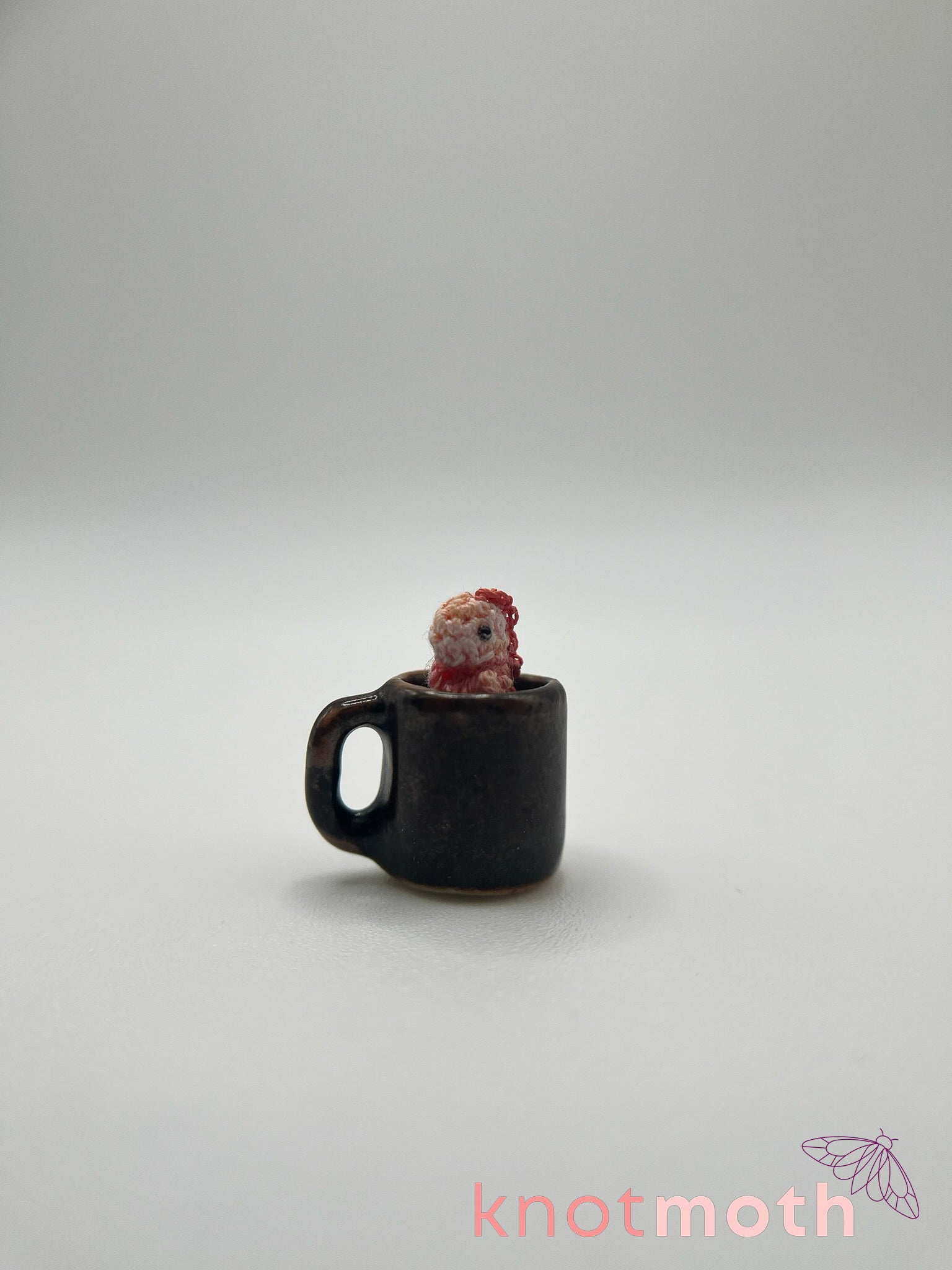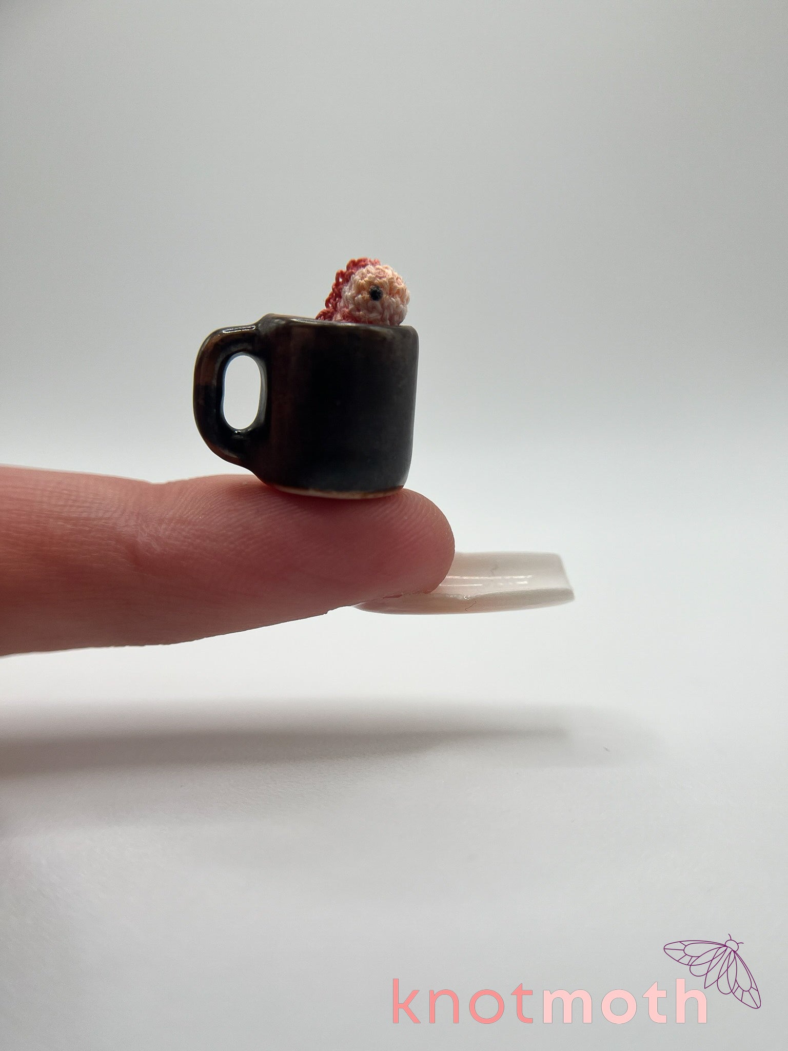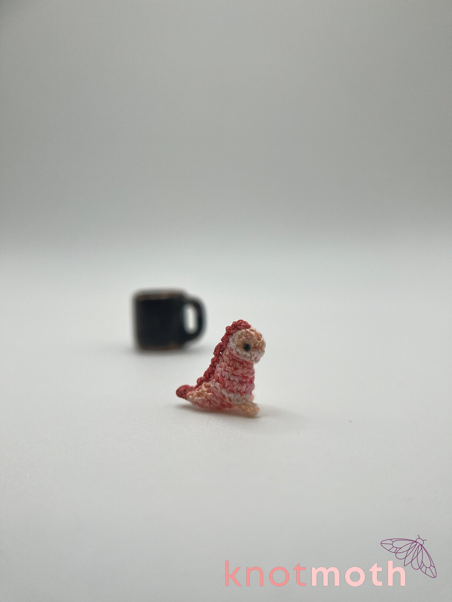 This cute tea-themed micro crochet tea-rex mug was made with a 0.5 mm crochet hook and hand-dyed thread and magnetically snaps to a miniature ceramic mug.